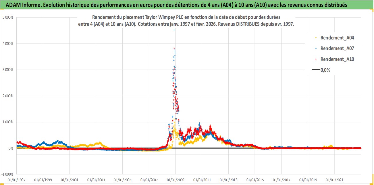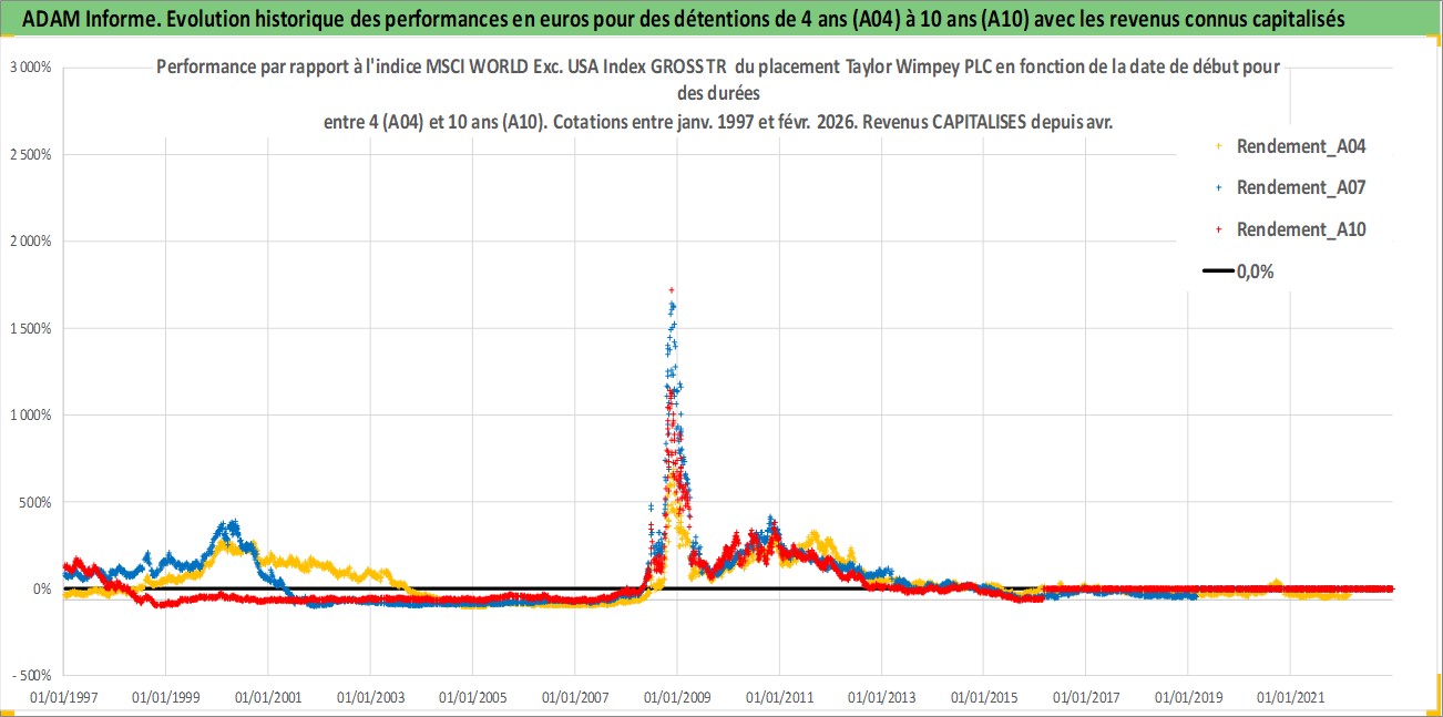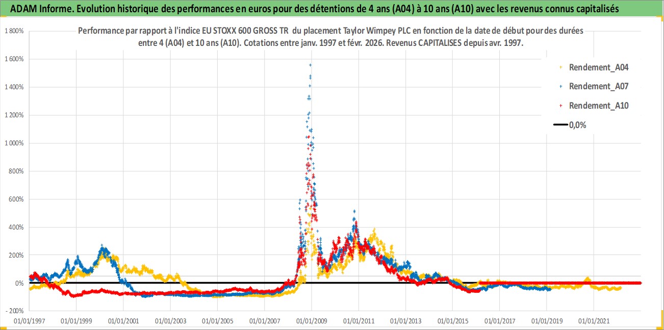 Site dédié aux investisseursPage dédiée sur site financeAnalyse des valorisations hebdomadaires de l'action Taylor Wimpey PLC. Cet actif est cote en GBX. Les valorisations sont en contrevaleur EURO et couvrent les semaines 1997W01 a 2026W09. Les revenus de cet actif financier sont pris en compte depuis la semaine 1997W15. La note globale ESG de cet actif est estimee a 15.0 (apres rebasage entre 0 et 20).