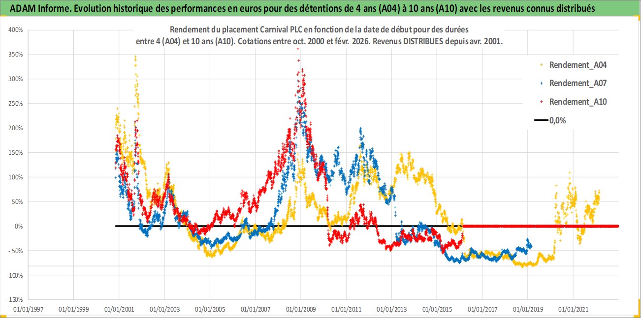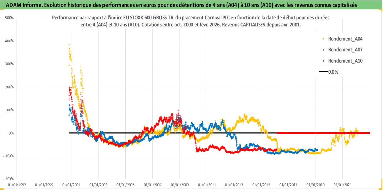 Site dédié aux investisseursPage dédiée sur site financeAnalyse des valorisations hebdomadaires de l'action Carnival PLC. Cet actif est cote en GBX. Les valorisations sont en contrevaleur EURO et couvrent les semaines 2000W43 a 2026W09. Les revenus de cet actif financier sont pris en compte depuis la semaine 2001W14. La note globale ESG de cet actif est estimee a 8.0 (apres rebasage entre 0 et 20).