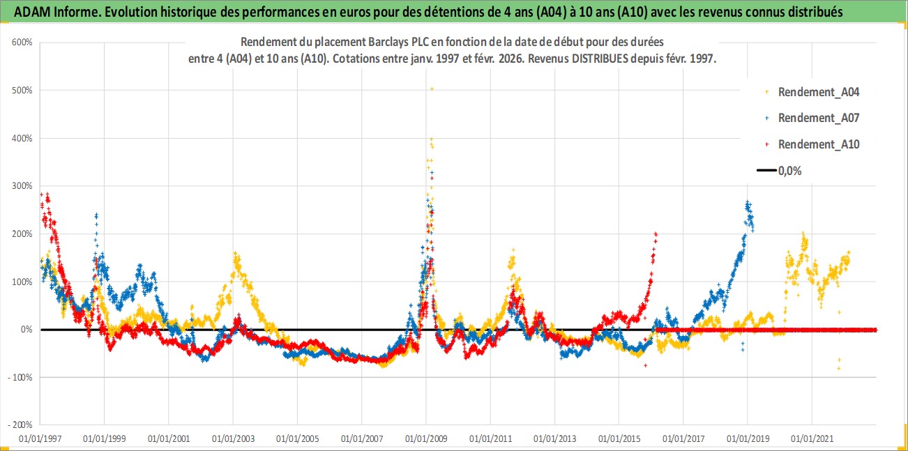 Site dédié aux investisseursPage dédiée sur site financeAnalyse des valorisations hebdomadaires de l'action Barclays PLC. Cet actif est cote en GBX. Les valorisations sont en contrevaleur EURO et couvrent les semaines 1997W01 a 2026W09. Les revenus de cet actif financier sont pris en compte depuis la semaine 1997W09. La note globale ESG de cet actif est estimee a 8.0 (apres rebasage entre 0 et 20).