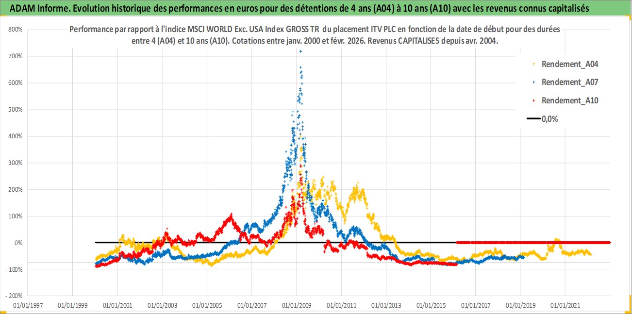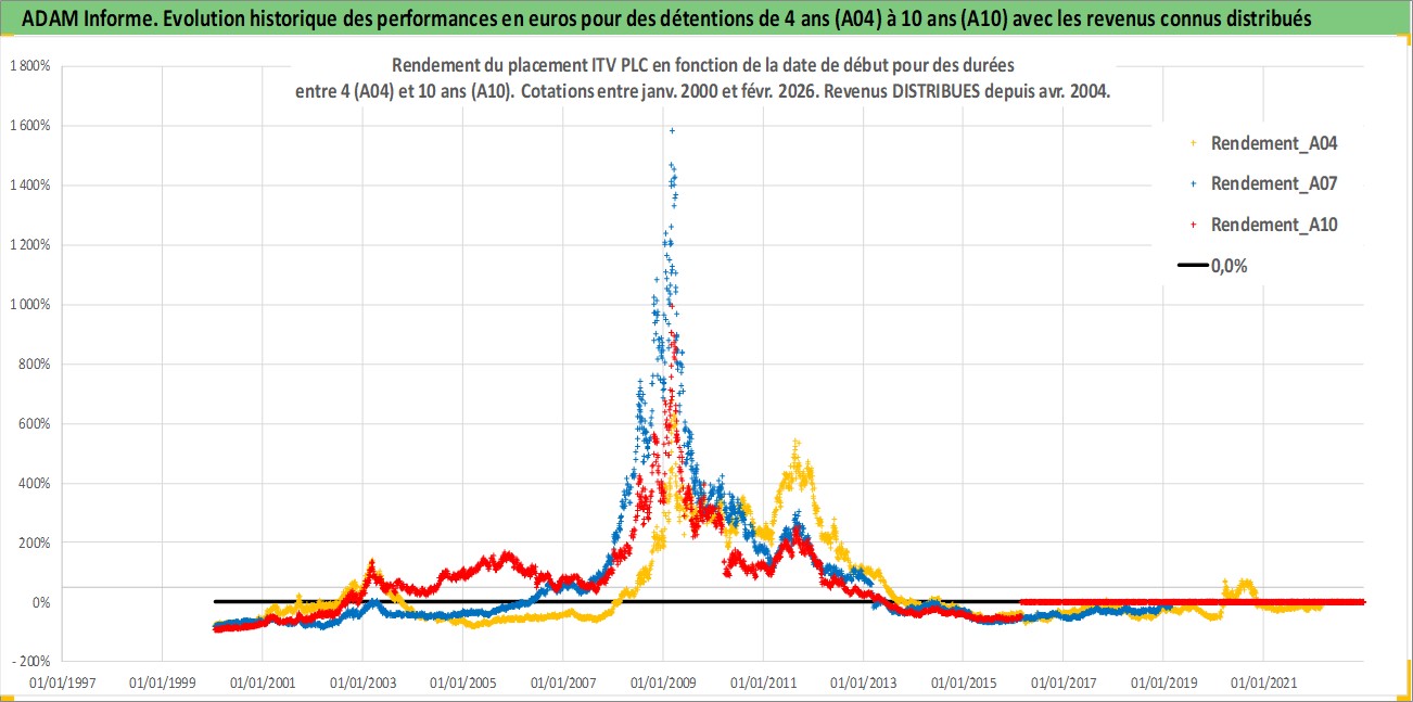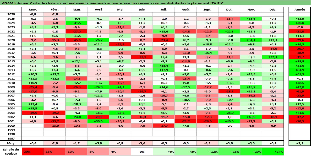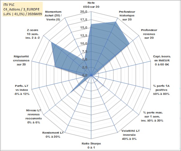 Site dédié aux investisseursPage dédiée sur site financeAnalyse des valorisations hebdomadaires de l'action ITV PLC. Cet actif est cote en GBX. Les valorisations sont en contrevaleur EURO et couvrent les semaines 2000W01 a 2026W09. Les revenus de cet actif financier sont pris en compte depuis la semaine 2004W17. La note globale ESG de cet actif est estimee a 16.0 (apres rebasage entre 0 et 20).