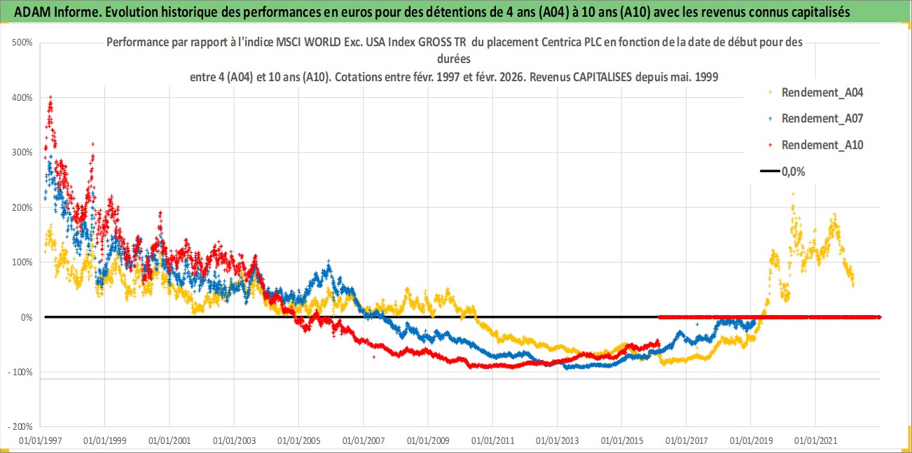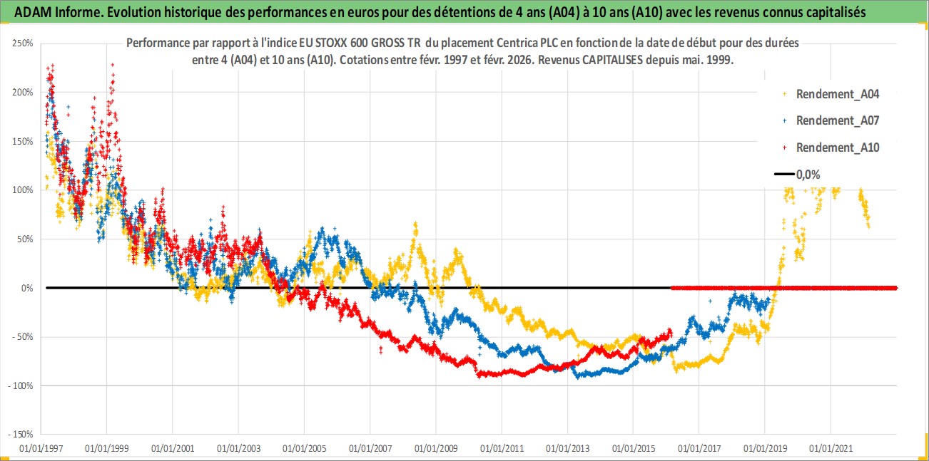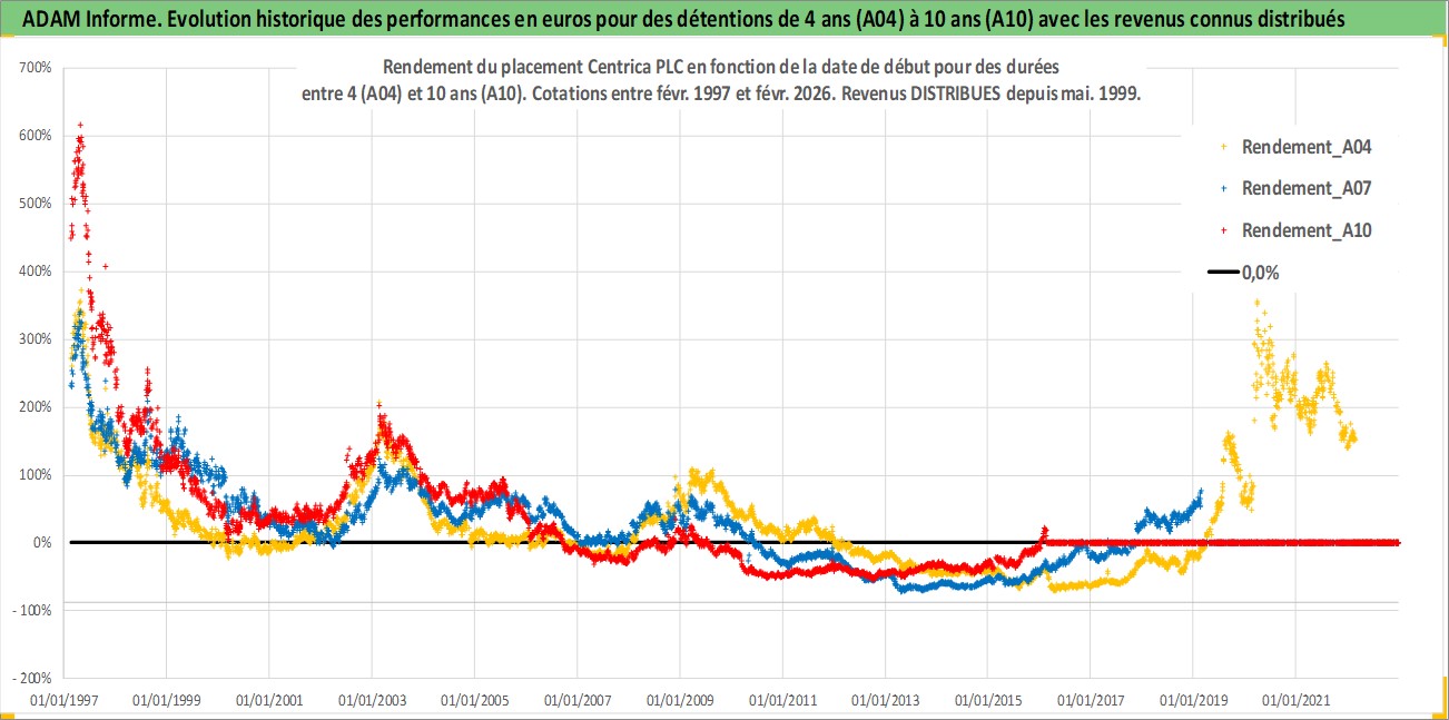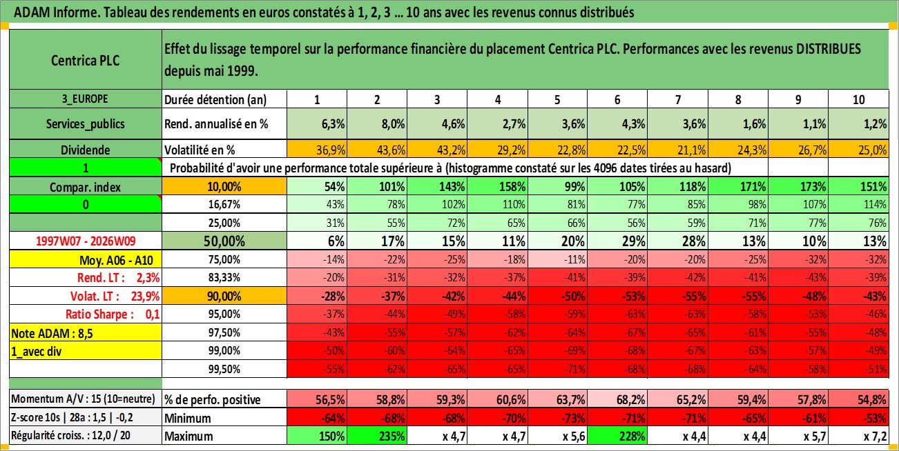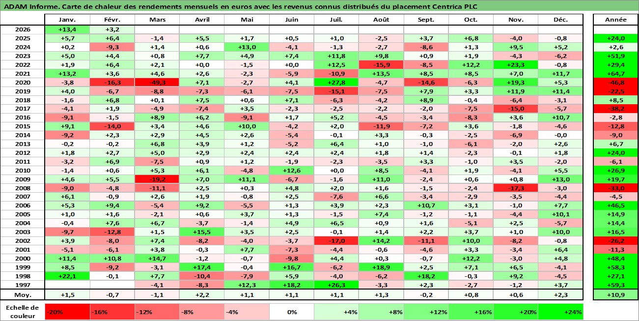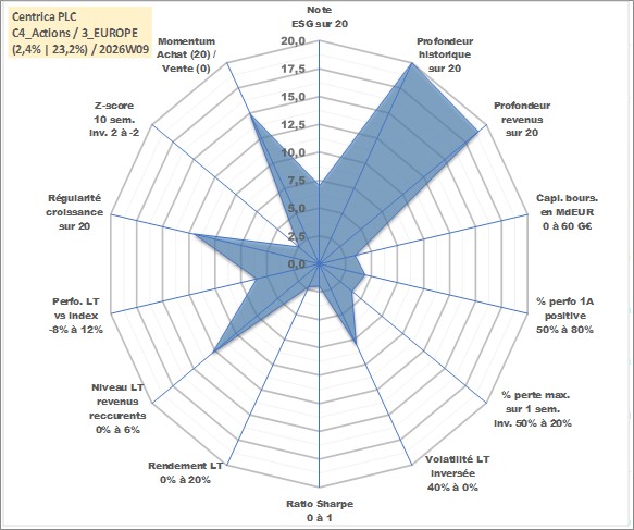 Site dédié aux investisseursPage dédiée sur site financeAnalyse des valorisations hebdomadaires de l'action Centrica PLC. Cet actif est cote en GBX. Les valorisations sont en contrevaleur EURO et couvrent les semaines 1997W07 a 2026W09. Les revenus de cet actif financier sont pris en compte depuis la semaine 1999W19. La note globale ESG de cet actif est estimee a 7.0 (apres rebasage entre 0 et 20).