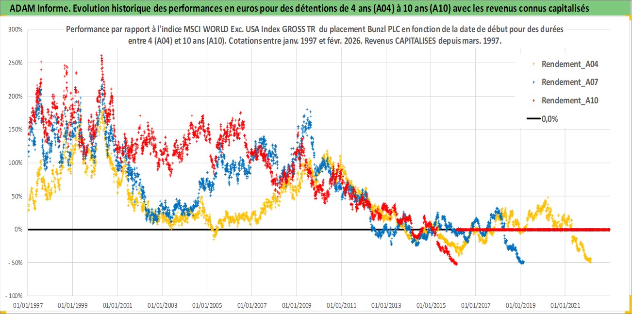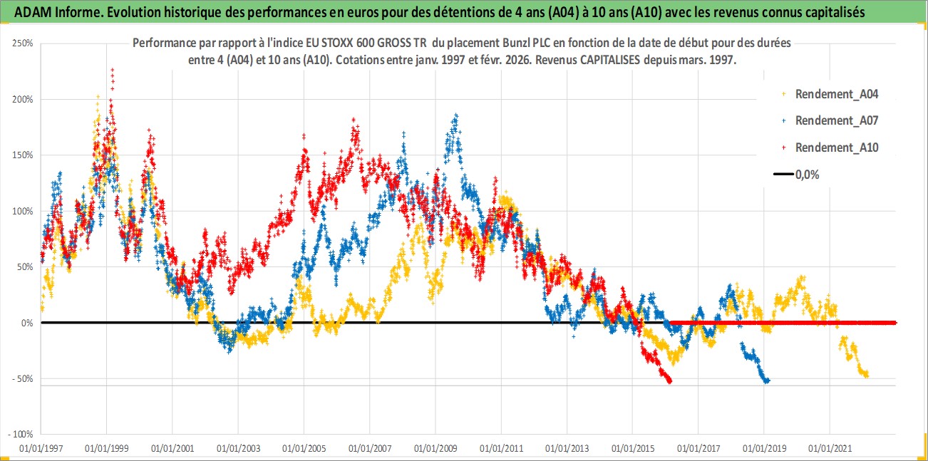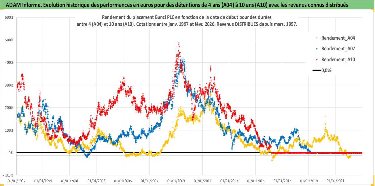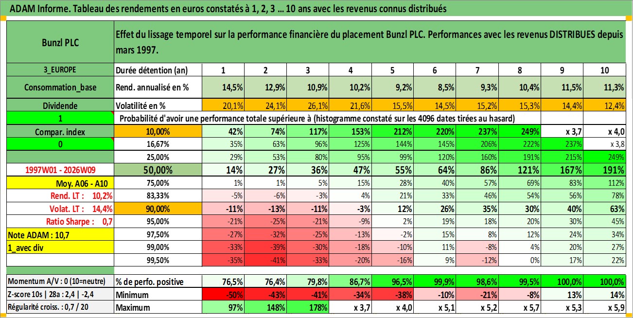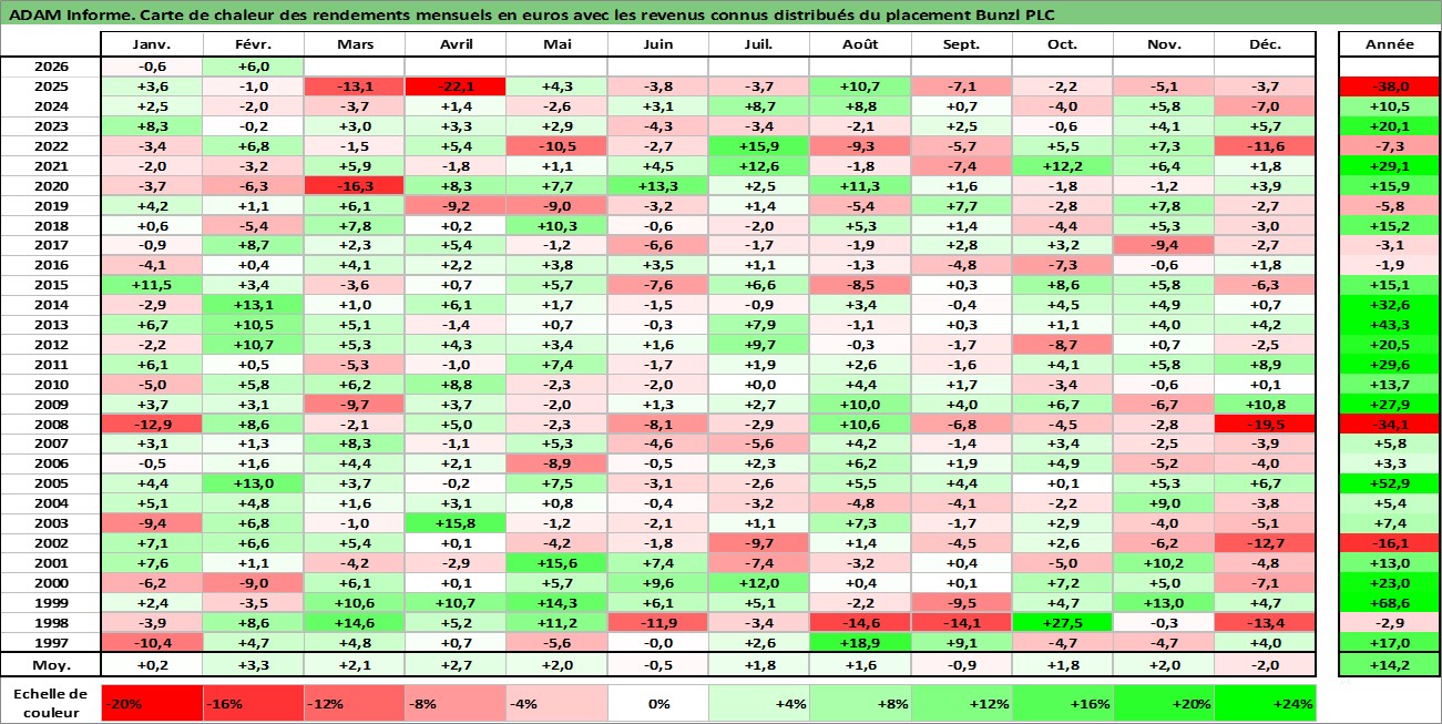 Site dédié aux investisseursPage dédiée sur site financeAnalyse des valorisations hebdomadaires de l'action Bunzl PLC. Cet actif est cote en GBX. Les valorisations sont en contrevaleur EURO et couvrent les semaines 1997W01 a 2026W09. Les revenus de cet actif financier sont pris en compte depuis la semaine 1997W13. La note globale ESG de cet actif est estimee a 13.0 (apres rebasage entre 0 et 20).