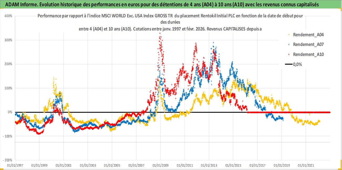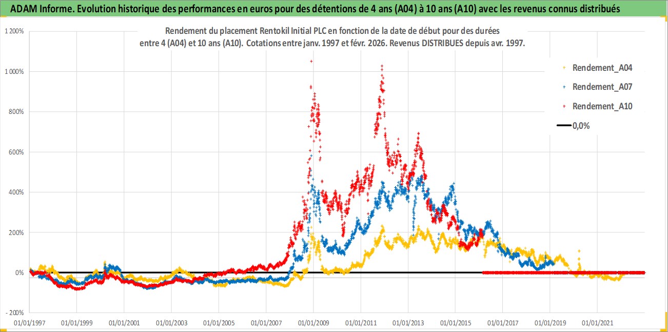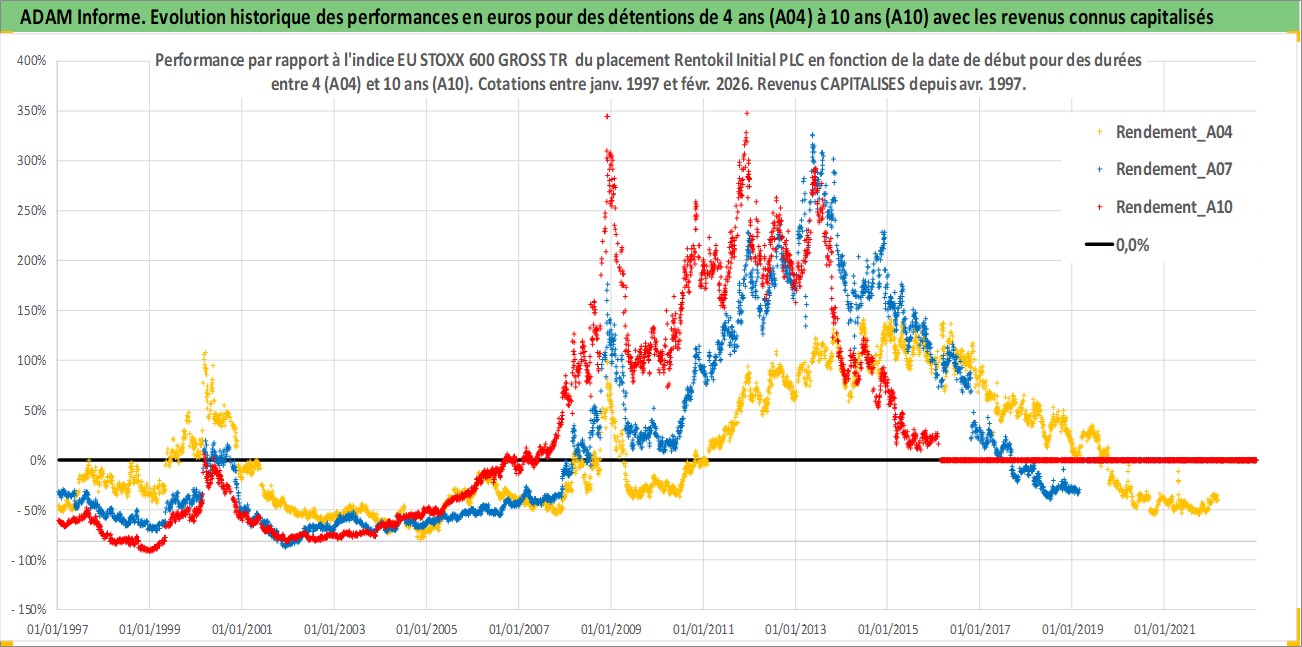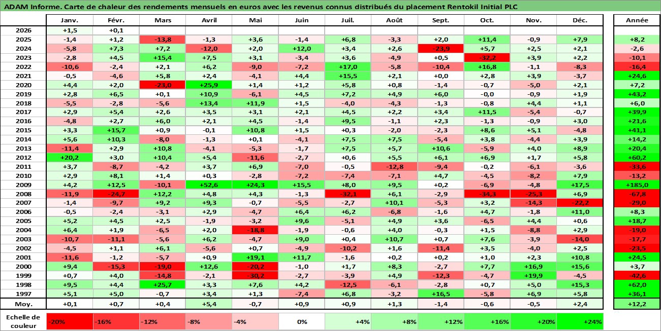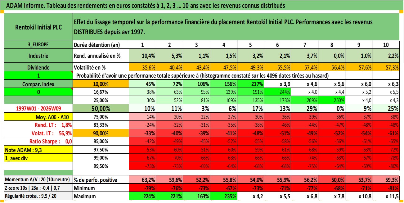 Site dédié aux investisseursPage dédiée sur site financeAnalyse des valorisations hebdomadaires de l'action Rentokil Initial PLC. Cet actif est cote en GBX. Les valorisations sont en contrevaleur EURO et couvrent les semaines 1997W01 a 2026W09. Les revenus de cet actif financier sont pris en compte depuis la semaine 1997W16. La note globale ESG de cet actif est estimee a 13.0 (apres rebasage entre 0 et 20).