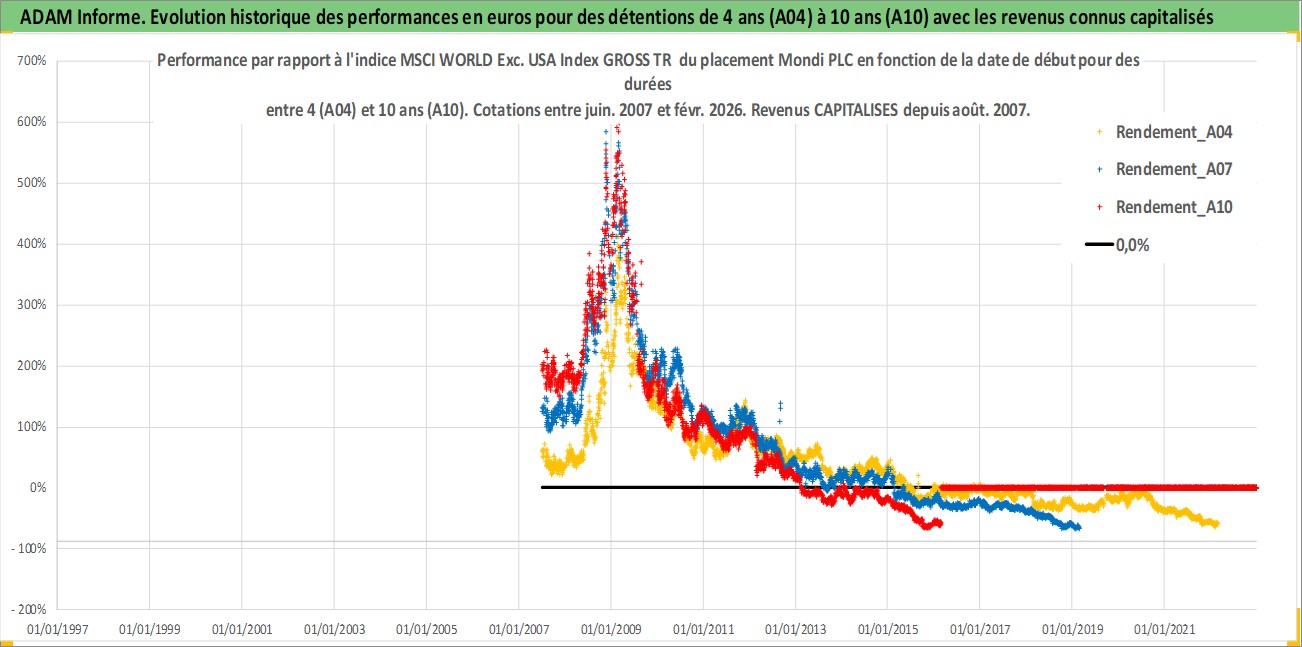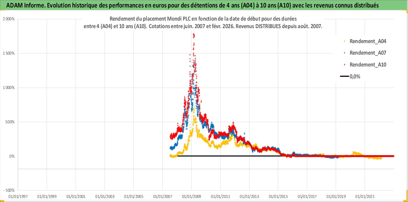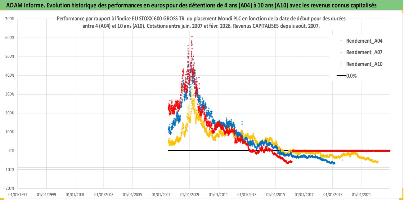 Site dédié aux investisseursPage dédiée sur site financeAnalyse des valorisations hebdomadaires de l'action Mondi PLC. Cet actif est cote en GBX. Les valorisations sont en contrevaleur EURO et couvrent les semaines 2007W26 a 2026W09. Les revenus de cet actif financier sont pris en compte depuis la semaine 2007W35. La note globale ESG de cet actif est estimee a 16.0 (apres rebasage entre 0 et 20).