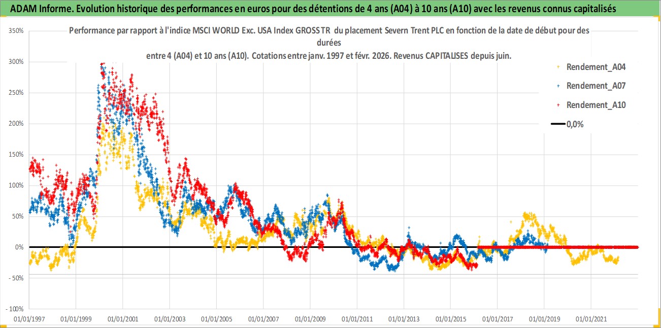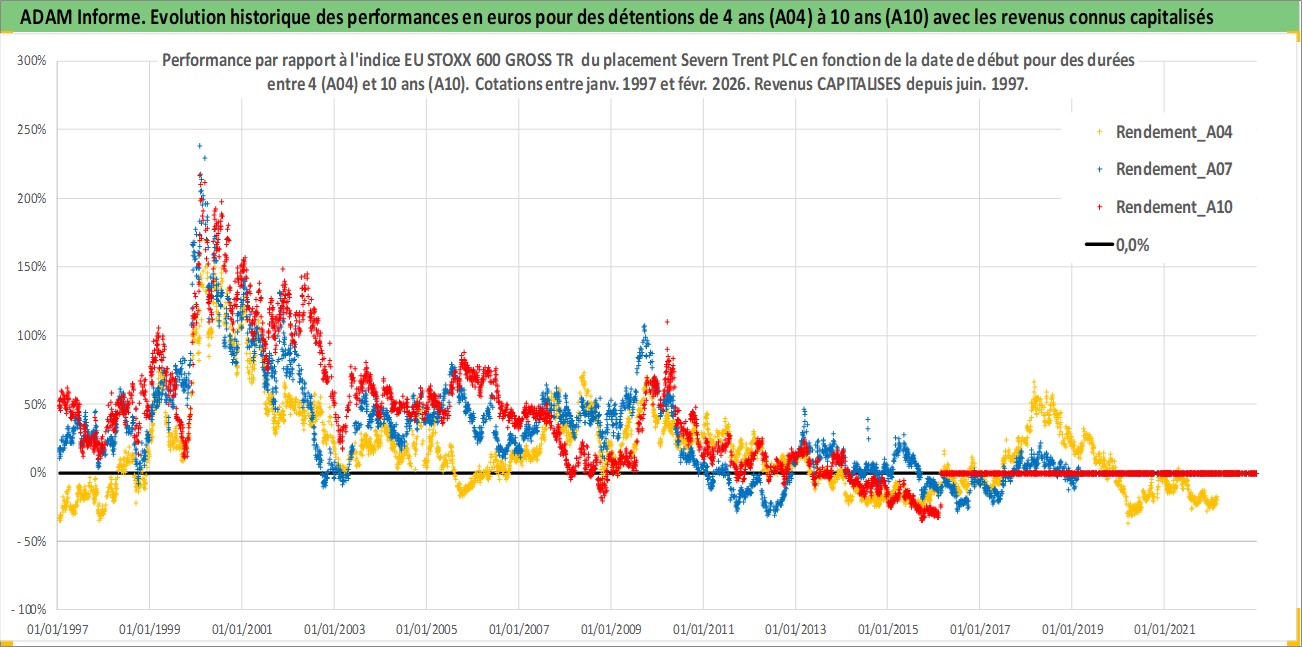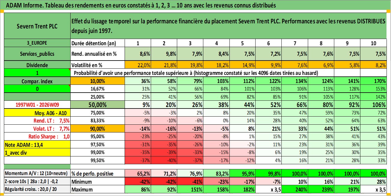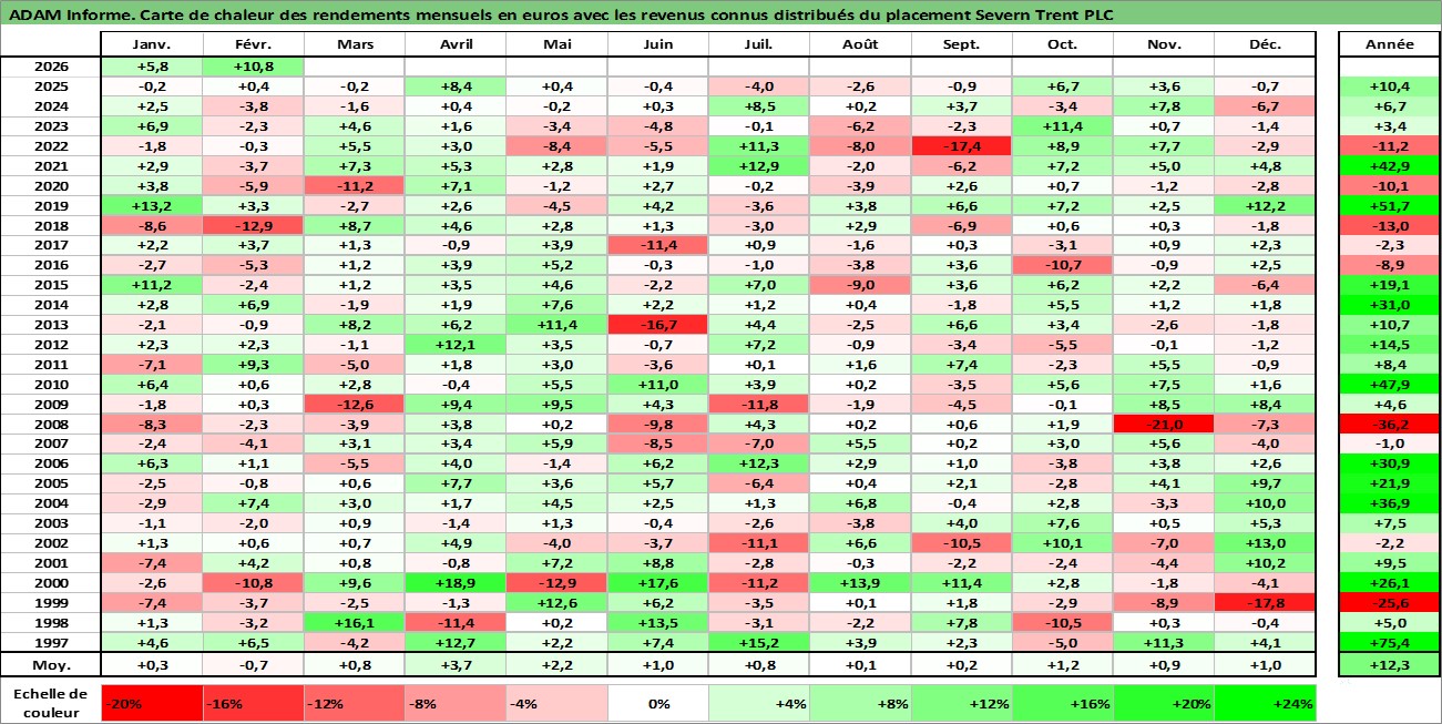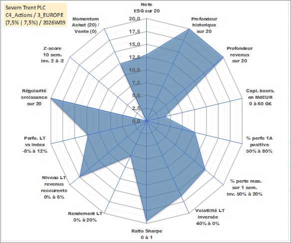 Site dédié aux investisseursPage dédiée sur site financeAnalyse des valorisations hebdomadaires de l'action Severn Trent PLC. Cet actif est cote en GBX. Les valorisations sont en contrevaleur EURO et couvrent les semaines 1997W01 a 2026W09. Les revenus de cet actif financier sont pris en compte depuis la semaine 1997W25. La note globale ESG de cet actif est estimee a 13.0 (apres rebasage entre 0 et 20).