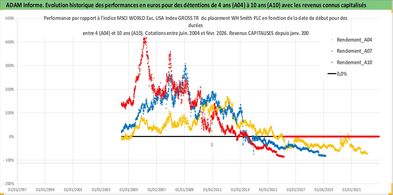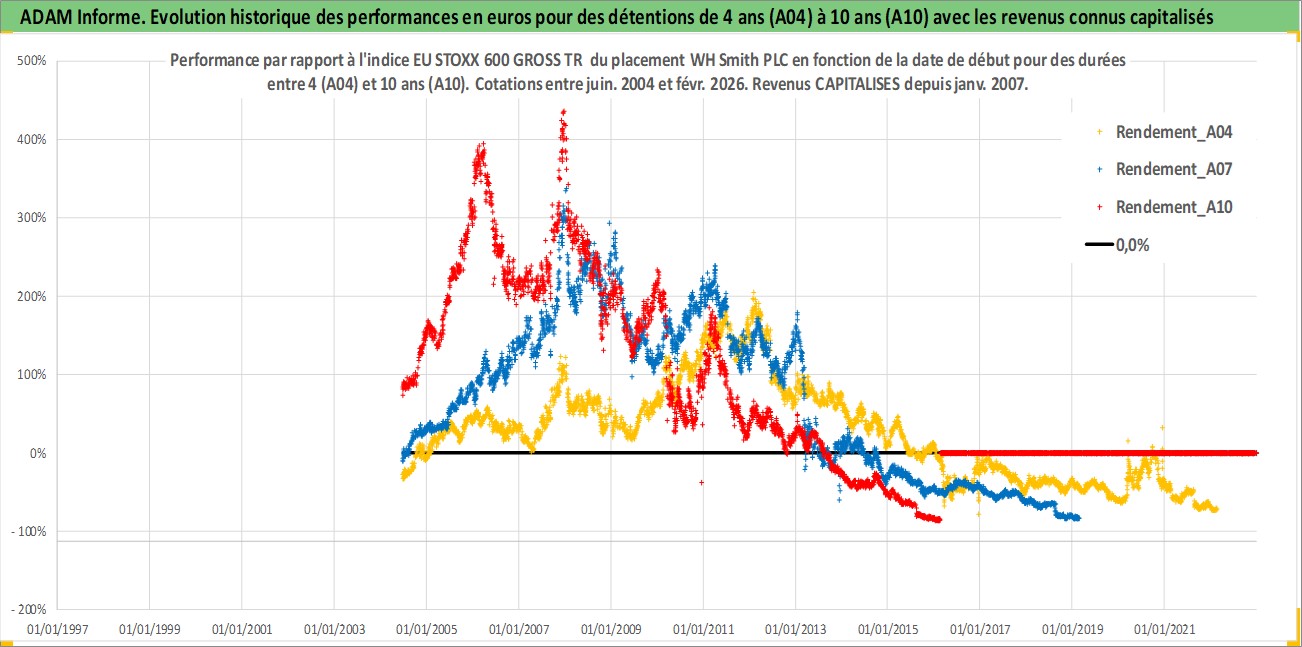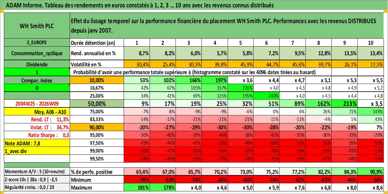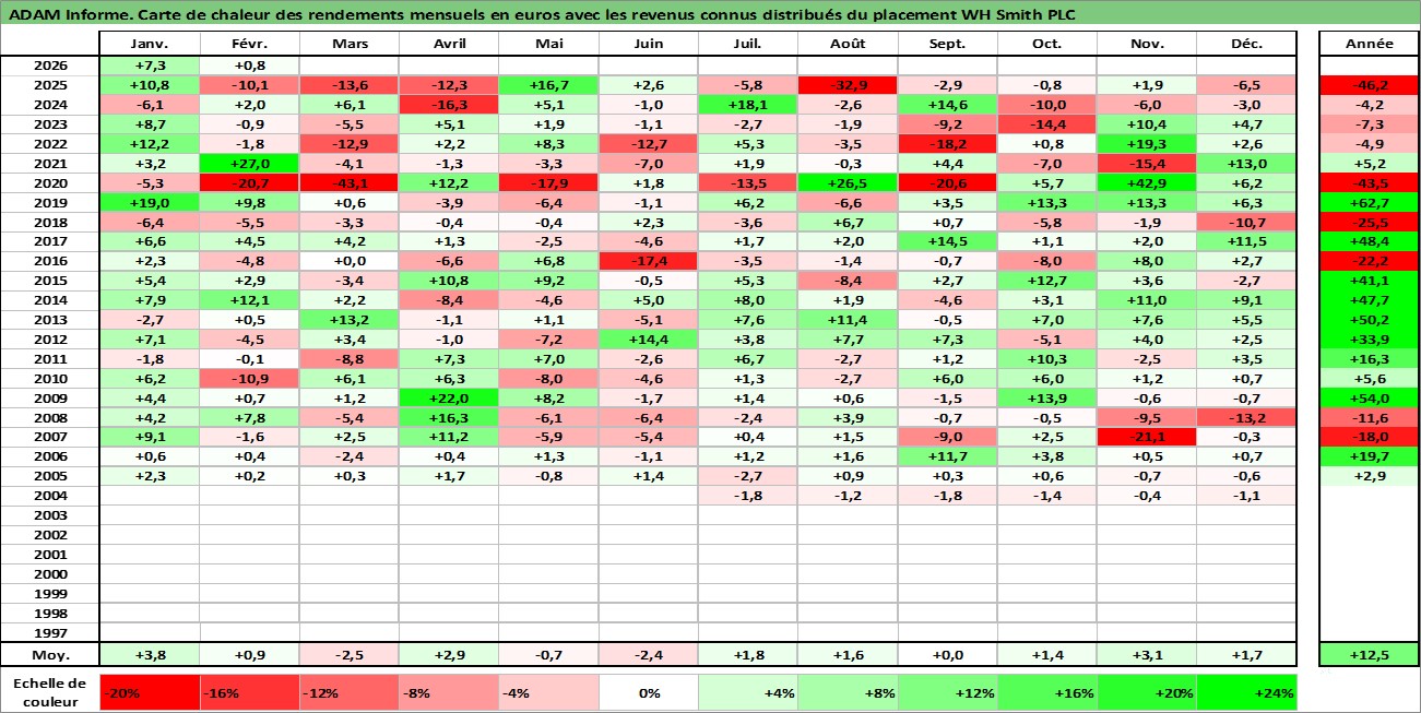 Site dédié aux investisseursPage dédiée sur site financeAnalyse des valorisations hebdomadaires de l'action WH Smith PLC. Cet actif est cote en GBX. Les valorisations sont en contrevaleur EURO et couvrent les semaines 2004W25 a 2026W09. Les revenus de cet actif financier sont pris en compte depuis la semaine 2007W01. La note ESG de cet actif n'est pas connue.