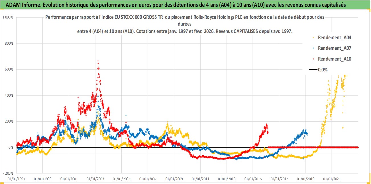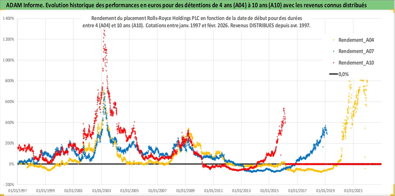 Site dédié aux investisseursPage dédiée sur site financeAnalyse des valorisations hebdomadaires de l'action Rolls-Royce Holdings PLC. Cet actif est cote en GBX. Les valorisations sont en contrevaleur EURO et couvrent les semaines 1997W01 a 2026W09. Les revenus de cet actif financier sont pris en compte depuis la semaine 1997W17. La note globale ESG de cet actif est estimee a 6.0 (apres rebasage entre 0 et 20).