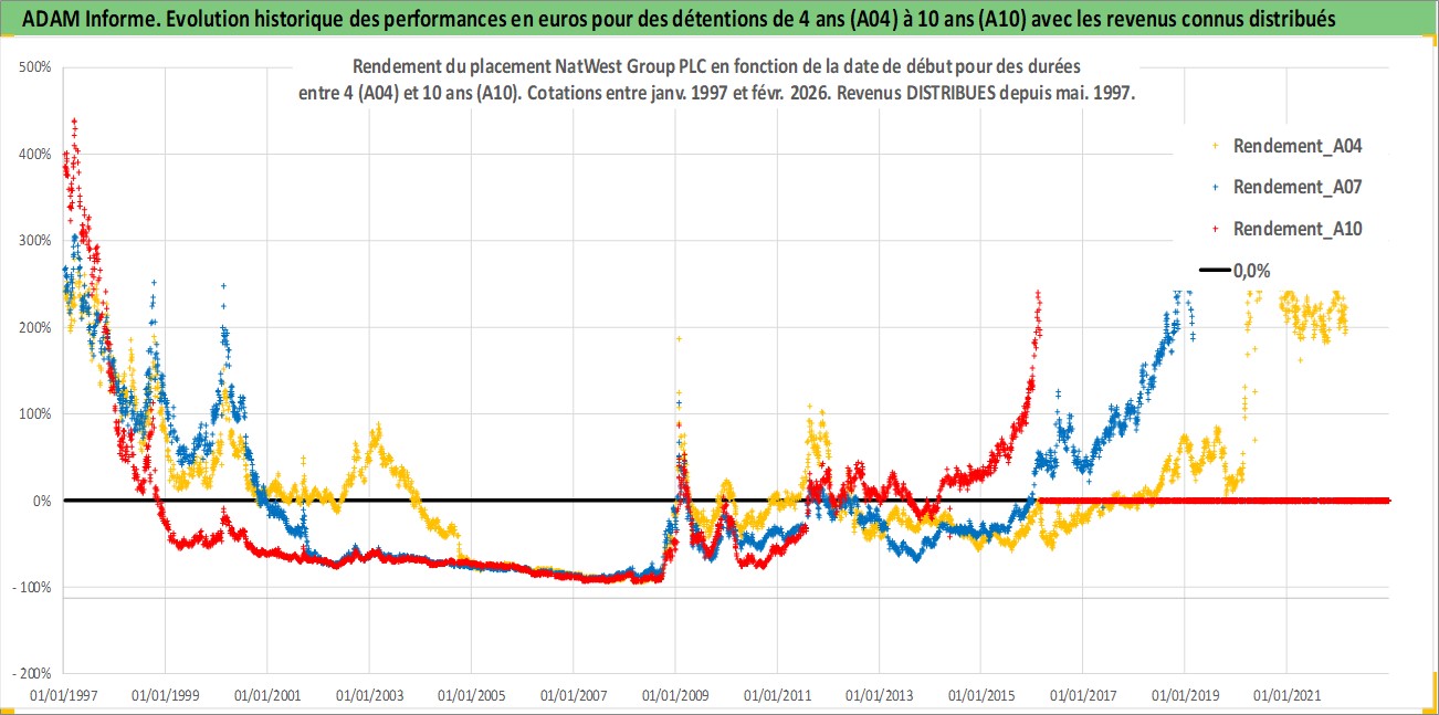 Site dédié aux investisseursPage dédiée sur site financeAnalyse des valorisations hebdomadaires de l'action NatWest Group PLC. Cet actif est cote en GBX. Les valorisations sont en contrevaleur EURO et couvrent les semaines 1997W01 a 2026W09. Les revenus de cet actif financier sont pris en compte depuis la semaine 1997W21. La note globale ESG de cet actif est estimee a 11.0 (apres rebasage entre 0 et 20).