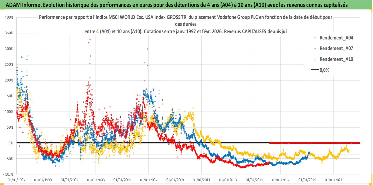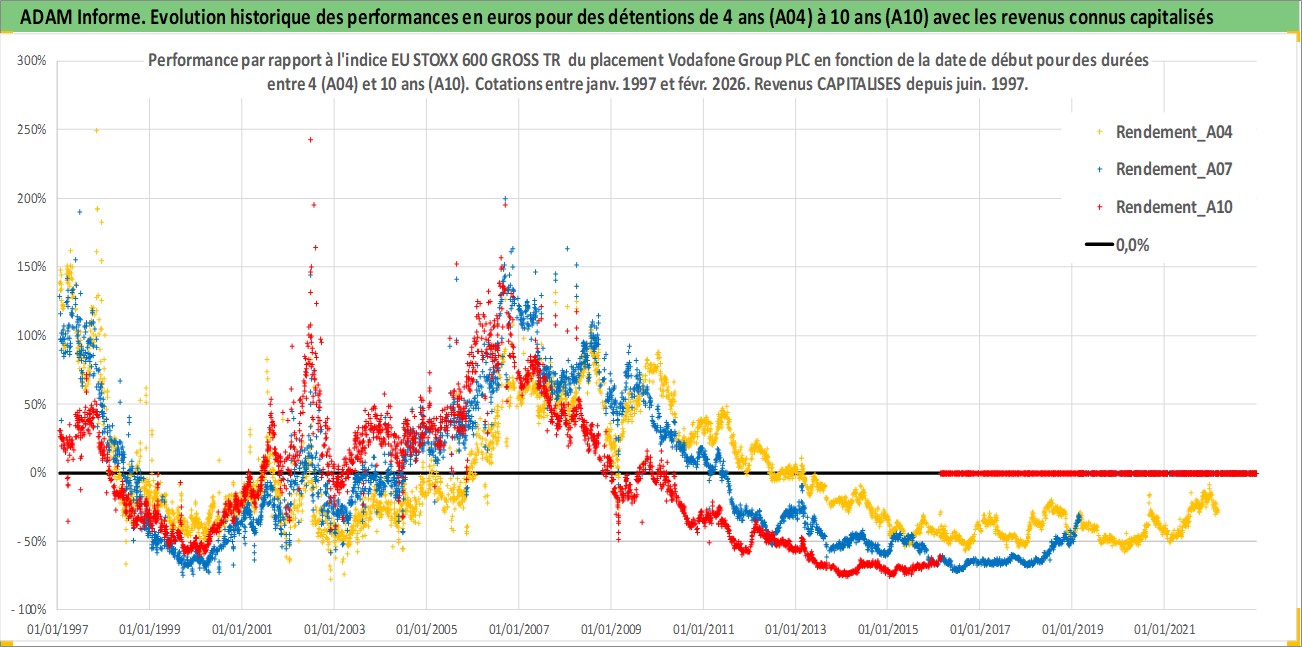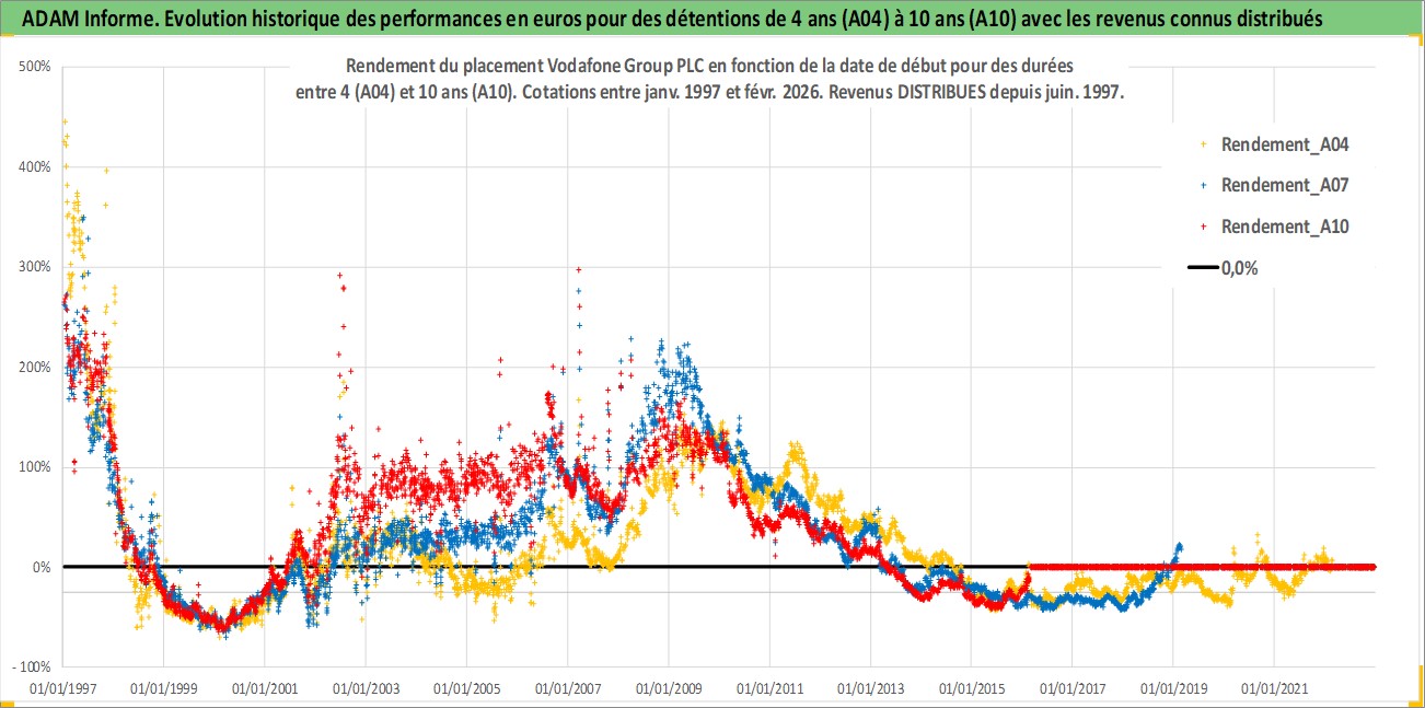 Site dédié aux investisseursPage dédiée sur site financeAnalyse des valorisations hebdomadaires de l'action Vodafone Group PLC. Cet actif est cote en GBX. Les valorisations sont en contrevaleur EURO et couvrent les semaines 1997W01 a 2026W09. Les revenus de cet actif financier sont pris en compte depuis la semaine 1997W24. La note globale ESG de cet actif est estimee a 13.0 (apres rebasage entre 0 et 20).