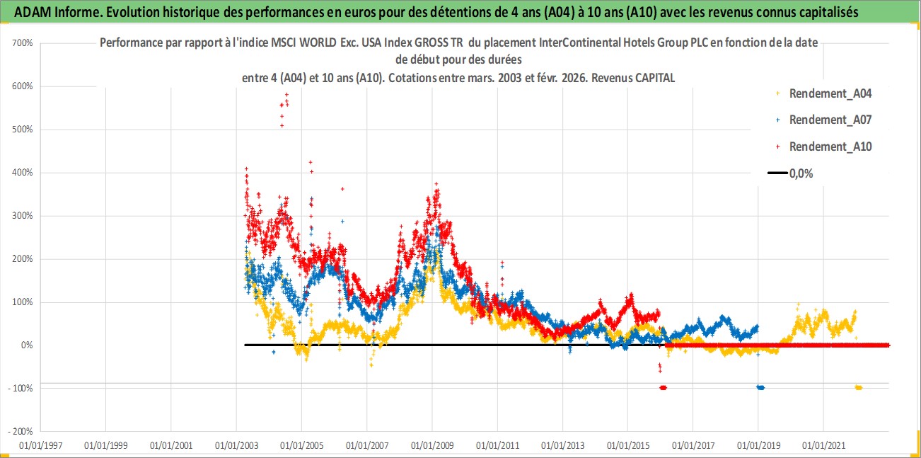 Site dédié aux investisseursPage dédiée sur site financeAnalyse des valorisations hebdomadaires de l'action InterContinental Hotels Group PLC. Cet actif est cote en GBX. Les valorisations sont en contrevaleur EURO et couvrent les semaines 2003W14 a 2026W09. Les revenus de cet actif financier sont pris en compte depuis la semaine 2003W39. La note globale ESG de cet actif est estimee a 11.0 (apres rebasage entre 0 et 20).