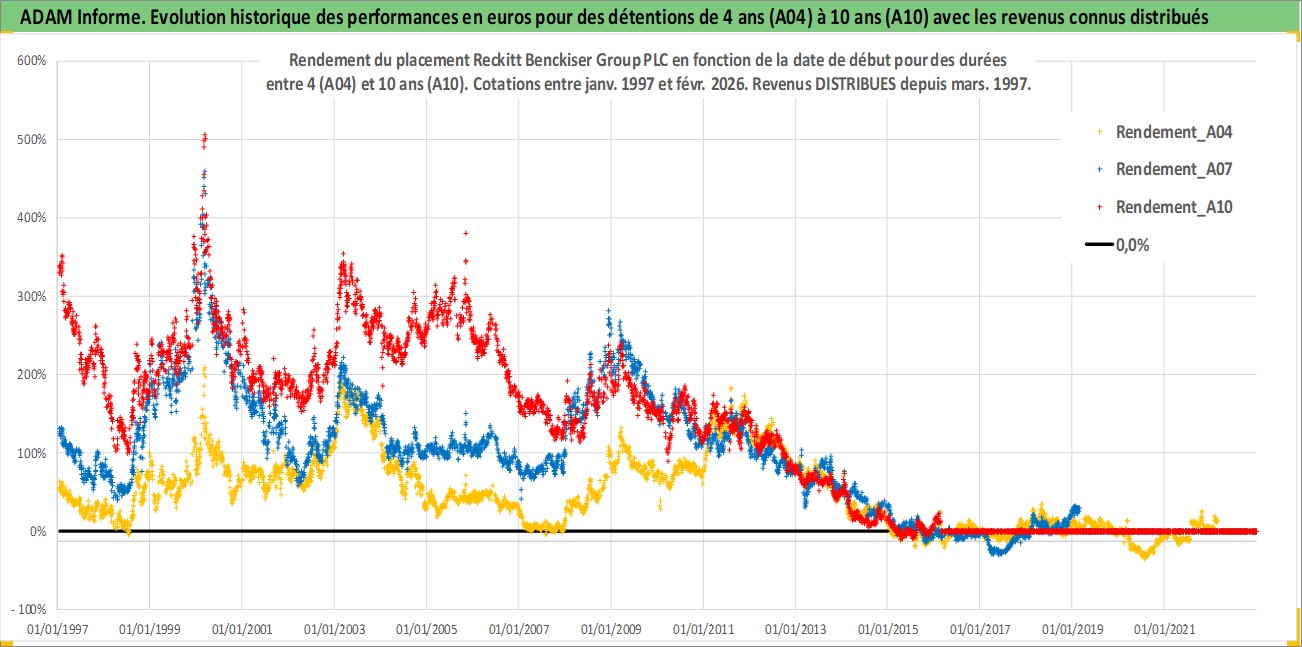 Site dédié aux investisseursPage dédiée sur site financeAnalyse des valorisations hebdomadaires de l'action Reckitt Benckiser Group PLC. Cet actif est cote en GBX. Les valorisations sont en contrevaleur EURO et couvrent les semaines 1997W01 a 2026W09. Les revenus de cet actif financier sont pris en compte depuis la semaine 1997W13. La note globale ESG de cet actif est estimee a 9.0 (apres rebasage entre 0 et 20).