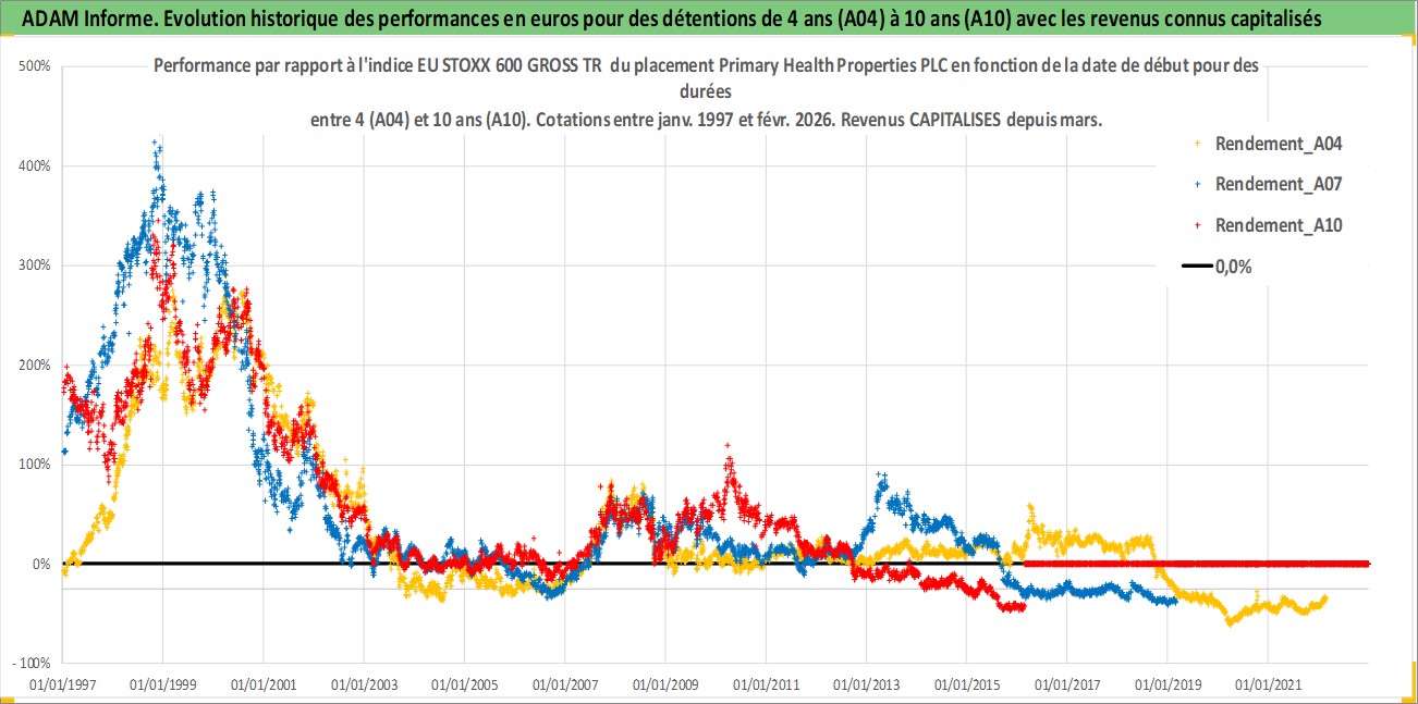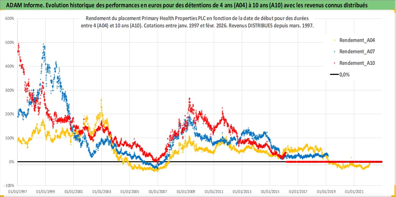 Site dédié aux investisseursPage dédiée sur site financeAnalyse des valorisations hebdomadaires de l'action Primary Health Properties PLC. Cet actif est cote en GBX. Les valorisations sont en contrevaleur EURO et couvrent les semaines 1997W01 a 2026W09. Les revenus de cet actif financier sont pris en compte depuis la semaine 1997W11. La note ESG de cet actif n'est pas connue.