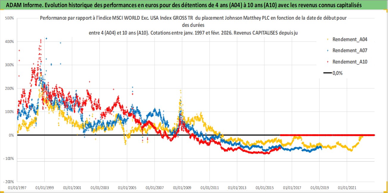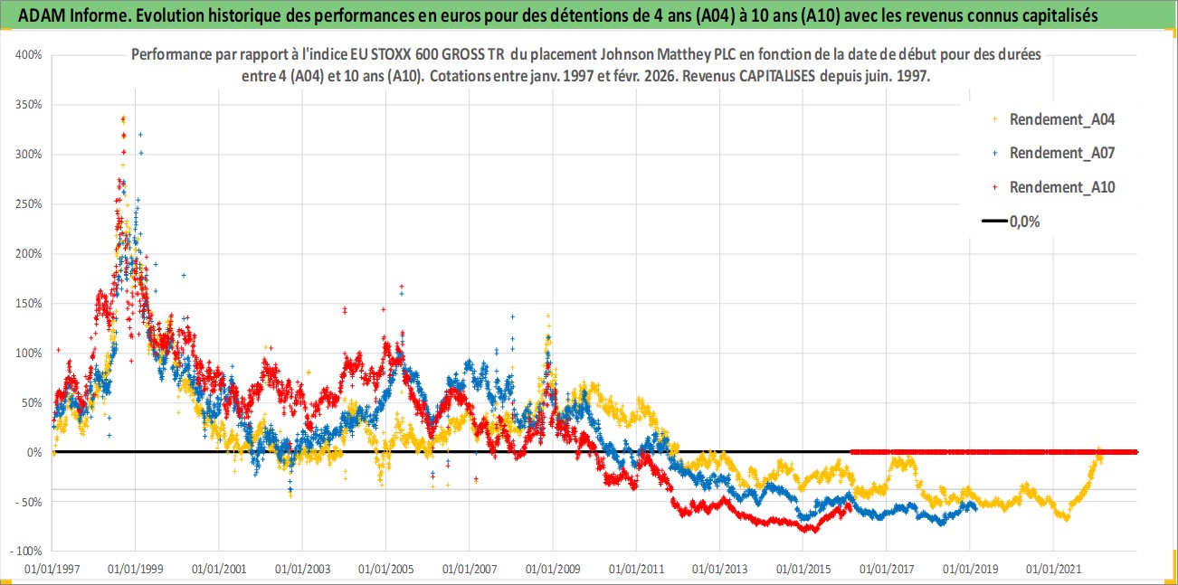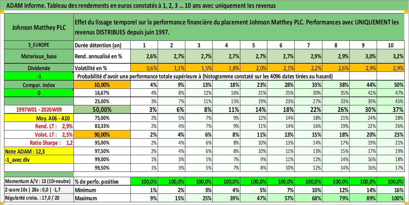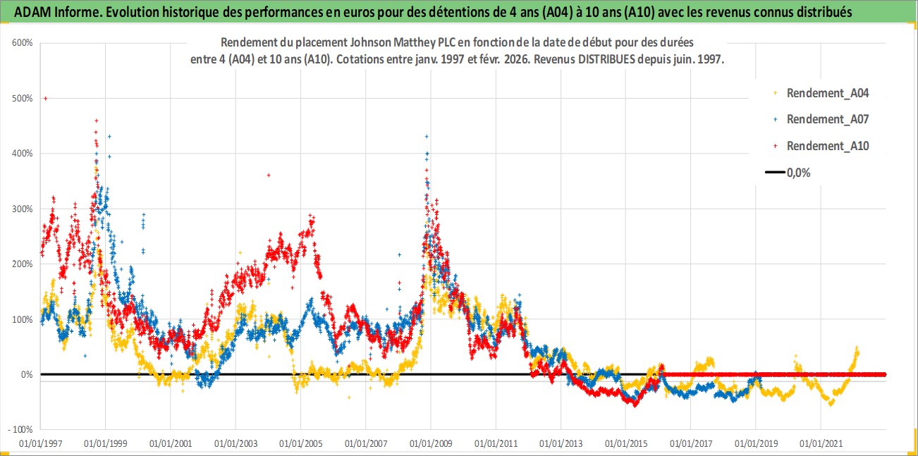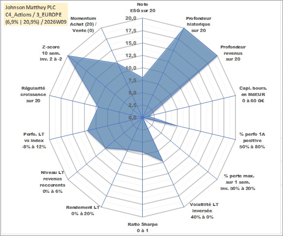 Site dédié aux investisseursPage dédiée sur site financeAnalyse des valorisations hebdomadaires de l'action Johnson Matthey PLC. Cet actif est cote en GBX. Les valorisations sont en contrevaleur EURO et couvrent les semaines 1997W01 a 2026W09. Les revenus de cet actif financier sont pris en compte depuis la semaine 1997W26. La note globale ESG de cet actif est estimee a 8.0 (apres rebasage entre 0 et 20).