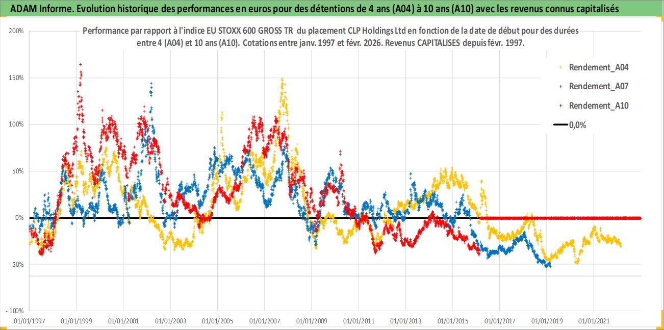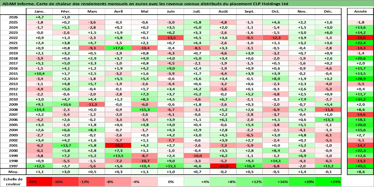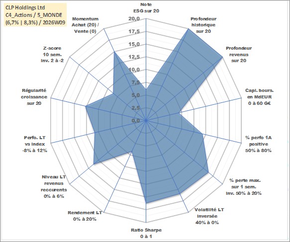 Site dédié aux investisseursPage dédiée sur site financeAnalyse des valorisations hebdomadaires de l'action CLP Holdings Ltd. Cet actif est cote en HKD. Les valorisations sont en contrevaleur EURO et couvrent les semaines 1997W01 a 2026W09. Les revenus de cet actif financier sont pris en compte depuis la semaine 1997W07. La note globale ESG de cet actif est estimee a 6.0 (apres rebasage entre 0 et 20).