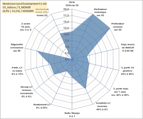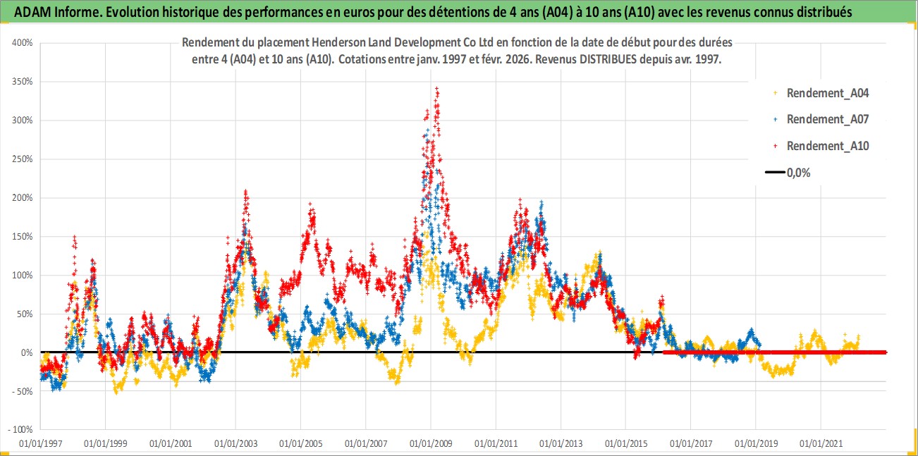 Site dédié aux investisseursPage dédiée sur site financeAnalyse des valorisations hebdomadaires de l'action Henderson Land Development Co Ltd. Cet actif est cote en HKD. Les valorisations sont en contrevaleur EURO et couvrent les semaines 1997W01 a 2026W09. Les revenus de cet actif financier sont pris en compte depuis la semaine 1997W16. La note globale ESG de cet actif est estimee a 11.0 (apres rebasage entre 0 et 20).