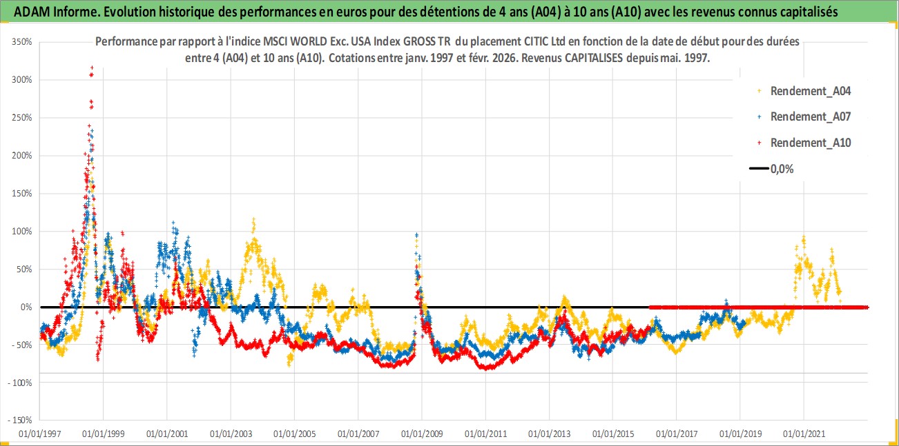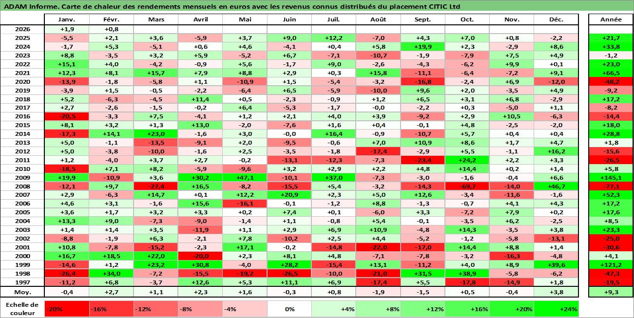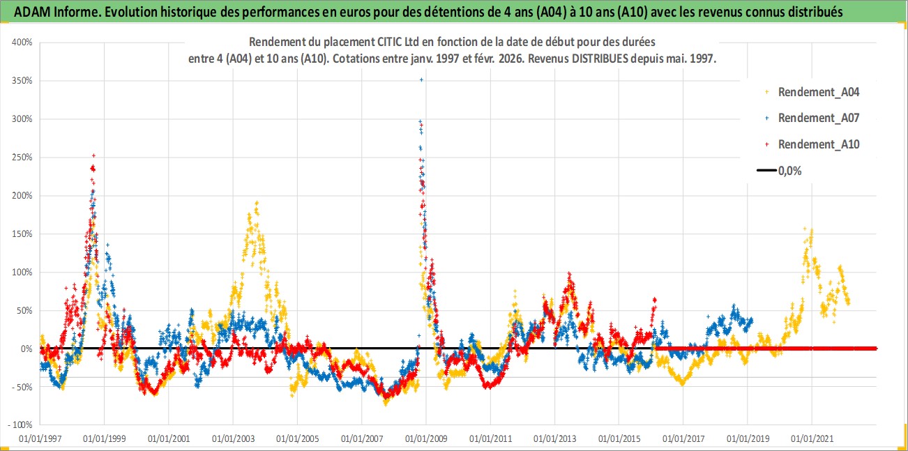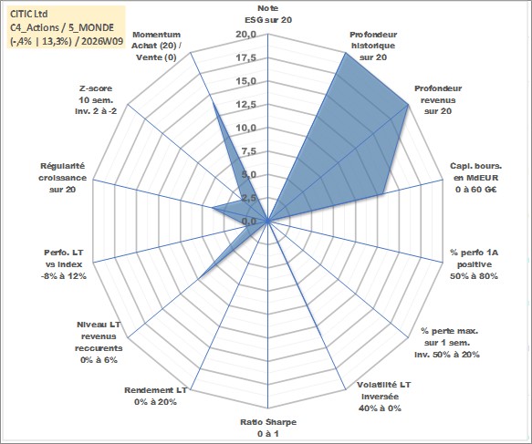 Site dédié aux investisseursPage dédiée sur site financeAnalyse des valorisations hebdomadaires de l'action CITIC Ltd. Cet actif est cote en HKD. Les valorisations sont en contrevaleur EURO et couvrent les semaines 1997W01 a 2026W09. Les revenus de cet actif financier sont pris en compte depuis la semaine 1997W22. La note ESG de cet actif n'est pas connue.