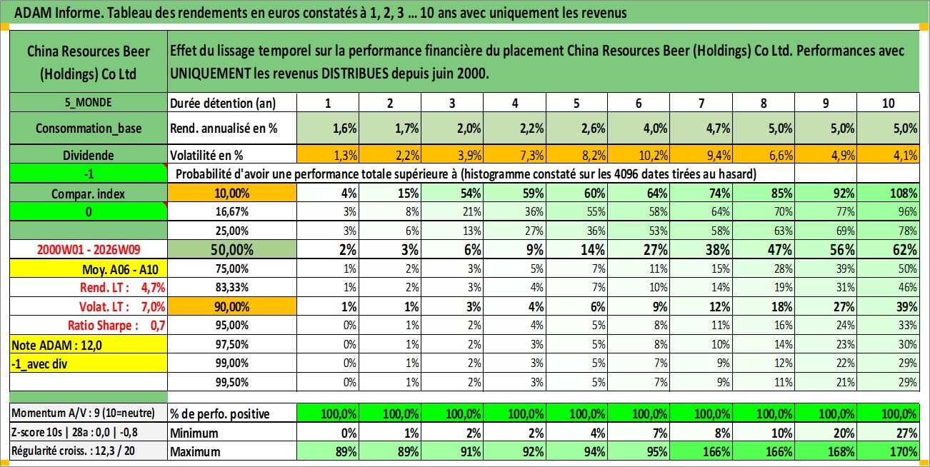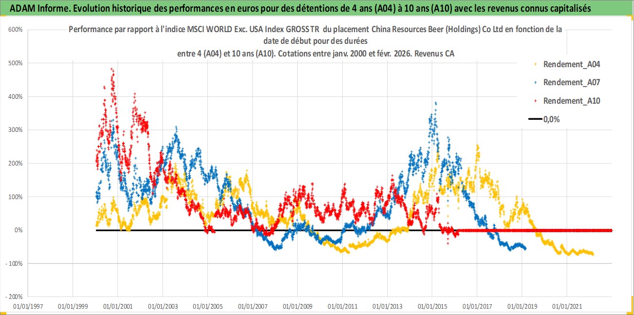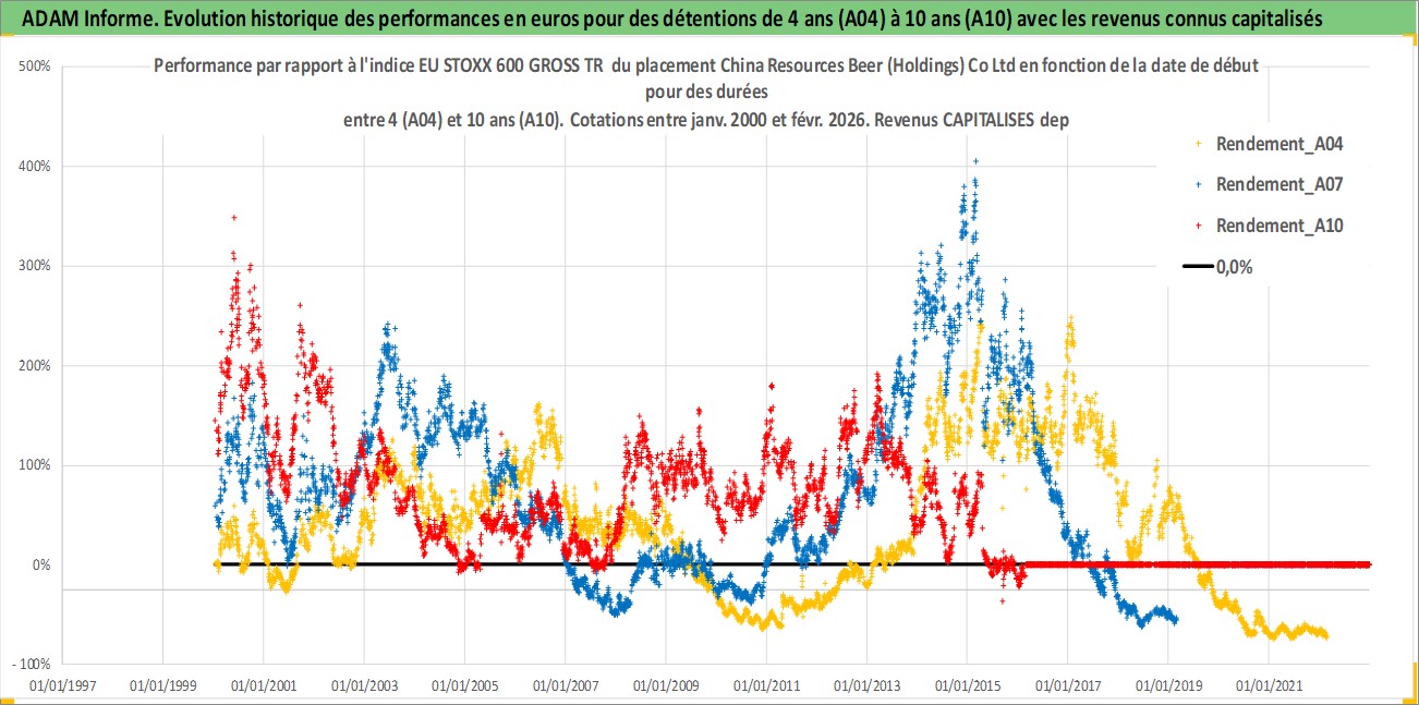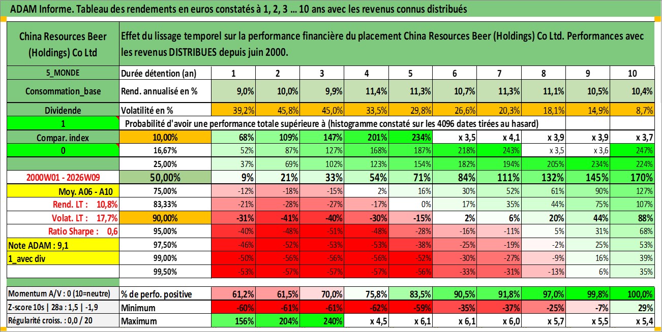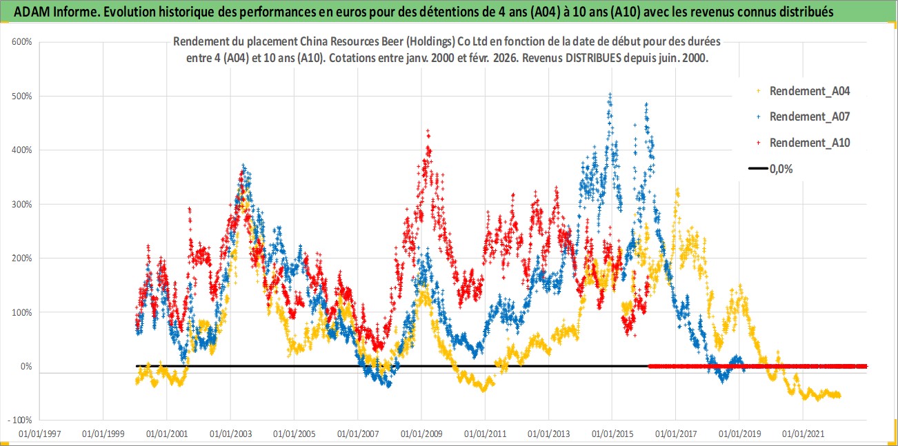 Site dédié aux investisseursPage dédiée sur site financeAnalyse des valorisations hebdomadaires de l'action China Resources Beer (Holdings) Co Ltd. Cet actif est cote en HKD. Les valorisations sont en contrevaleur EURO et couvrent les semaines 2000W01 a 2026W09. Les revenus de cet actif financier sont pris en compte depuis la semaine 2000W23. La note globale ESG de cet actif est estimee a 5.0 (apres rebasage entre 0 et 20).