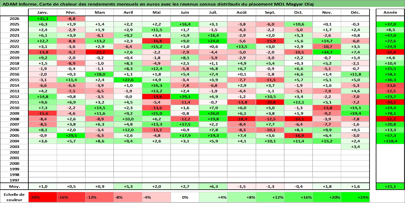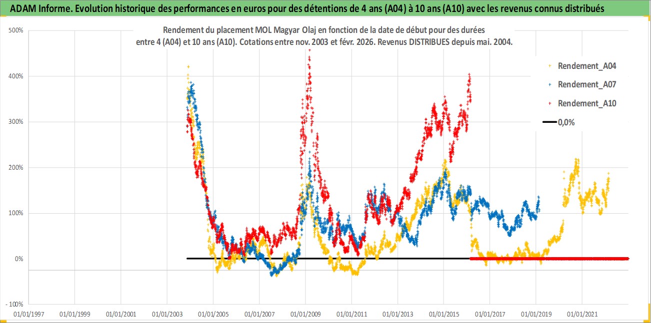Site dédié aux investisseursPage dédiée sur site financeAnalyse des valorisations hebdomadaires de l'action MOL Magyar Olaj. Cet actif est cote en HUF. Les valorisations sont en contrevaleur EURO et couvrent les semaines 2003W45 a 2026W09. Les revenus de cet actif financier sont pris en compte depuis la semaine 2004W22. La note ESG de cet actif n'est pas connue.