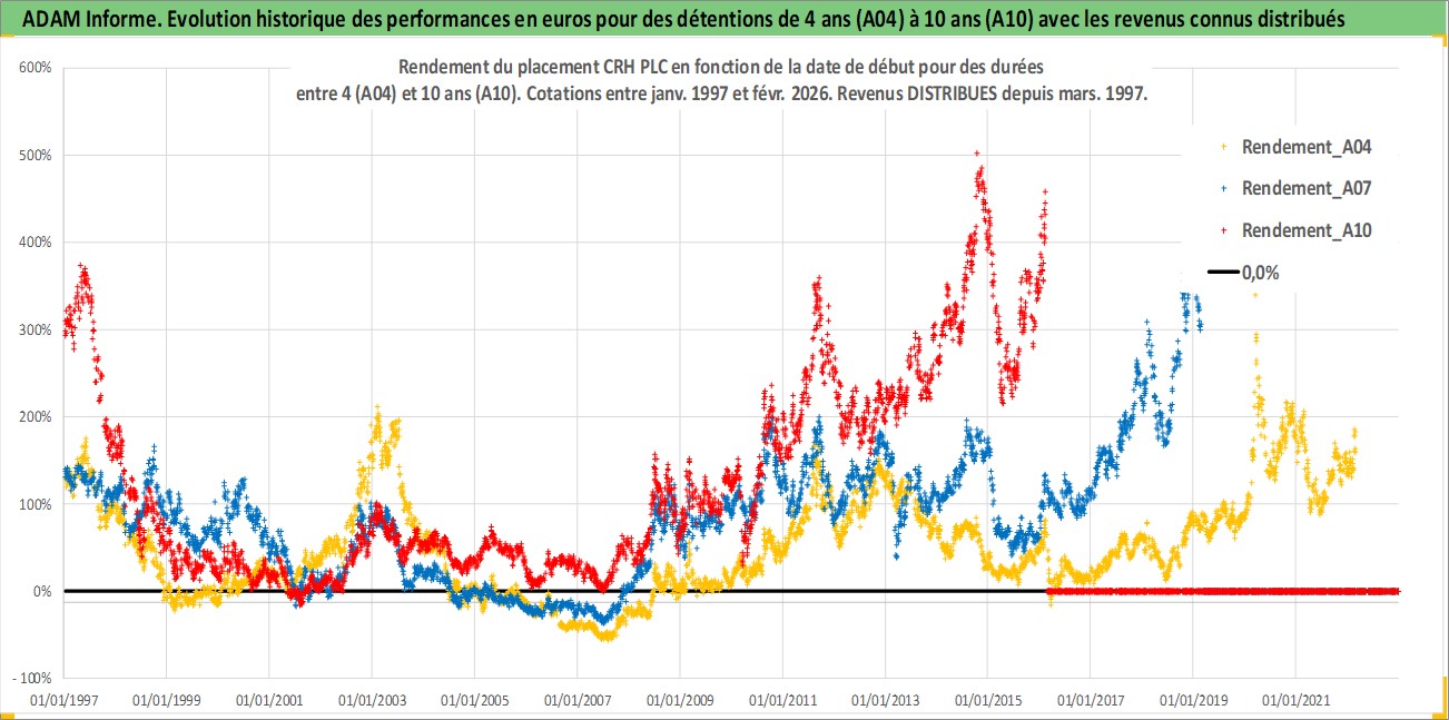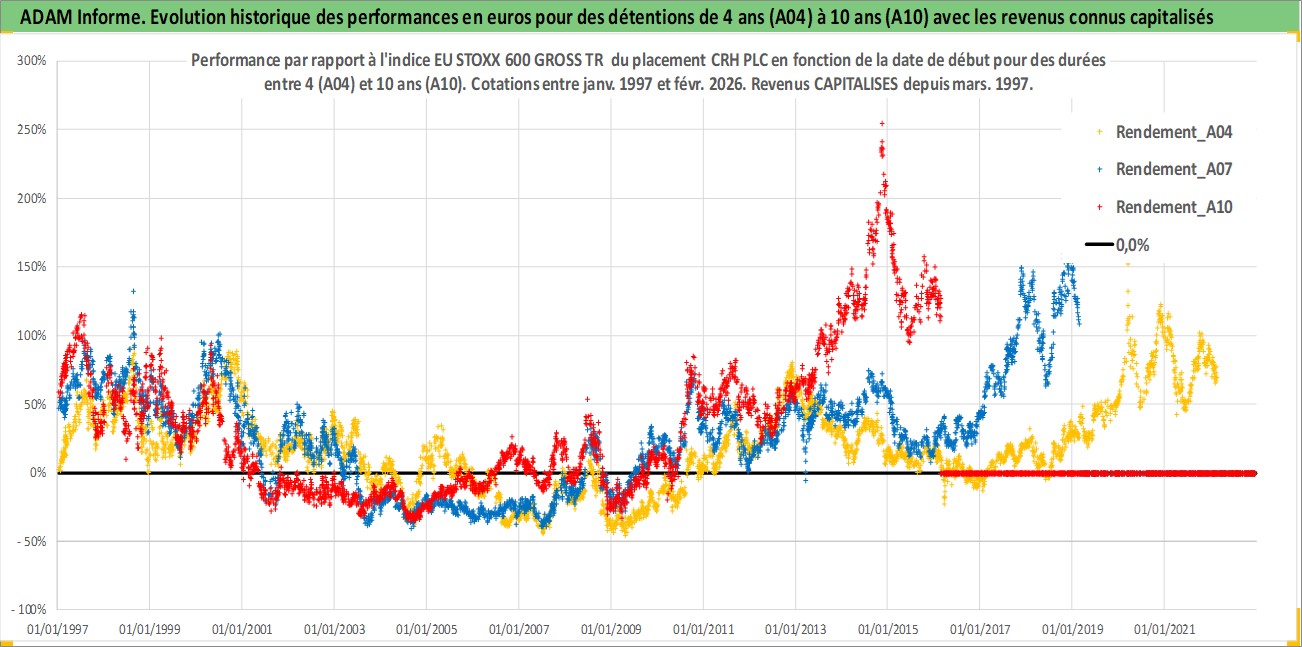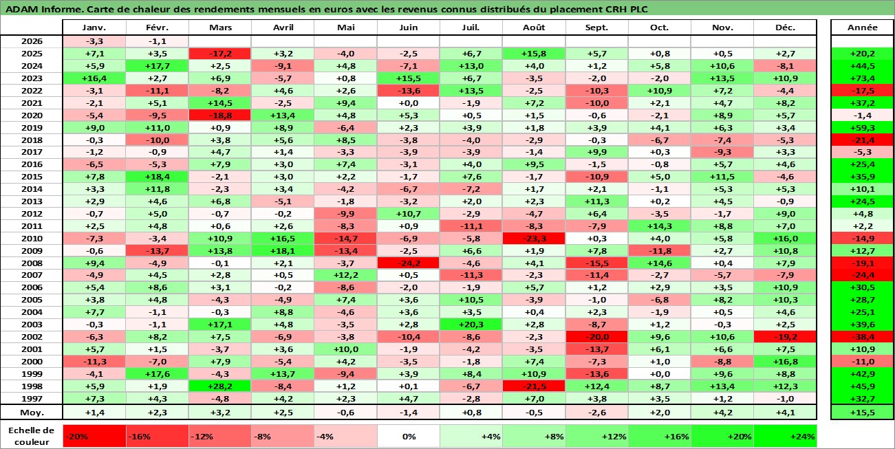 Site dédié aux investisseursPage dédiée sur site financeAnalyse des valorisations hebdomadaires de l'action CRH PLC. Cet actif est cote en USD. Les valorisations sont en contrevaleur EURO et couvrent les semaines 1997W01 a 2026W09. Les revenus de cet actif financier sont pris en compte depuis la semaine 1997W11. La note ESG de cet actif n'est pas connue.