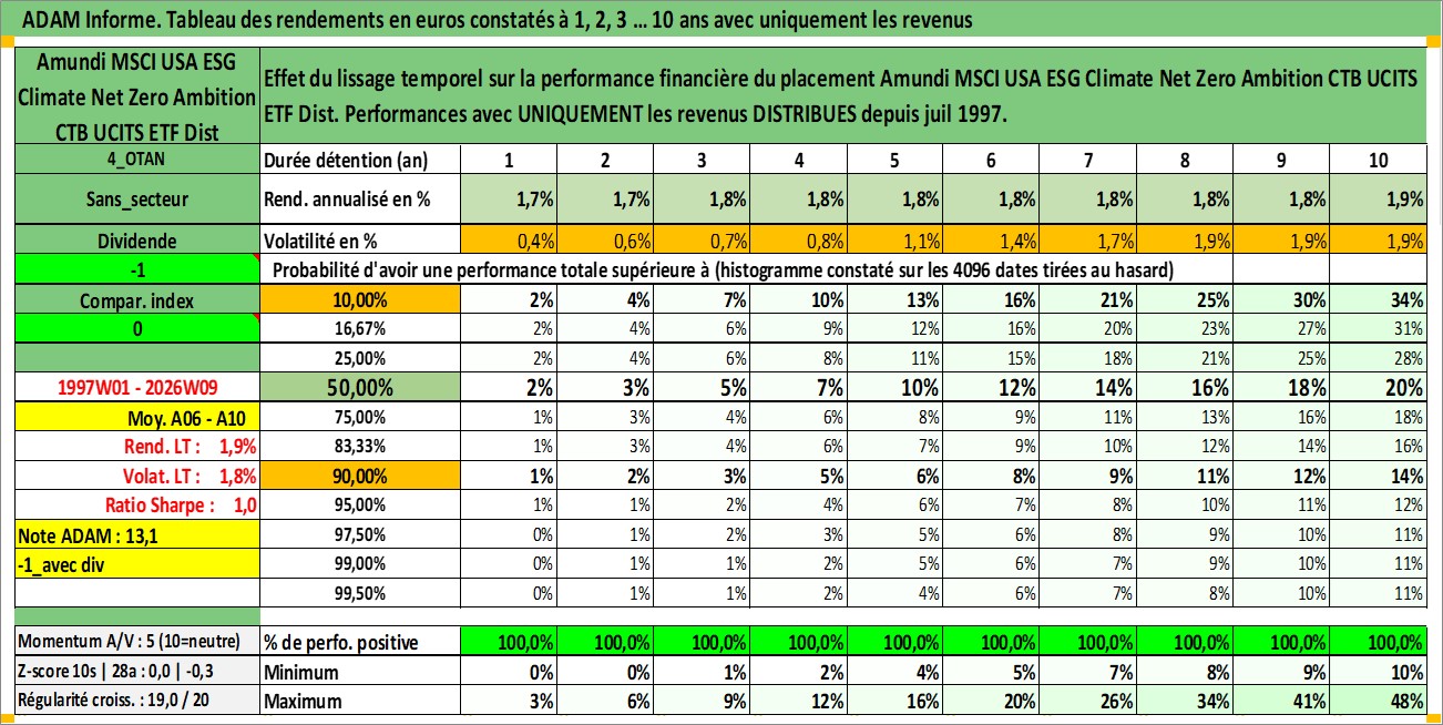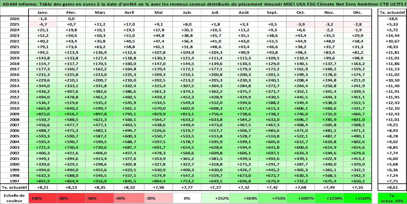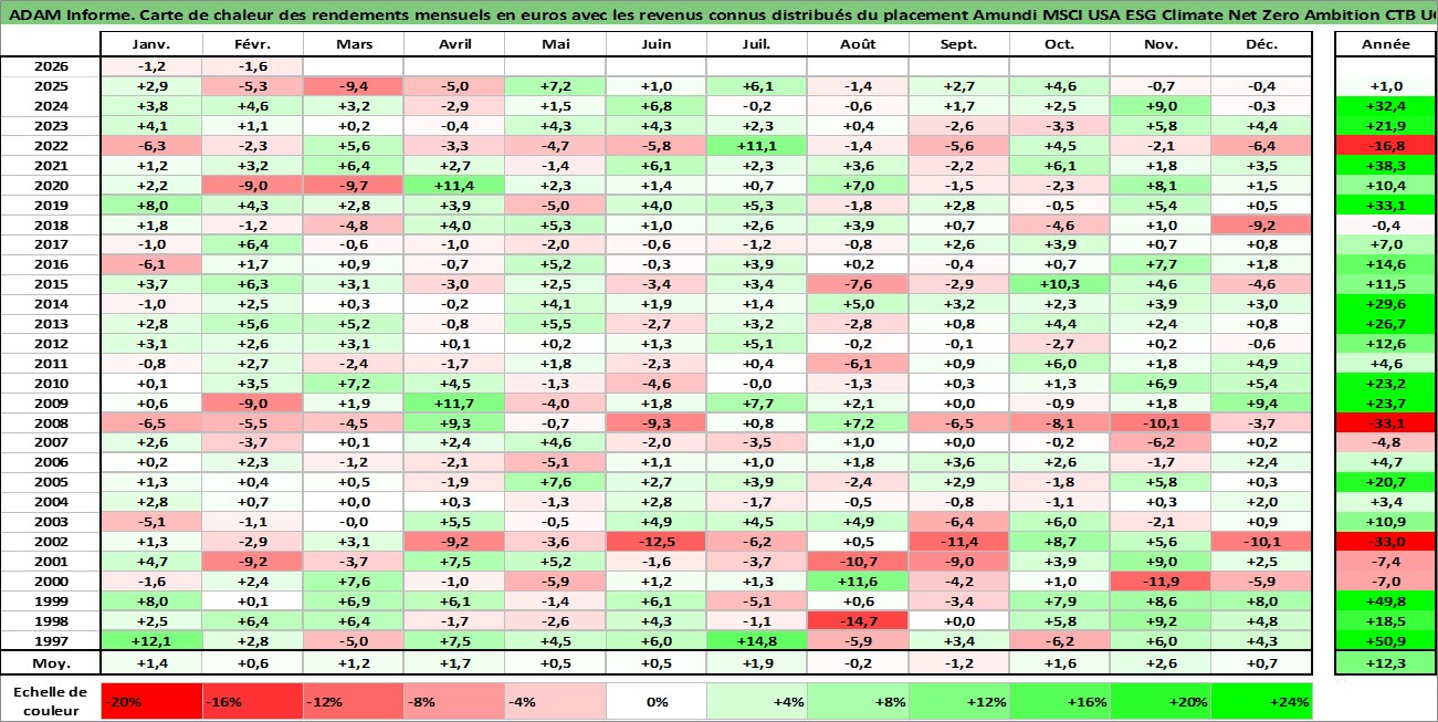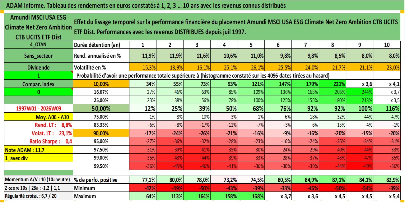 Site dédié aux investisseursPage dédiée sur site financeAnalyse des valorisations hebdomadaires du fonds Amundi MSCI USA ESG Climate Net Zero Ambition CTB UCITS ETF Dist. Cet actif est cote en EUR. Les valorisations couvrent les semaines 1997W01 a 2026W09. Les revenus de cet actif financier sont pris en compte depuis la semaine 1997W28. La note ESG de cet actif n'est pas connue.