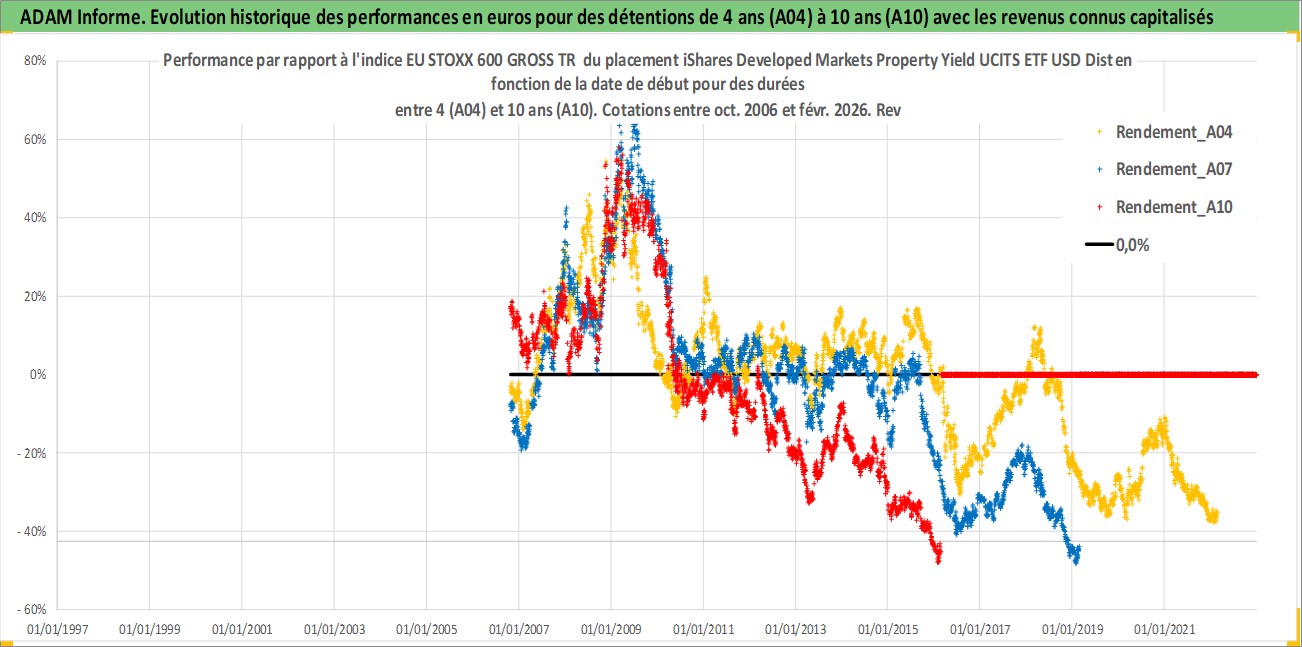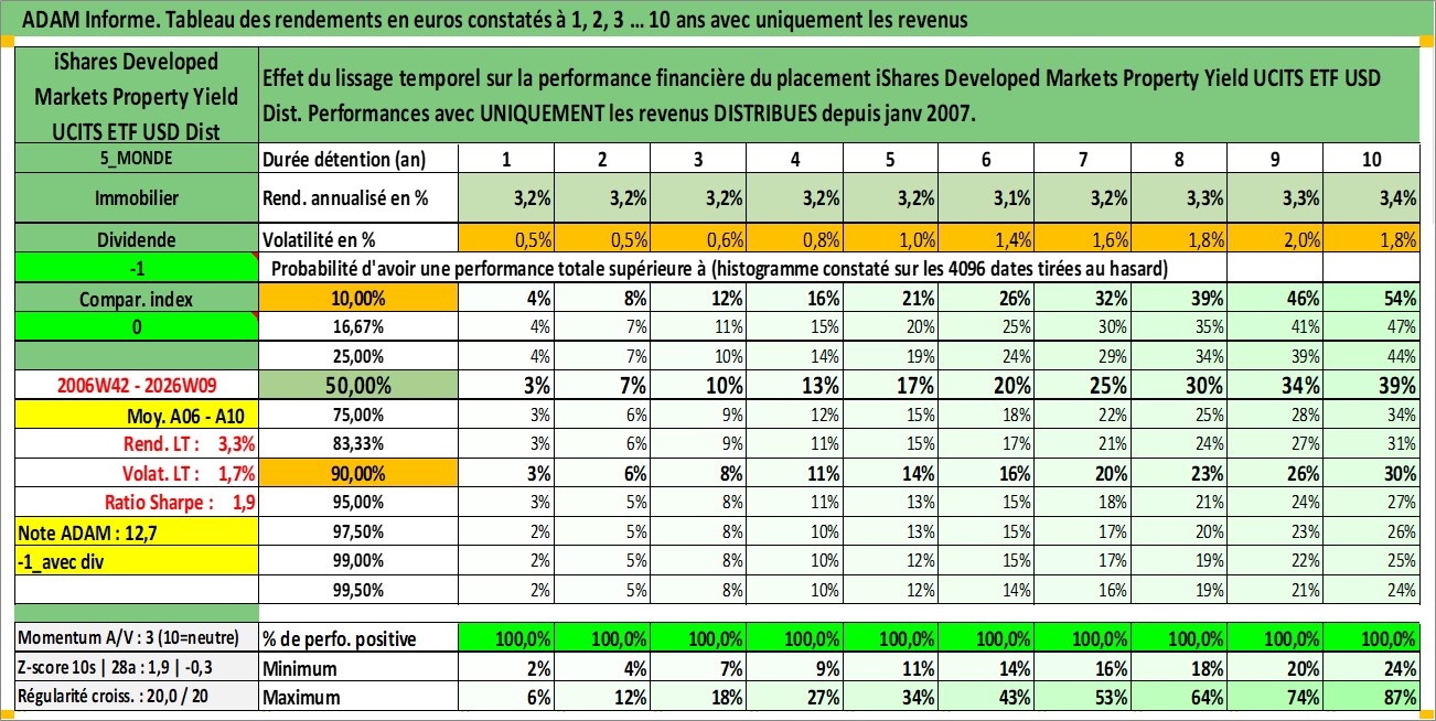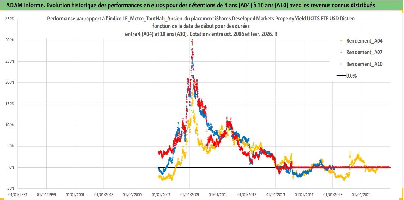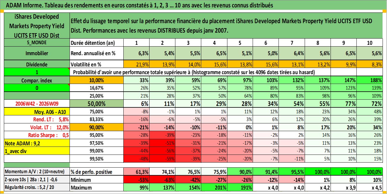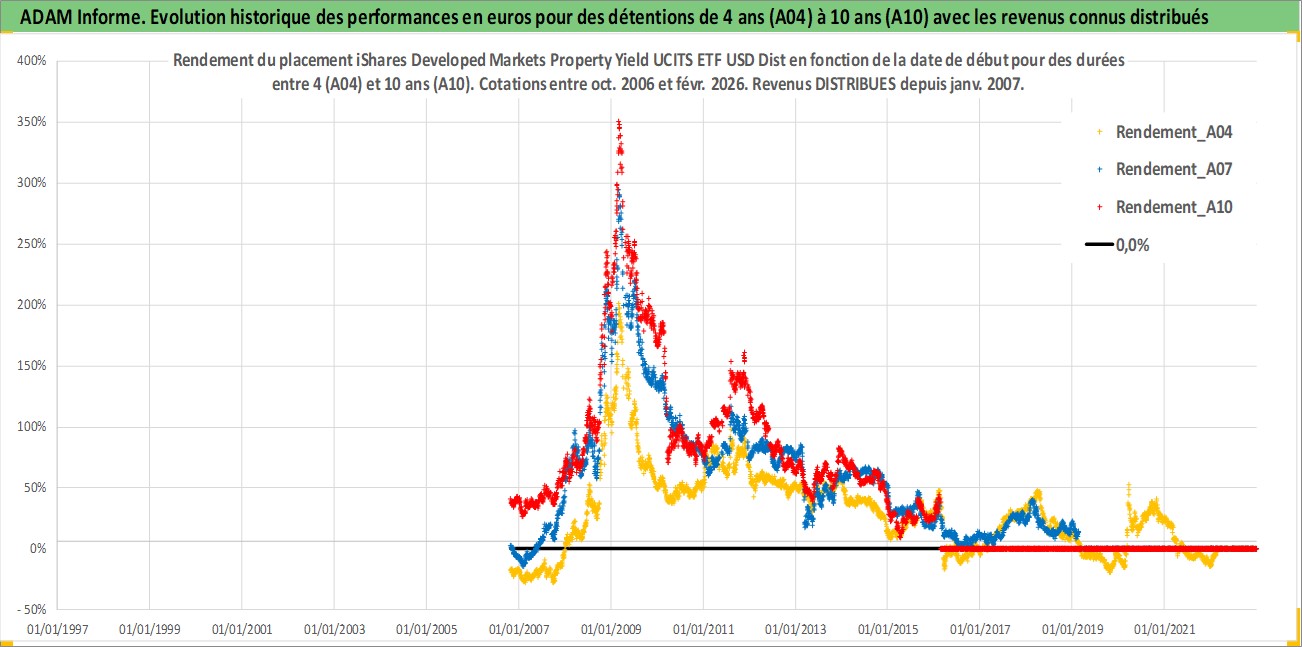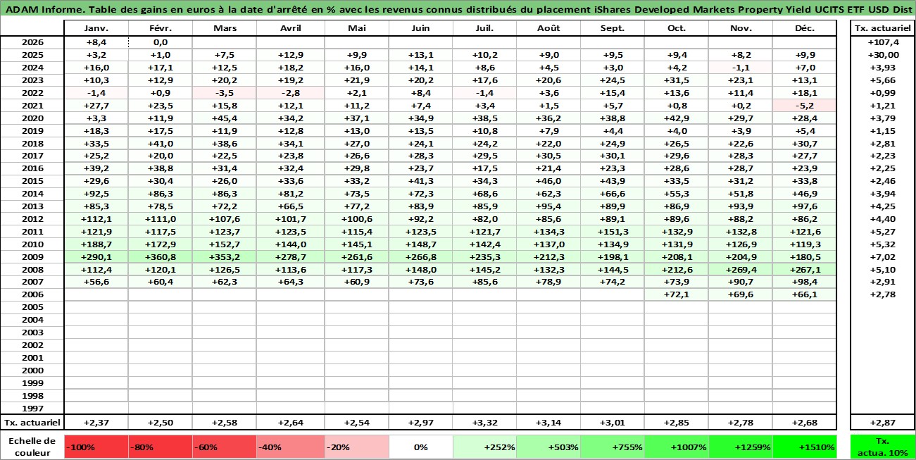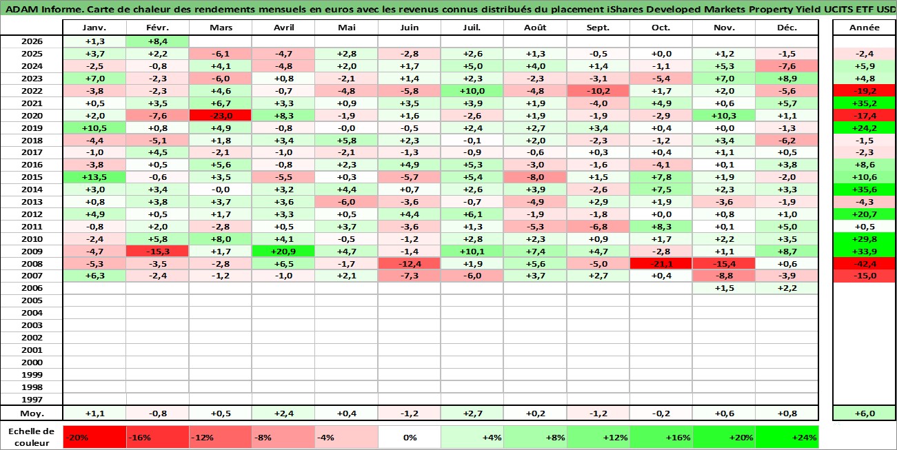 Site dédié aux investisseursPage dédiée sur site financeAnalyse des valorisations hebdomadaires du fonds iShares Developed Markets Property Yield UCITS ETF USD Dist. Cet actif est cote en USD. Les valorisations sont en contrevaleur EURO et couvrent les semaines 2006W42 a 2026W09. Les revenus de cet actif financier sont pris en compte depuis la semaine 2007W05. La note ESG de cet actif n'est pas connue.