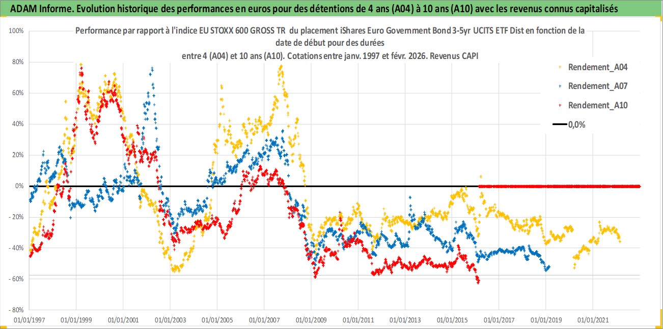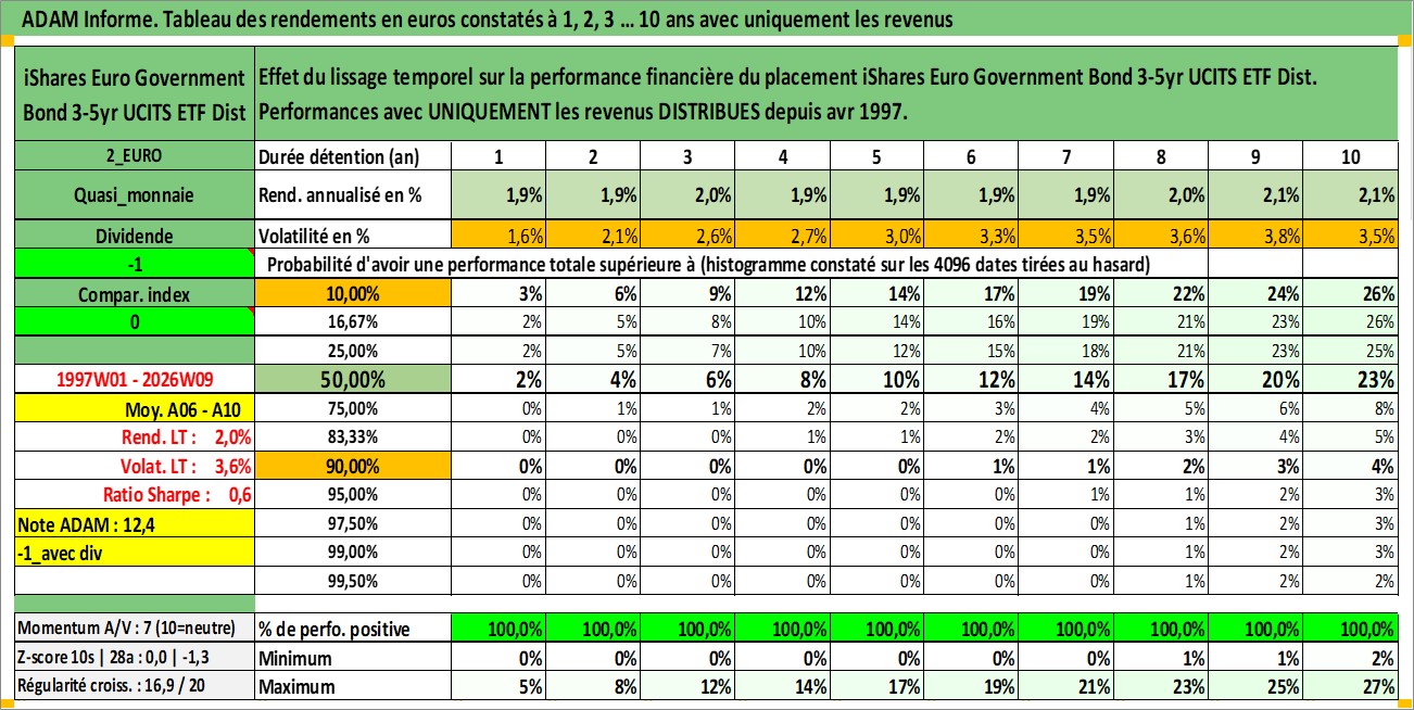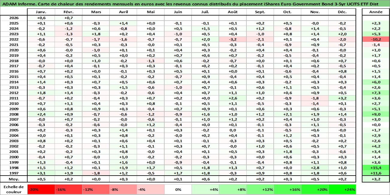 Site dédié aux investisseursPage dédiée sur site financeAnalyse des valorisations hebdomadaires du fonds iShares Euro Government Bond 3-5yr UCITS ETF Dist. Cet actif est cote en EUR. Les valorisations couvrent les semaines 1997W01 a 2026W09. Les revenus de cet actif financier sont pris en compte depuis la semaine 1997W17. La note ESG de cet actif n'est pas connue.