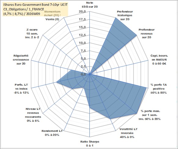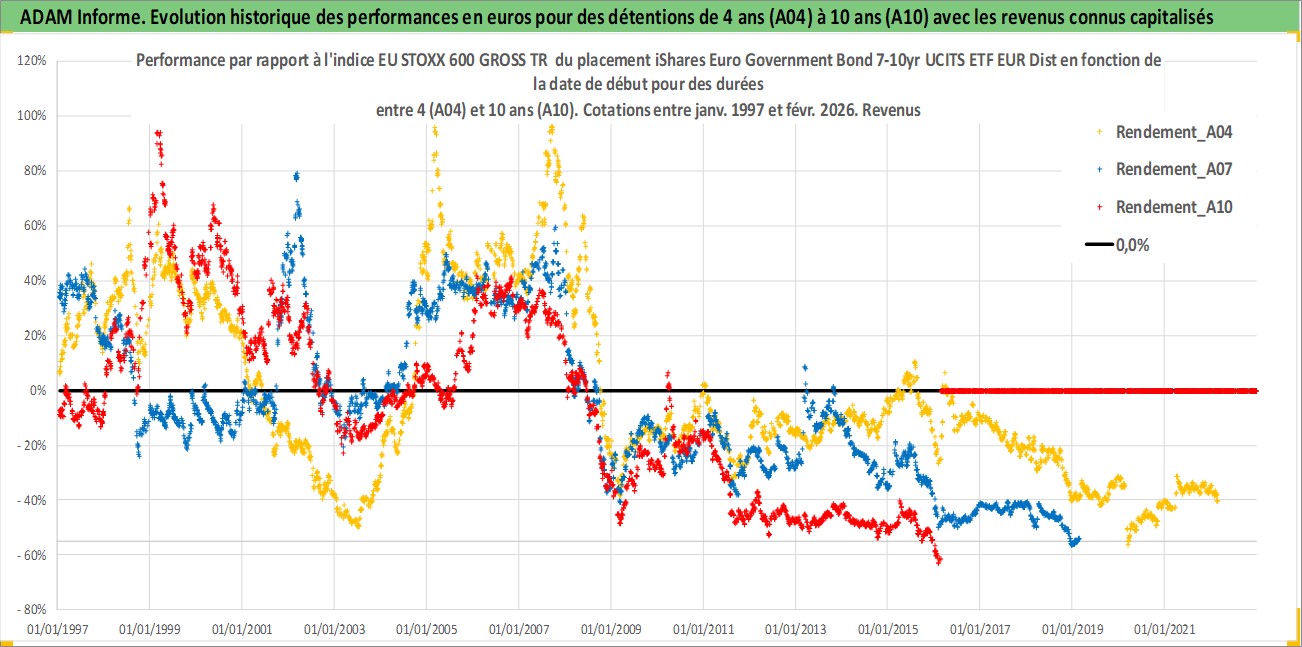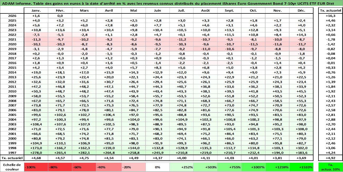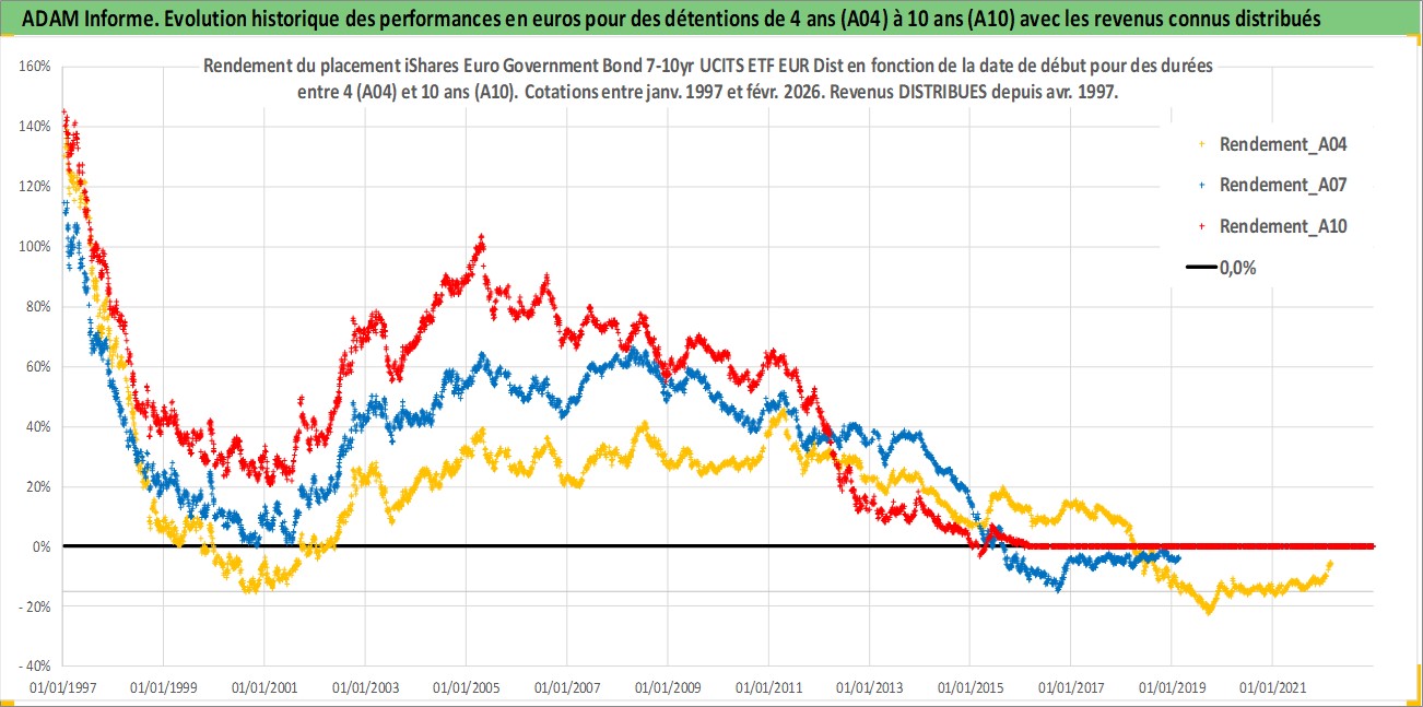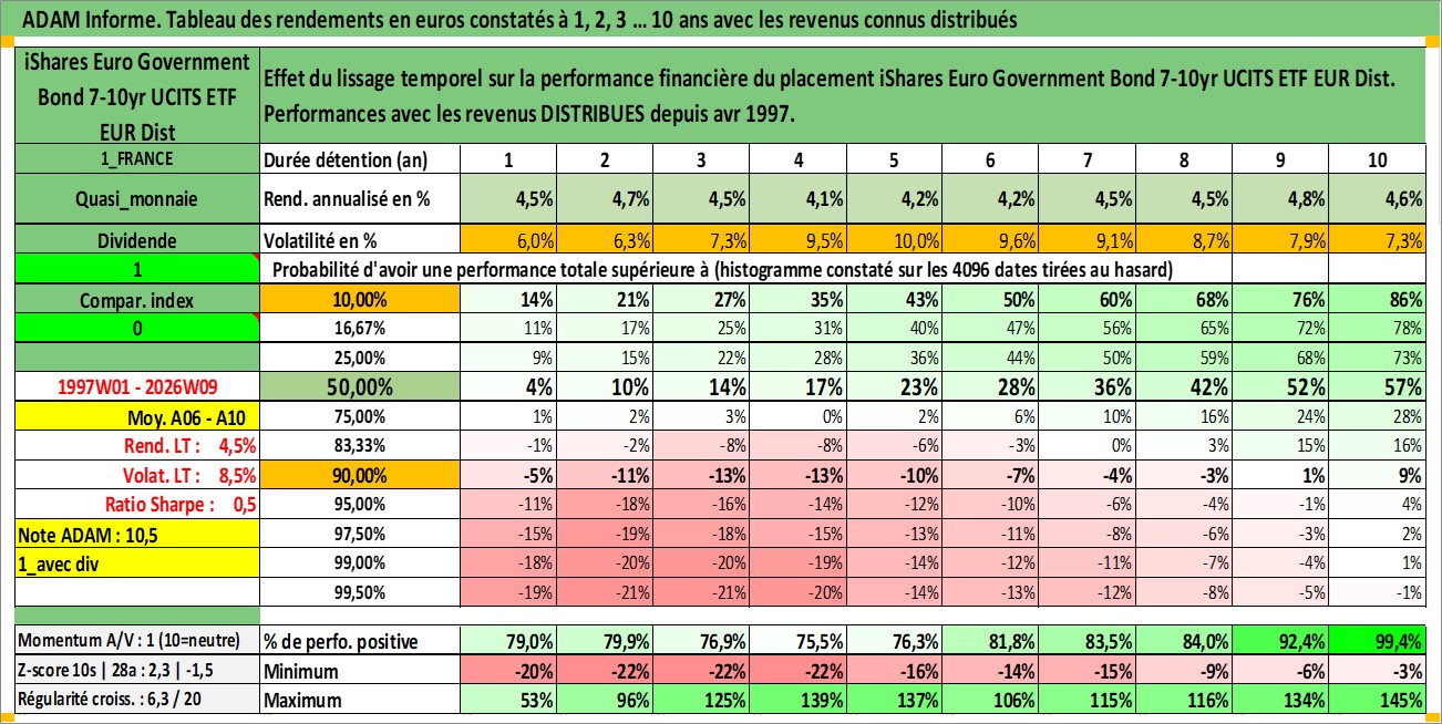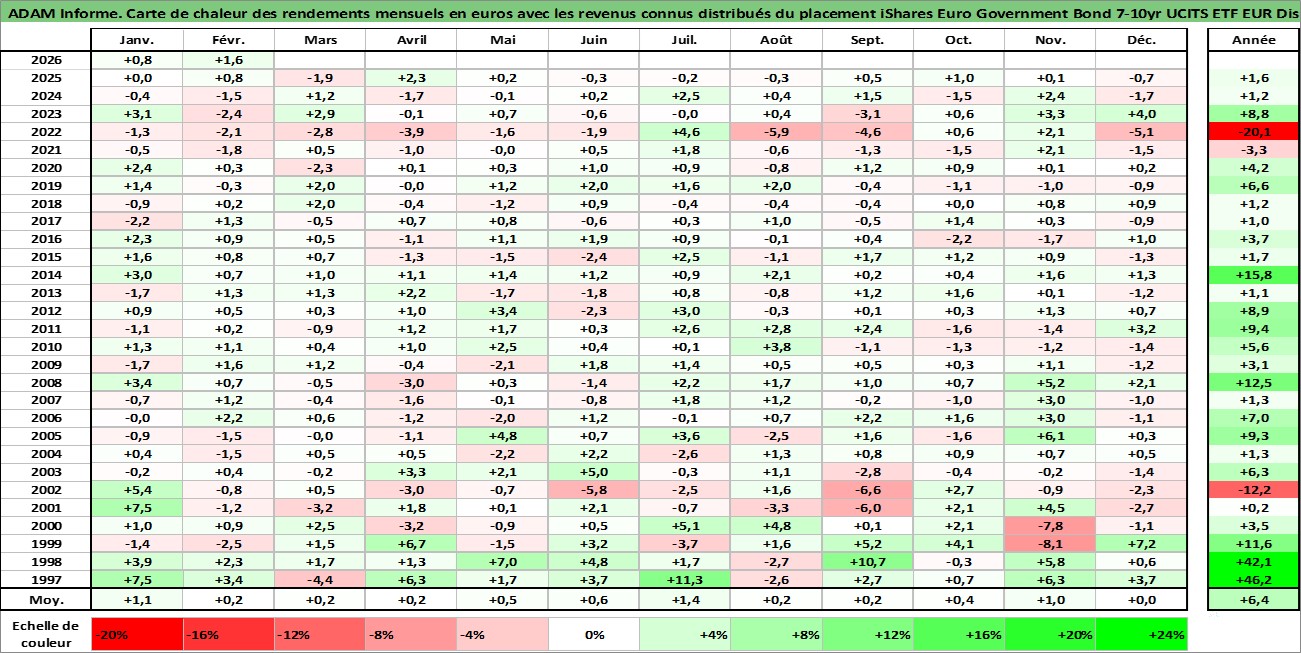 Site dédié aux investisseursPage dédiée sur site financeAnalyse des valorisations hebdomadaires du fonds iShares Euro Government Bond 7-10yr UCITS ETF EUR Dist. Cet actif est cote en EUR. Les valorisations couvrent les semaines 1997W01 a 2026W09. Les revenus de cet actif financier sont pris en compte depuis la semaine 1997W17. La note ESG de cet actif n'est pas connue.