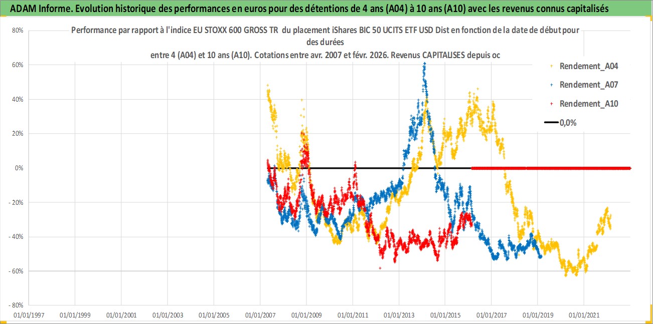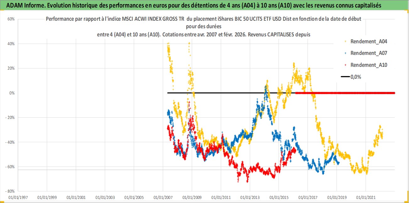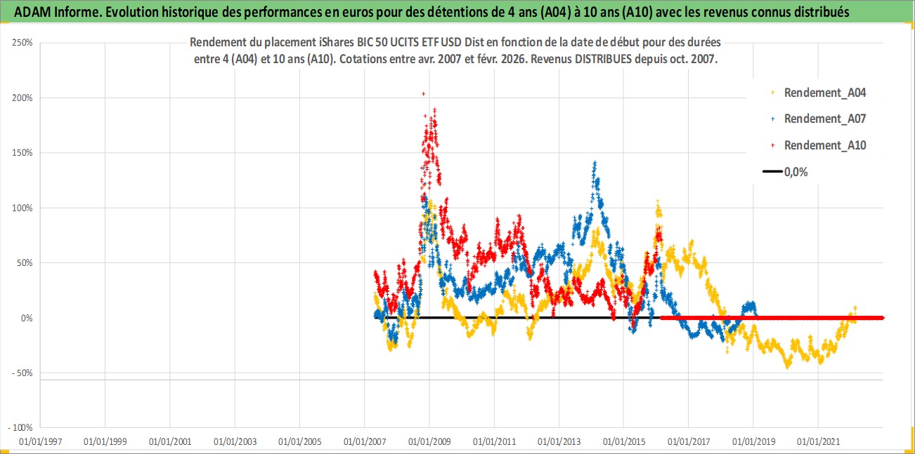 Site dédié aux investisseursPage dédiée sur site financeAnalyse des valorisations hebdomadaires du fonds iShares BIC 50 UCITS ETF USD Dist. Cet actif est cote en USD. Les valorisations sont en contrevaleur EURO et couvrent les semaines 2007W16 a 2026W09. Les revenus de cet actif financier sont pris en compte depuis la semaine 2007W44. La note ESG de cet actif n'est pas connue.