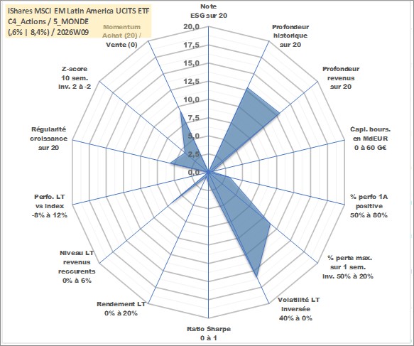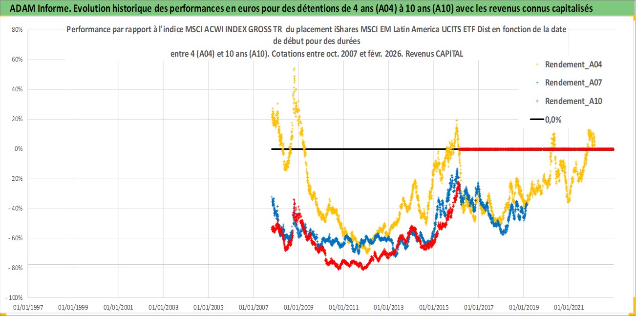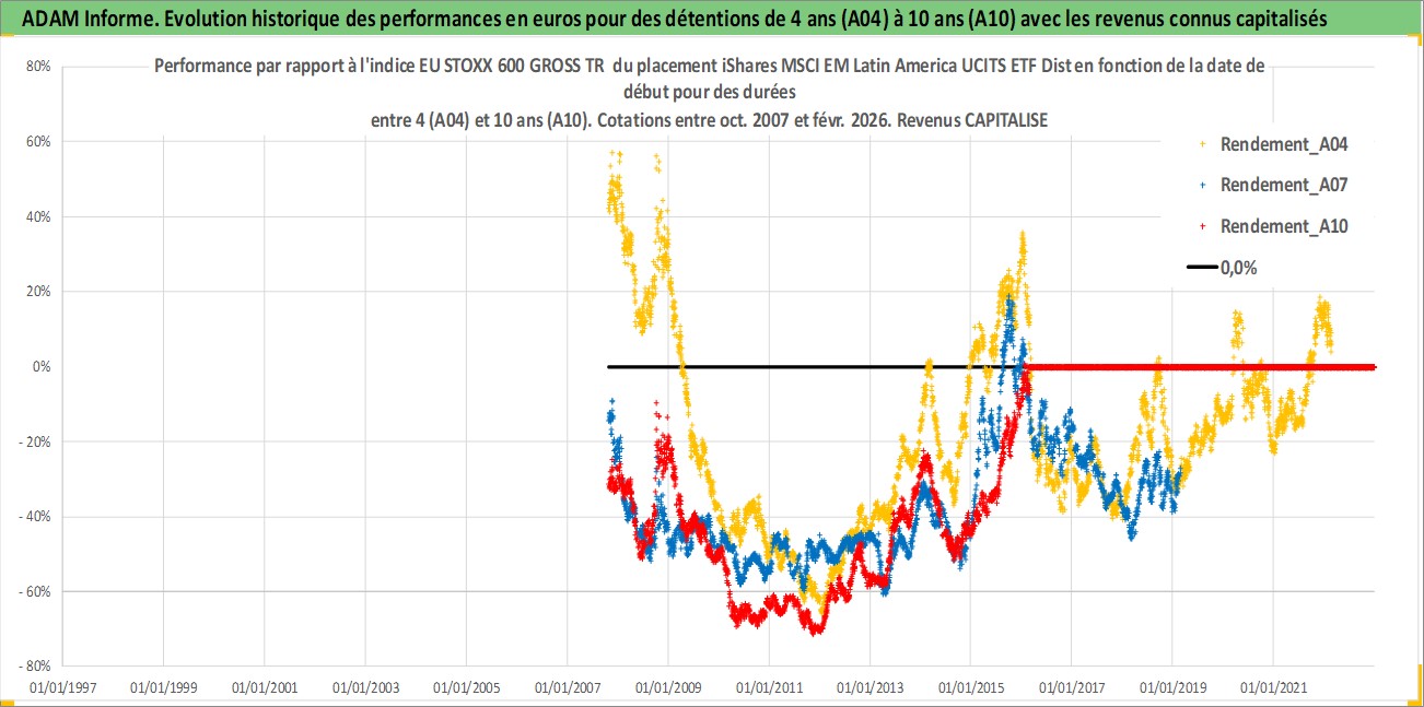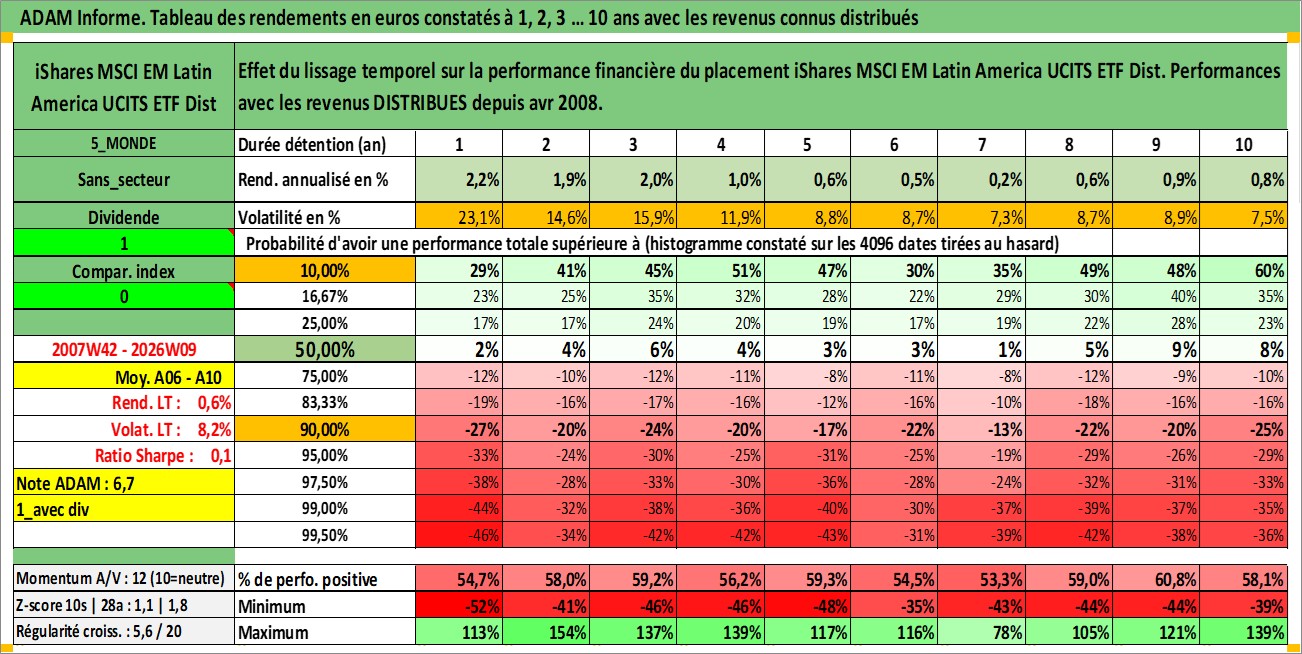 Site dédié aux investisseursPage dédiée sur site financeAnalyse des valorisations hebdomadaires du fonds iShares MSCI EM Latin America UCITS ETF Dist. Cet actif est cote en USD. Les valorisations sont en contrevaleur EURO et couvrent les semaines 2007W42 a 2026W09. Les revenus de cet actif financier sont pris en compte depuis la semaine 2008W18. La note ESG de cet actif n'est pas connue.