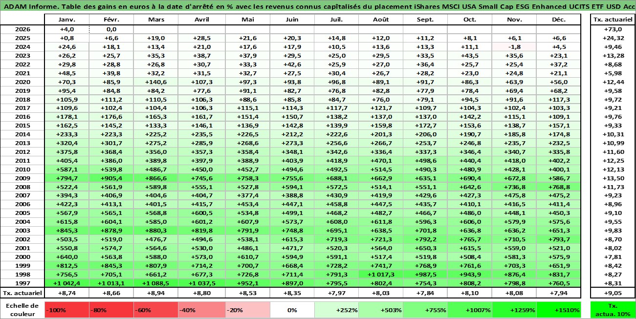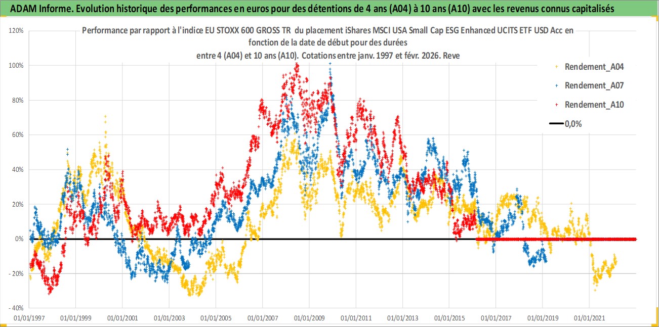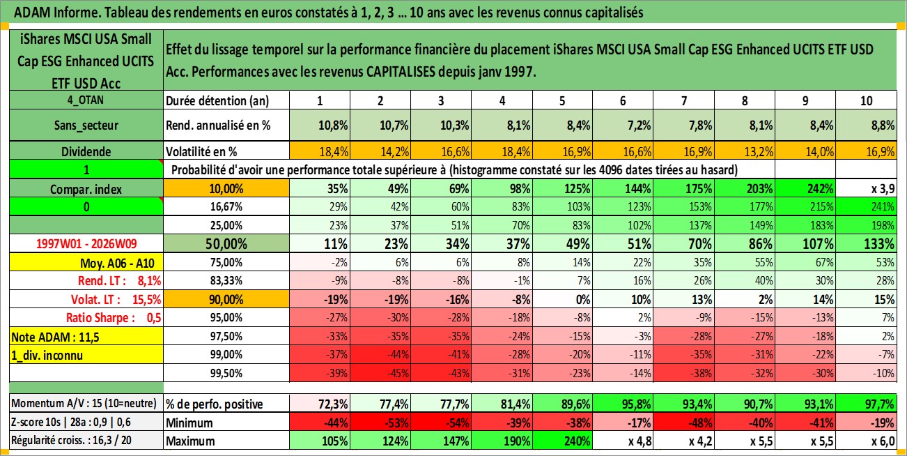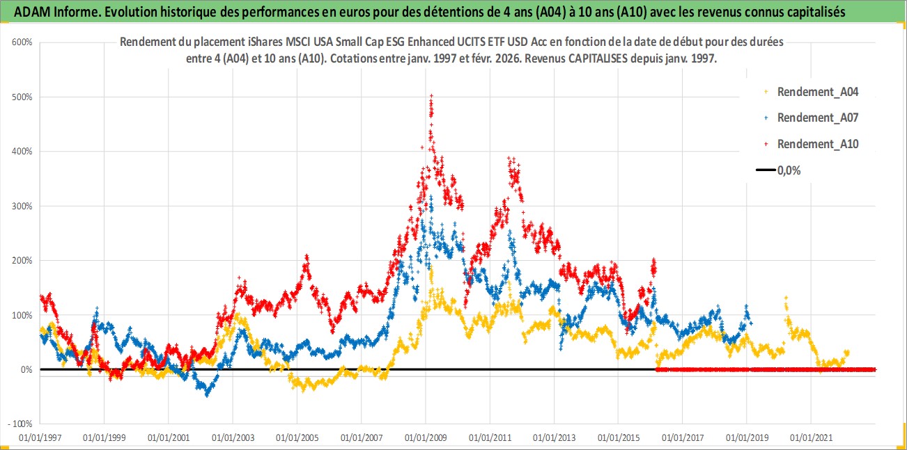 Site dédié aux investisseursPage dédiée sur site financeAnalyse des valorisations hebdomadaires du fonds iShares MSCI USA Small Cap ESG Enhanced UCITS ETF USD Acc. Cet actif est cote en USD. Les valorisations sont en contrevaleur EURO et couvrent les semaines 1997W01 a 2026W09. Les revenus de cet actif financier sont pris en compte depuis la semaine 1997W01. La note ESG de cet actif n'est pas connue.