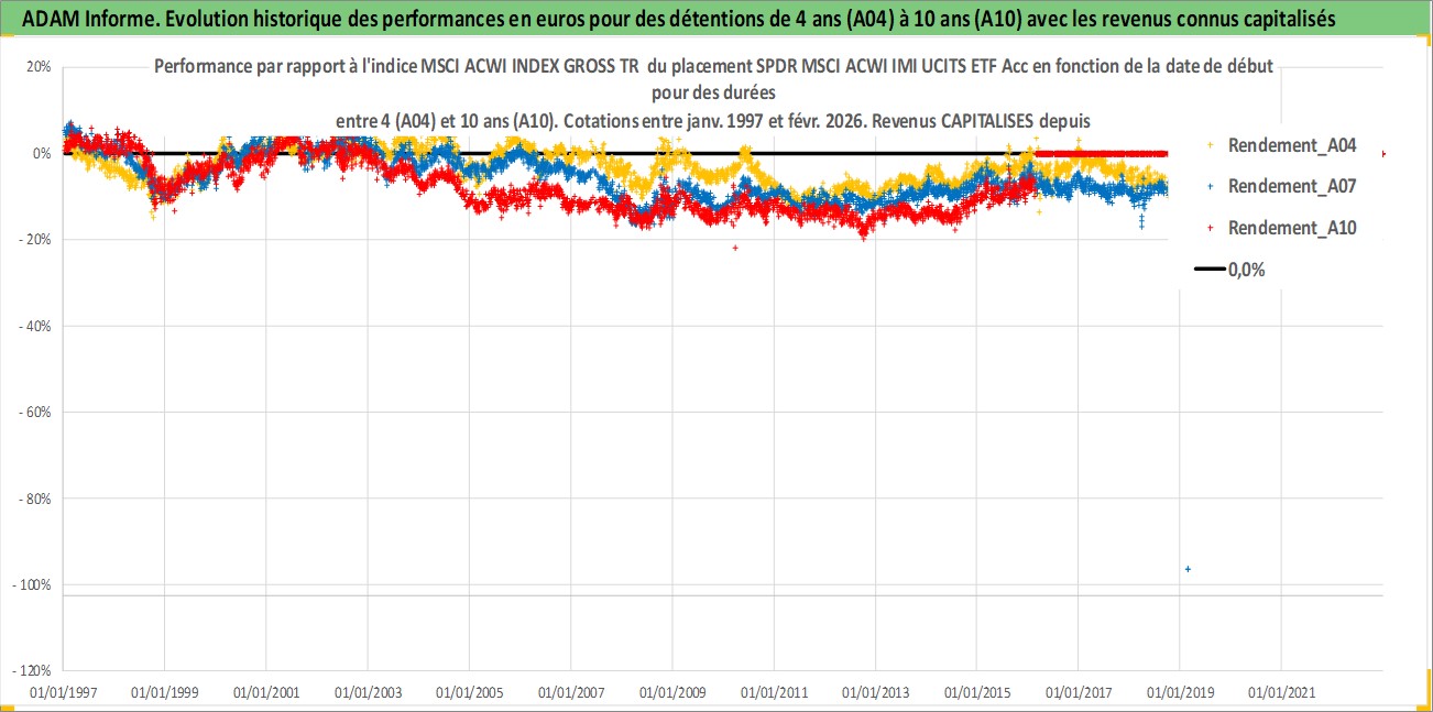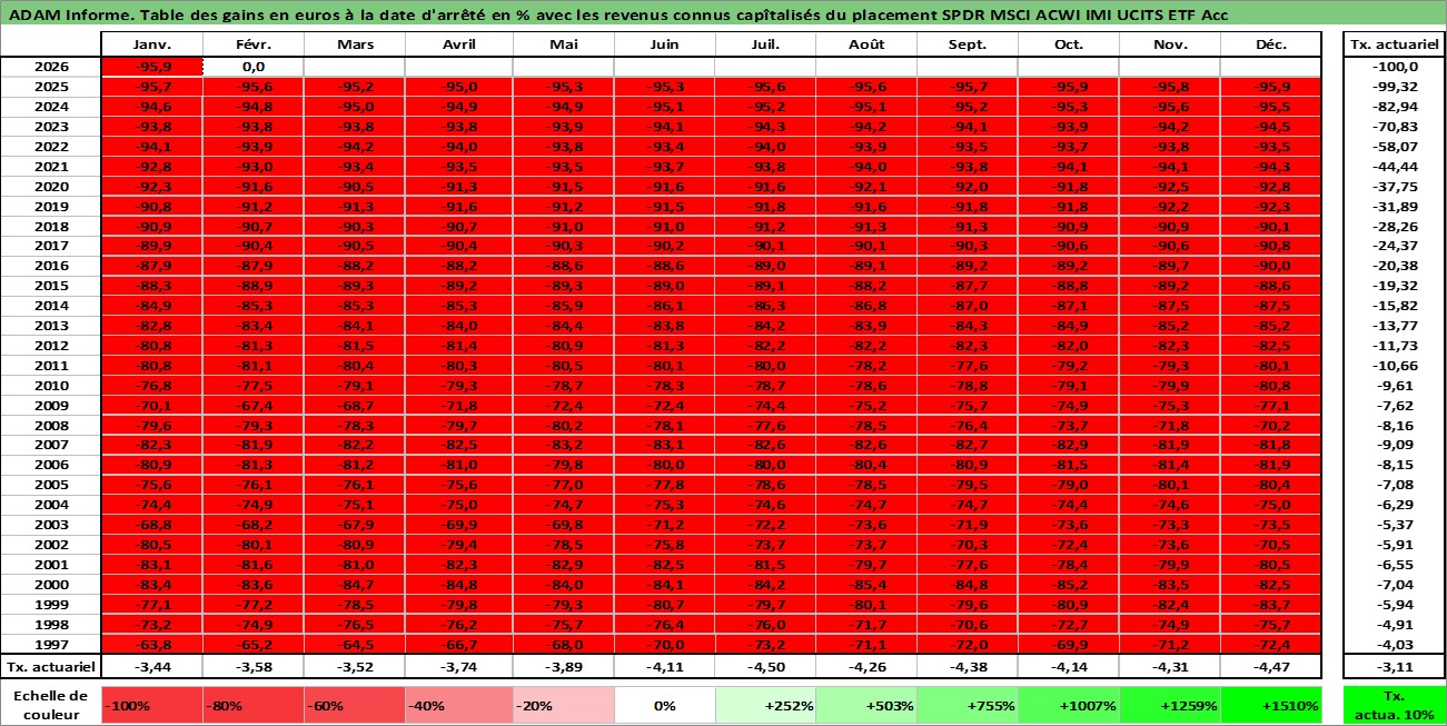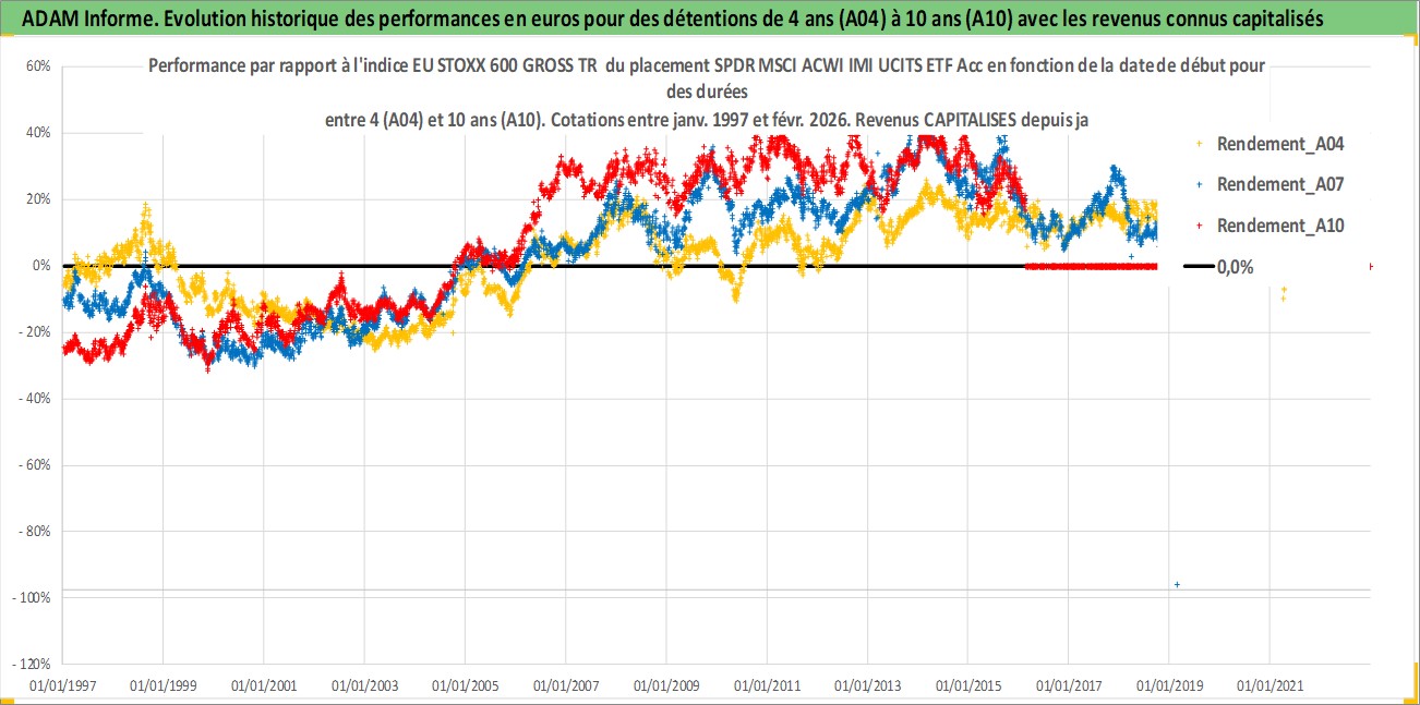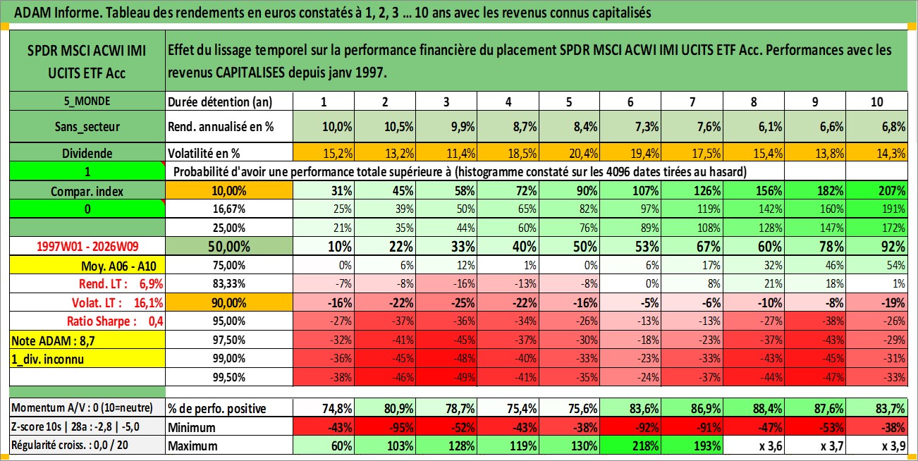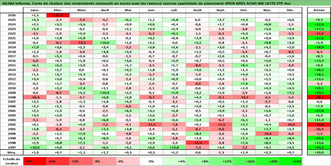 Site dédié aux investisseursPage dédiée sur site financeAnalyse des valorisations hebdomadaires du fonds SPDR MSCI ACWI IMI UCITS ETF Acc. Cet actif est cote en EUR. Les valorisations couvrent les semaines 1997W01 a 2026W09. Les revenus de cet actif financier sont pris en compte depuis la semaine 1997W01. La note ESG de cet actif n'est pas connue.