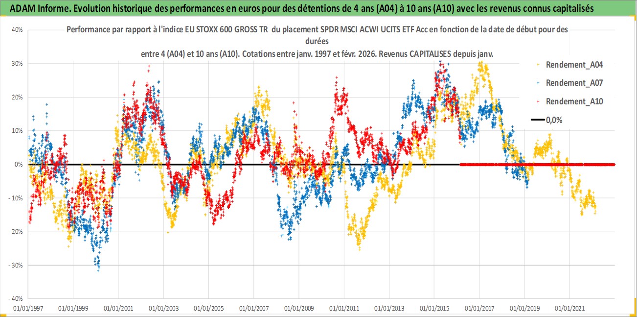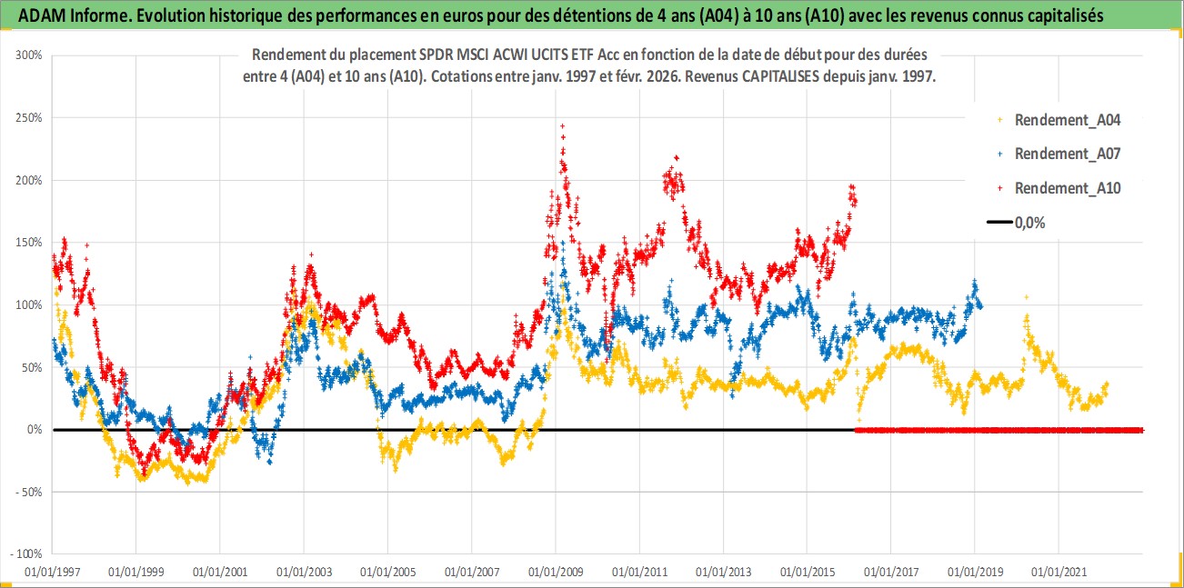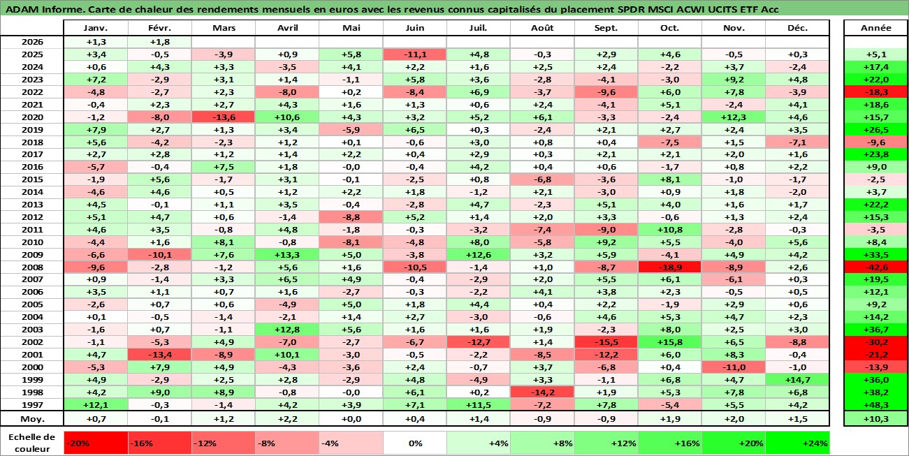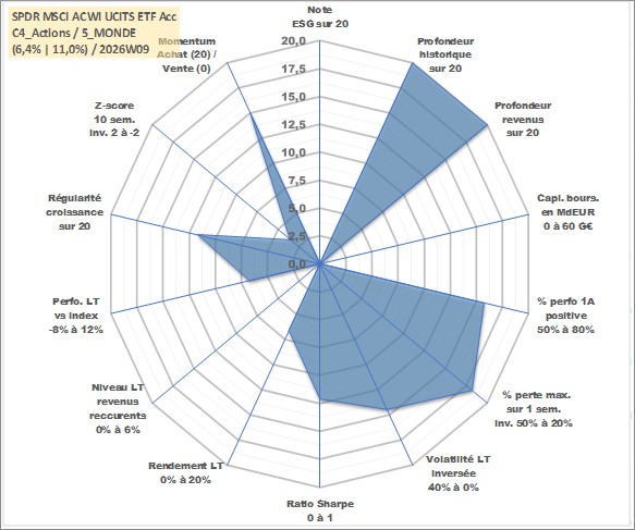 Site dédié aux investisseursPage dédiée sur site financeAnalyse des valorisations hebdomadaires du fonds SPDR MSCI ACWI UCITS ETF Acc. Cet actif est cote en EUR. Les valorisations couvrent les semaines 1997W01 a 2026W09. Les revenus de cet actif financier sont pris en compte depuis la semaine 1997W01. La note ESG de cet actif n'est pas connue.