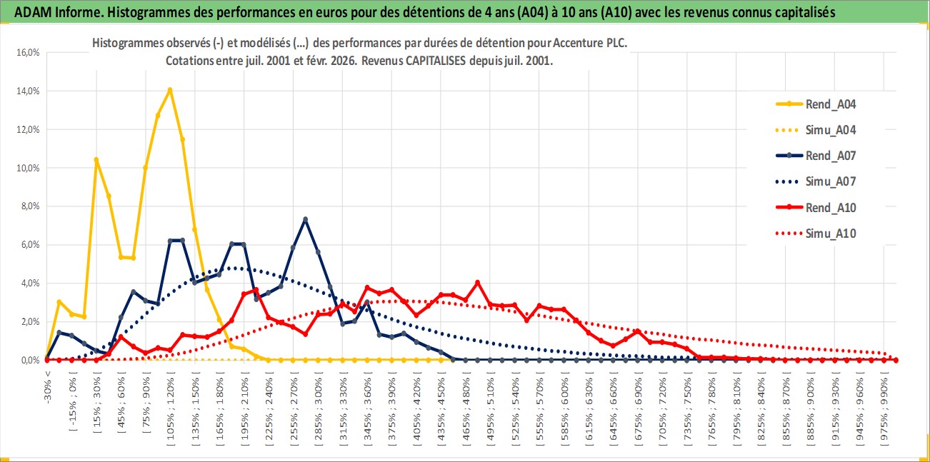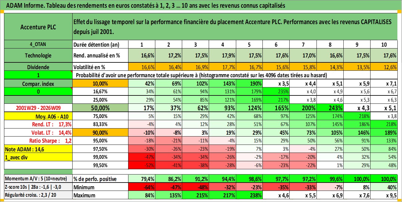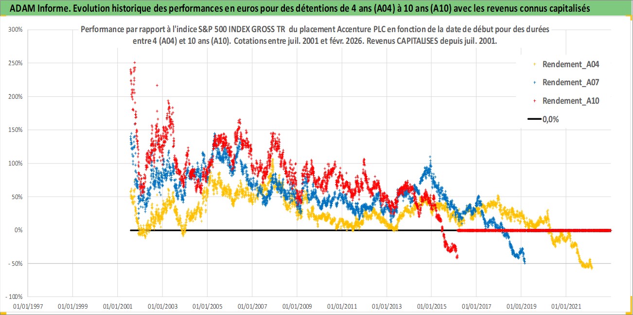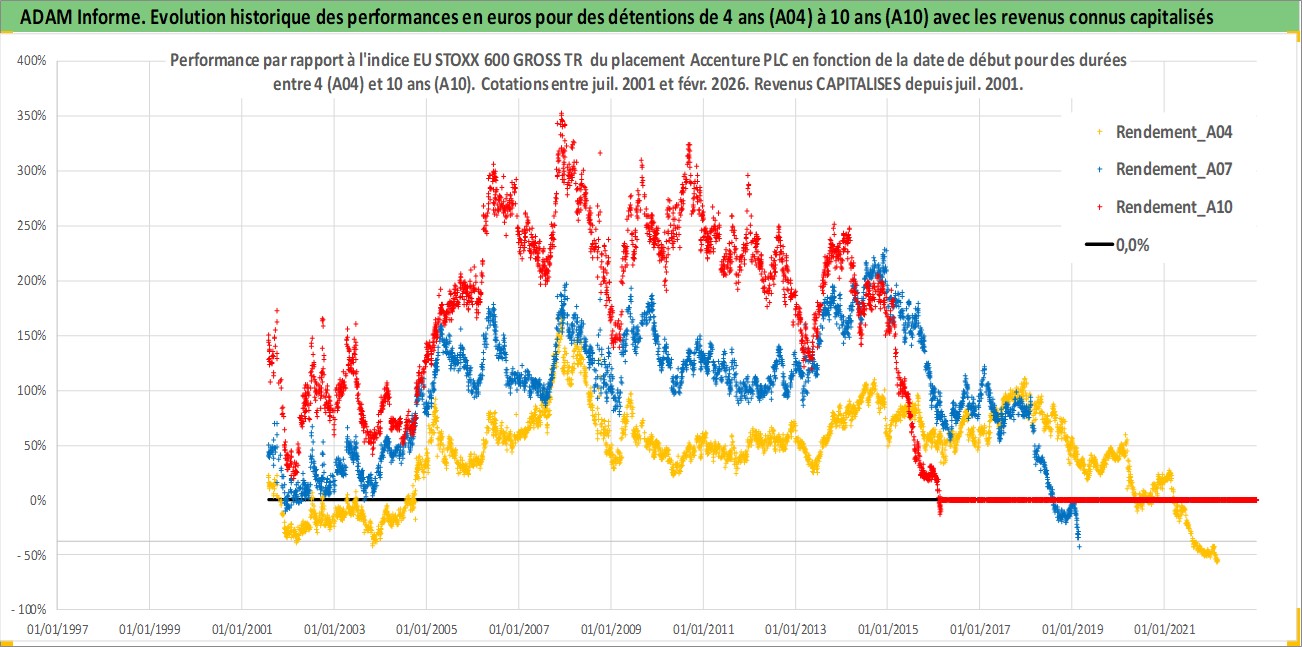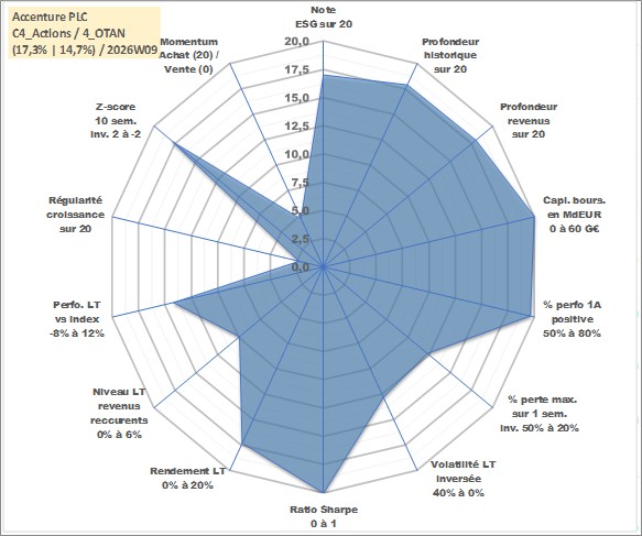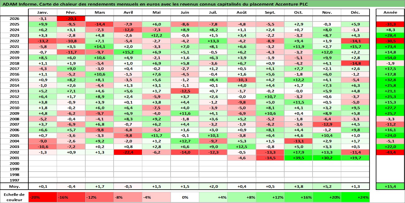 Site dédié aux investisseursPage dédiée sur site financeAnalyse des valorisations hebdomadaires de l'action Accenture PLC. Cet actif est cote en USD. Les valorisations sont en contrevaleur EURO et couvrent les semaines 2001W29 a 2026W09. Les revenus de cet actif financier sont pris en compte depuis la semaine 2001W29. La note globale ESG de cet actif est estimee a 17.0 (apres rebasage entre 0 et 20).