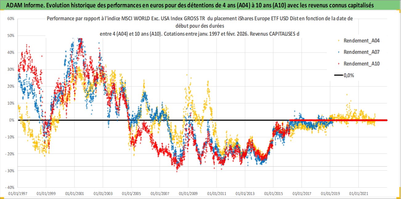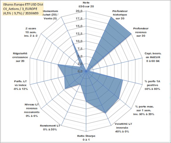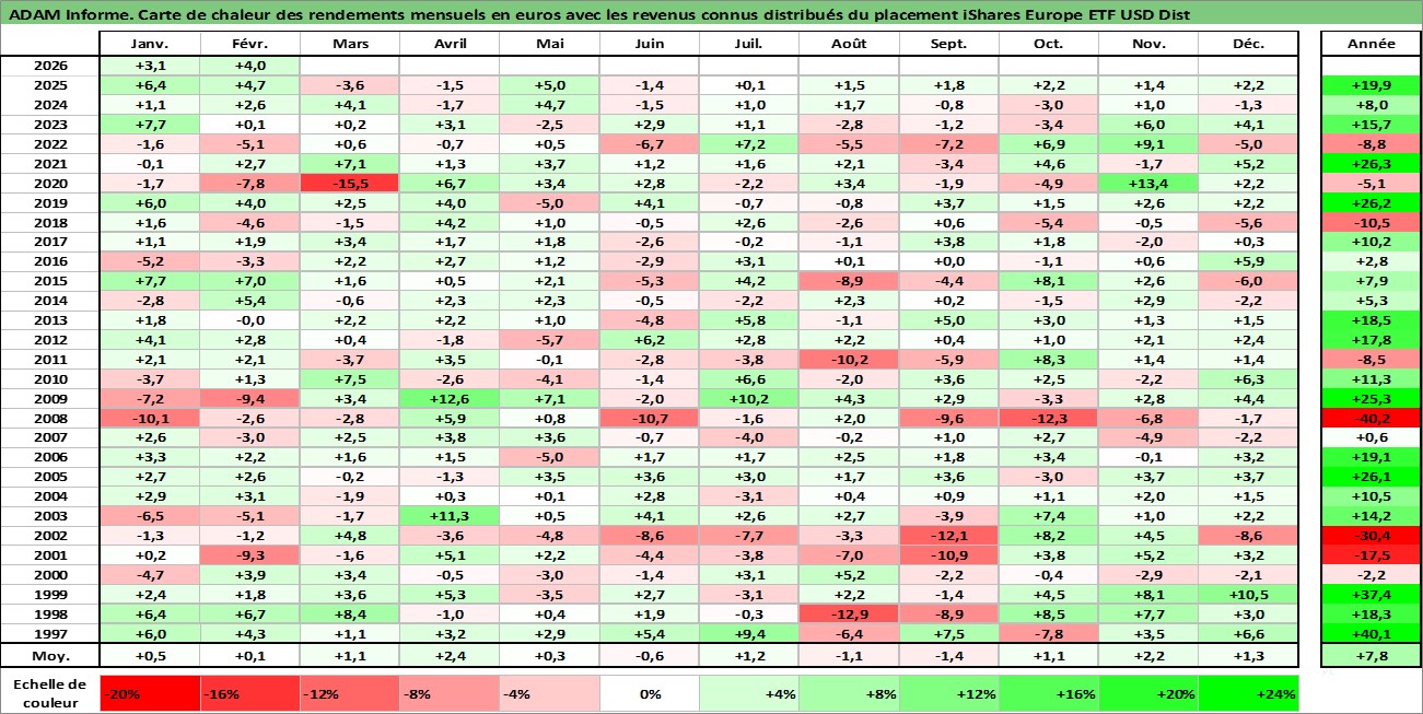 Site dédié aux investisseursPage dédiée sur site financeAnalyse des valorisations hebdomadaires du fonds iShares Europe ETF USD Dist. Cet actif est cote en USD. Les valorisations sont en contrevaleur EURO et couvrent les semaines 1997W01 a 2026W09. Les revenus de cet actif financier sont pris en compte depuis la semaine 1997W11. La note ESG de cet actif n'est pas connue.