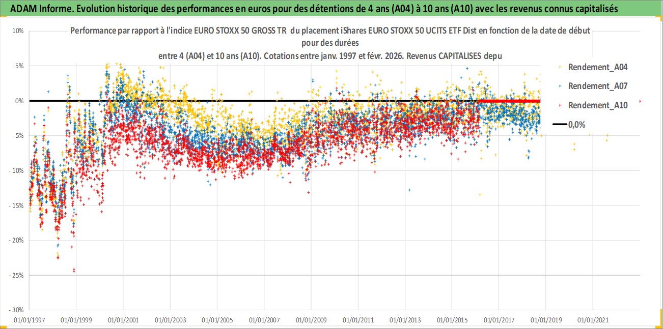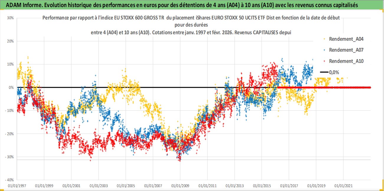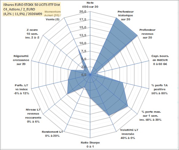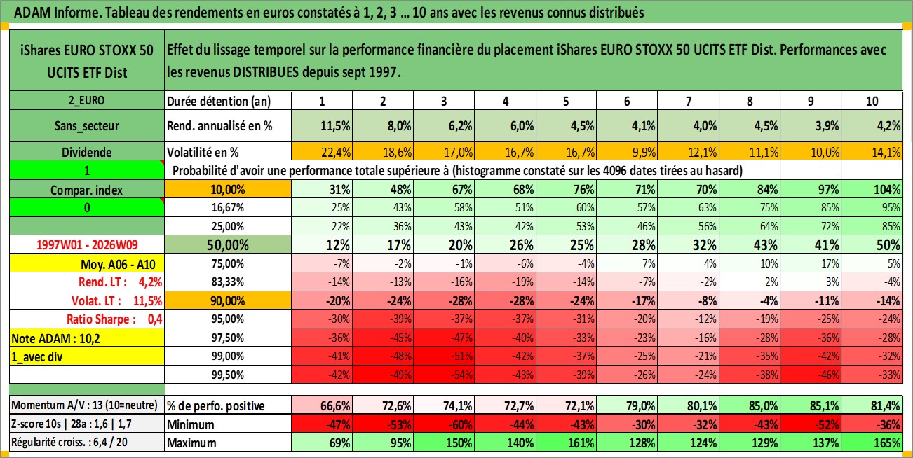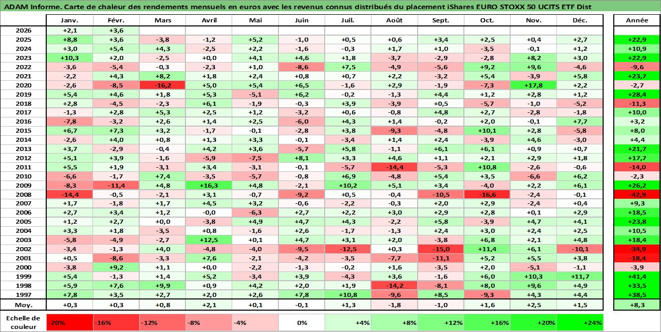 Site dédié aux investisseursPage dédiée sur site financeAnalyse des valorisations hebdomadaires du fonds iShares EURO STOXX 50 UCITS ETF Dist. Cet actif est cote en EUR. Les valorisations couvrent les semaines 1997W01 a 2026W09. Les revenus de cet actif financier sont pris en compte depuis la semaine 1997W40. La note ESG de cet actif n'est pas connue.