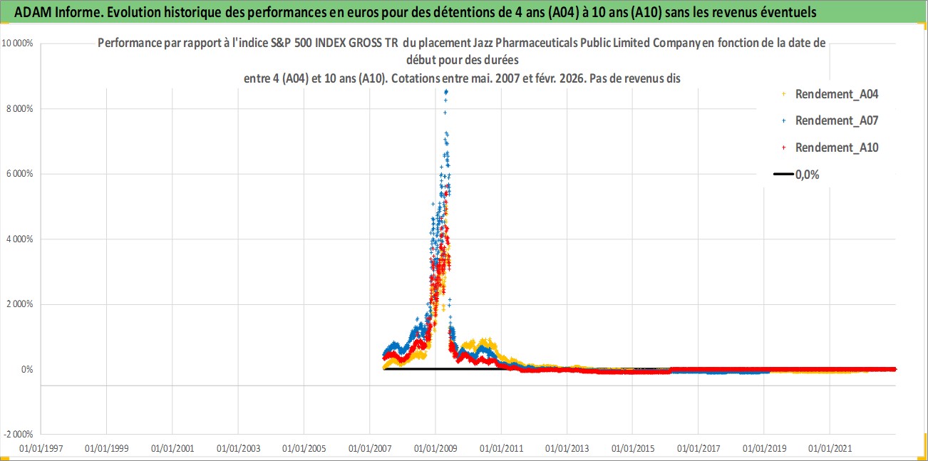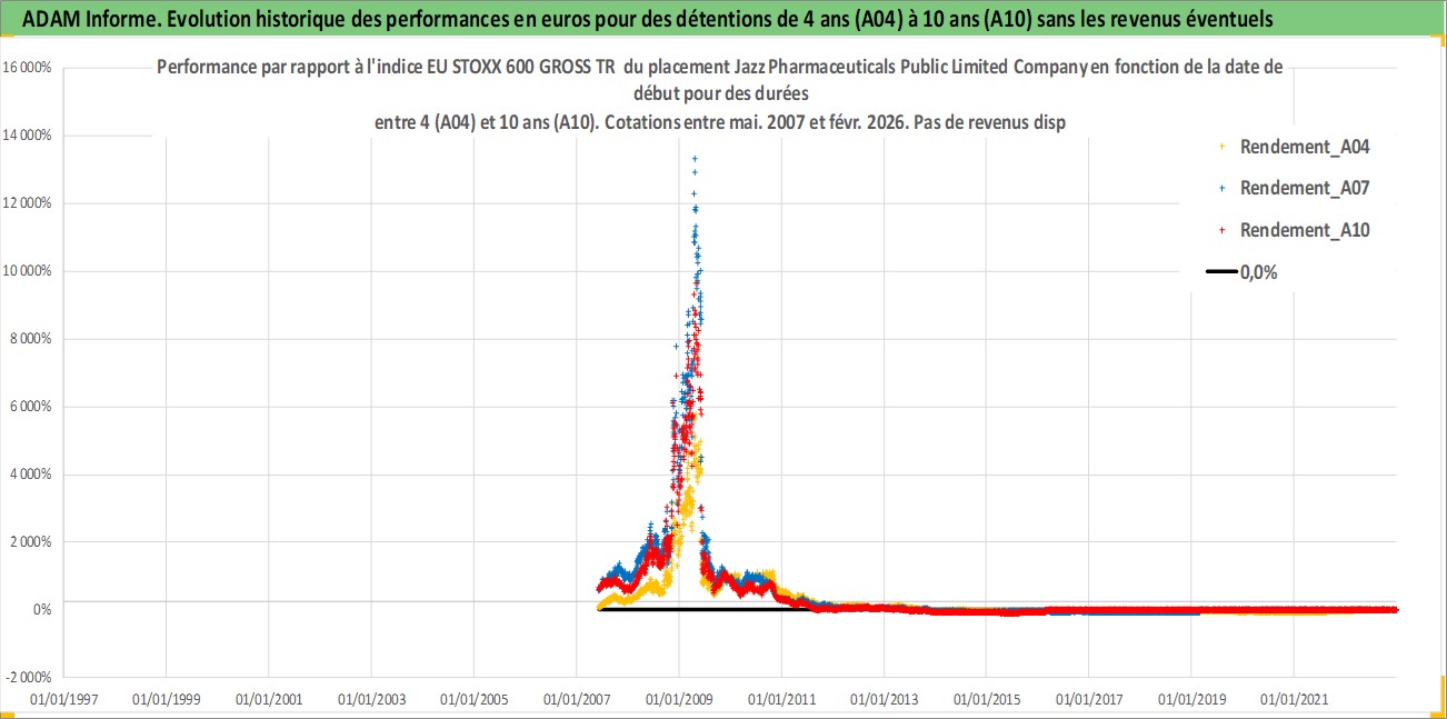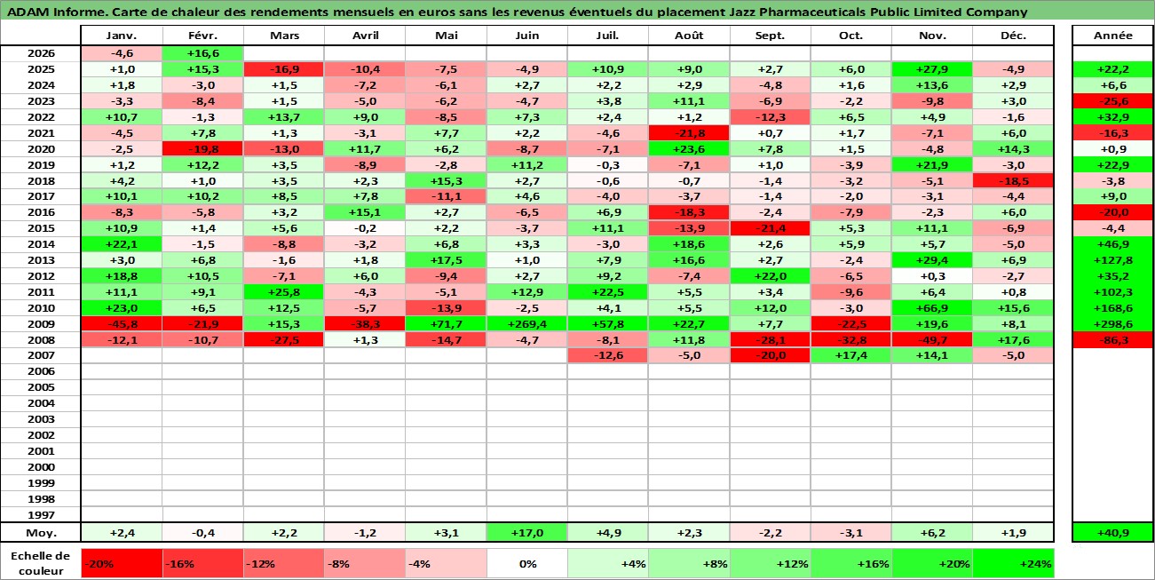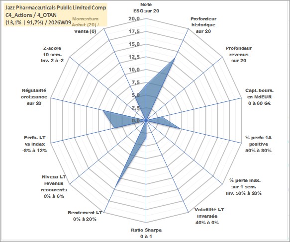 Site dédié aux investisseursPage dédiée sur site financeAnalyse des valorisations hebdomadaires de l'action Jazz Pharmaceuticals Public Limited Company. Cet actif est cote en USD. Les valorisations sont en contrevaleur EURO et couvrent les semaines 2007W22 a 2026W09. Les revenus de cet actif financier ne sont pas connus car non existants ou non disponibles sur le site Yahoo Finance. La note globale ESG de cet actif est estimee a 7.0 (apres rebasage entre 0 et 20).