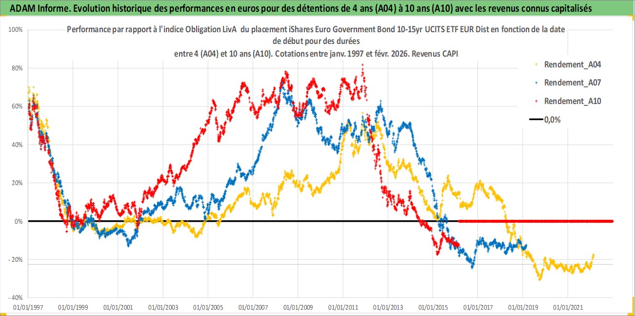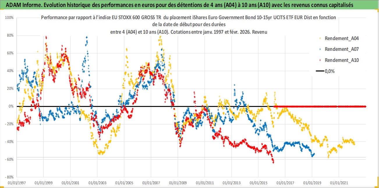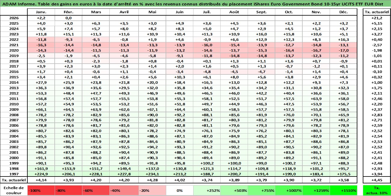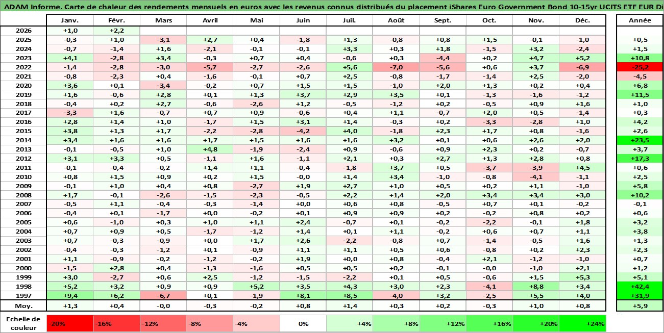 Site dédié aux investisseursPage dédiée sur site financeAnalyse des valorisations hebdomadaires du fonds iShares Euro Government Bond 10-15yr UCITS ETF EUR Dist. Cet actif est cote en EUR. Les valorisations couvrent les semaines 1997W01 a 2026W09. Les revenus de cet actif financier sont pris en compte depuis la semaine 1997W26. La note ESG de cet actif n'est pas connue.