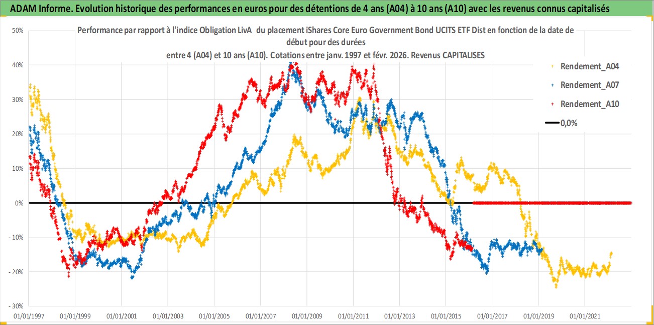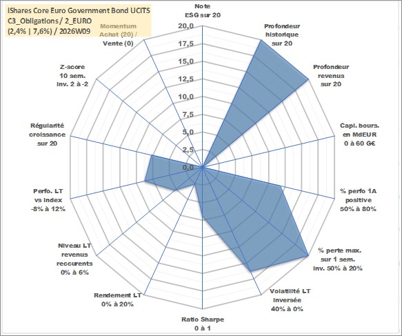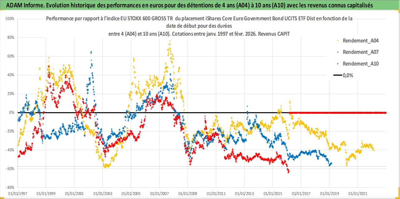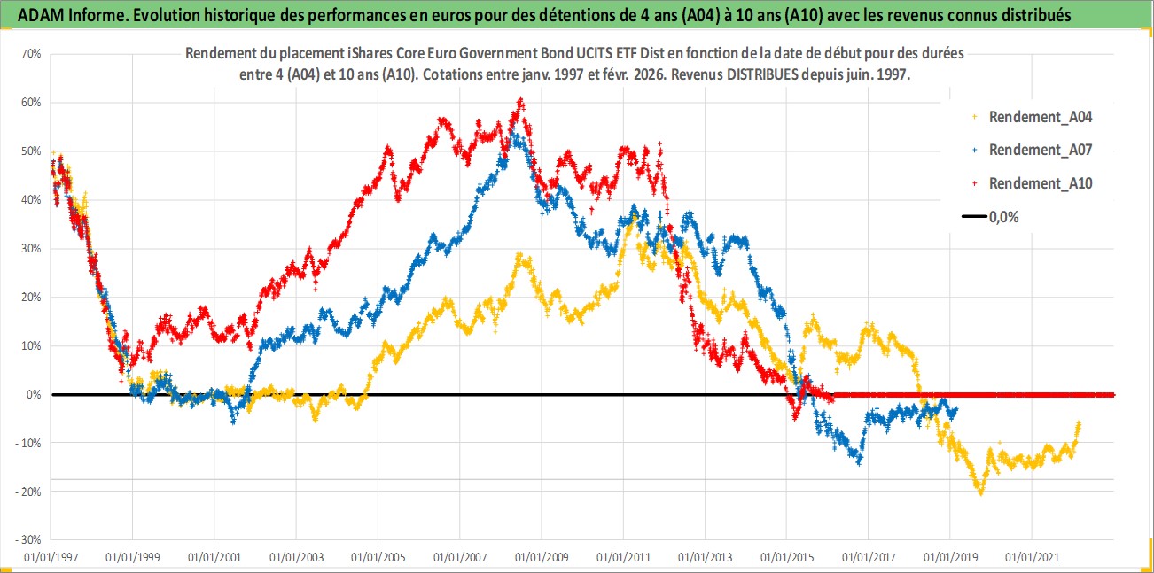 Site dédié aux investisseursPage dédiée sur site financeAnalyse des valorisations hebdomadaires du fonds iShares Core Euro Government Bond UCITS ETF Dist. Cet actif est cote en EUR. Les valorisations couvrent les semaines 1997W01 a 2026W09. Les revenus de cet actif financier sont pris en compte depuis la semaine 1997W24. La note ESG de cet actif n'est pas connue.