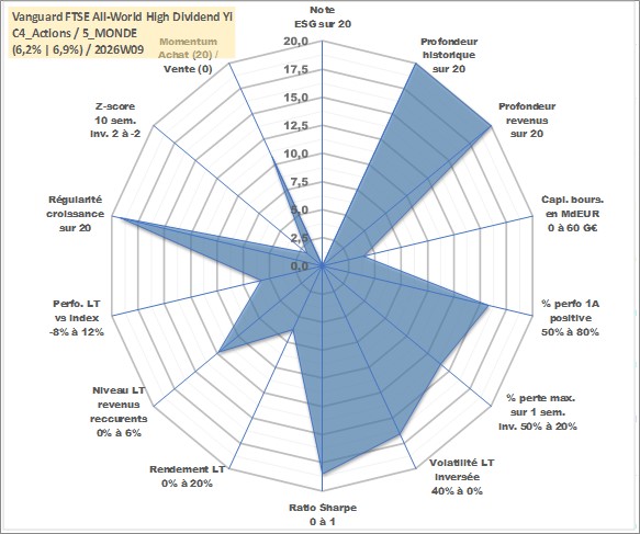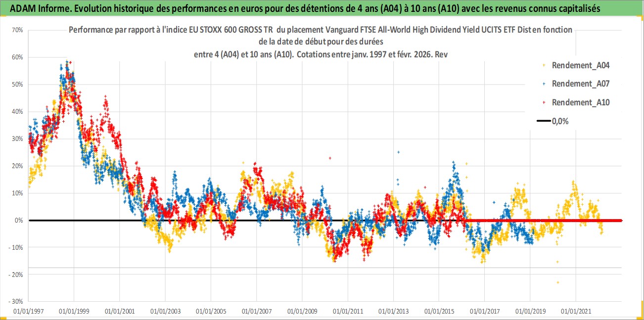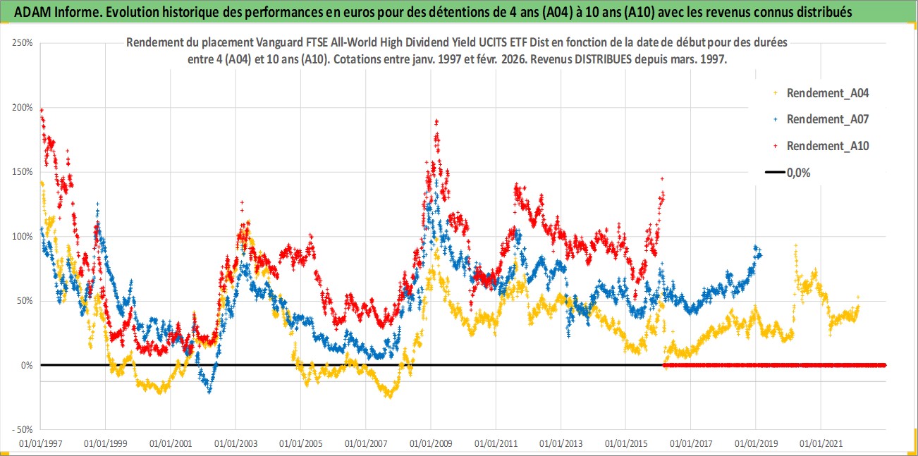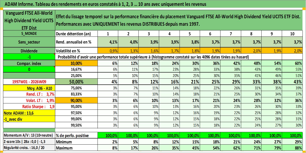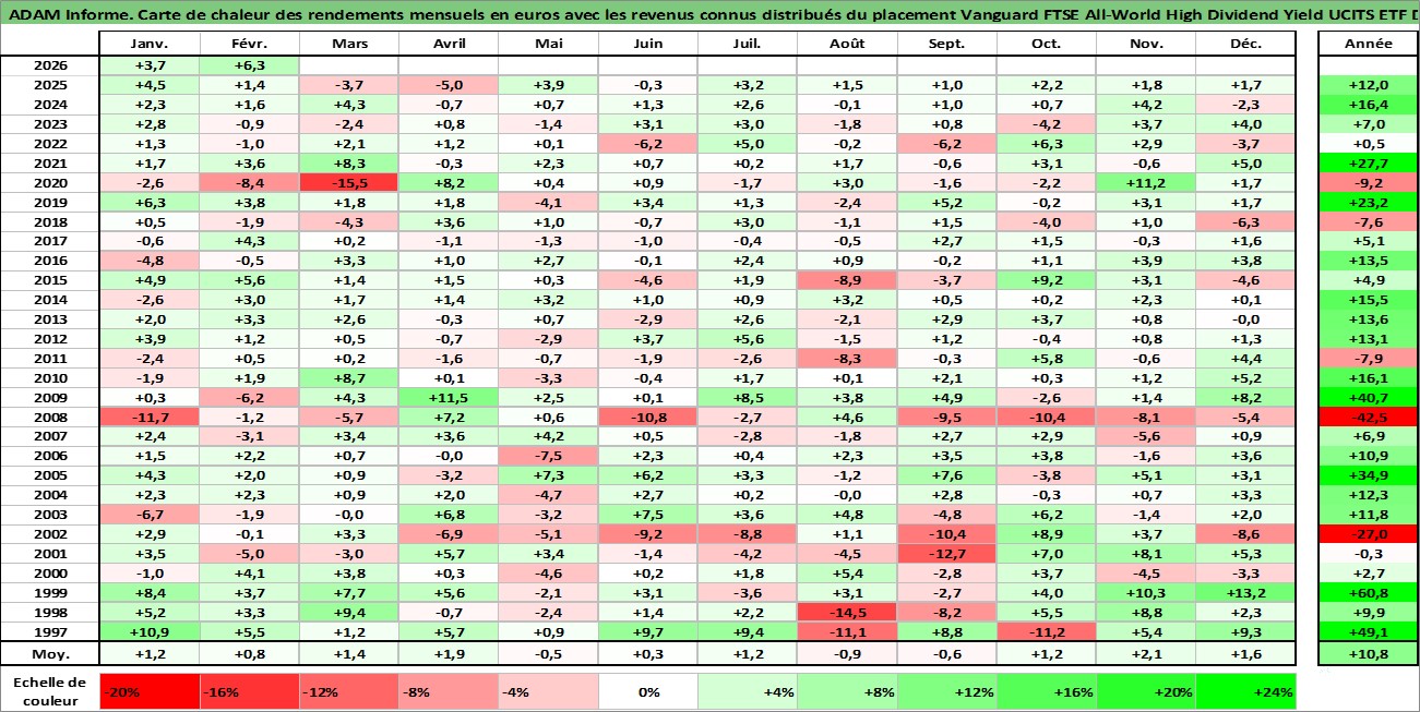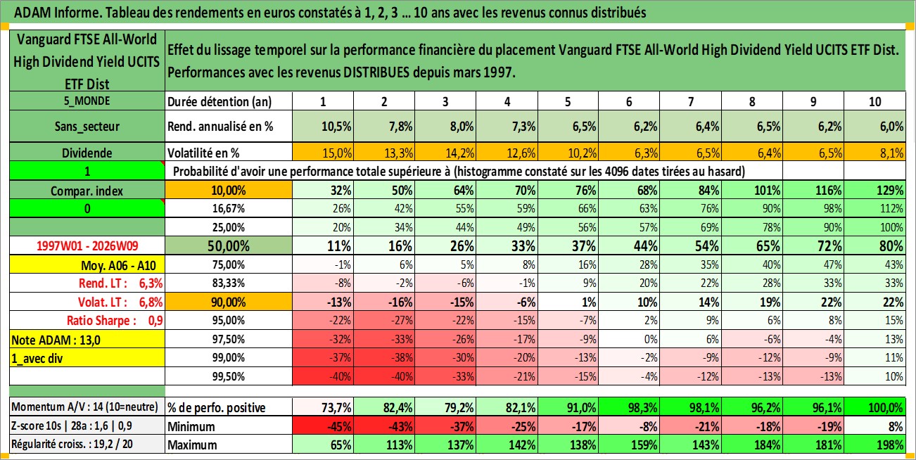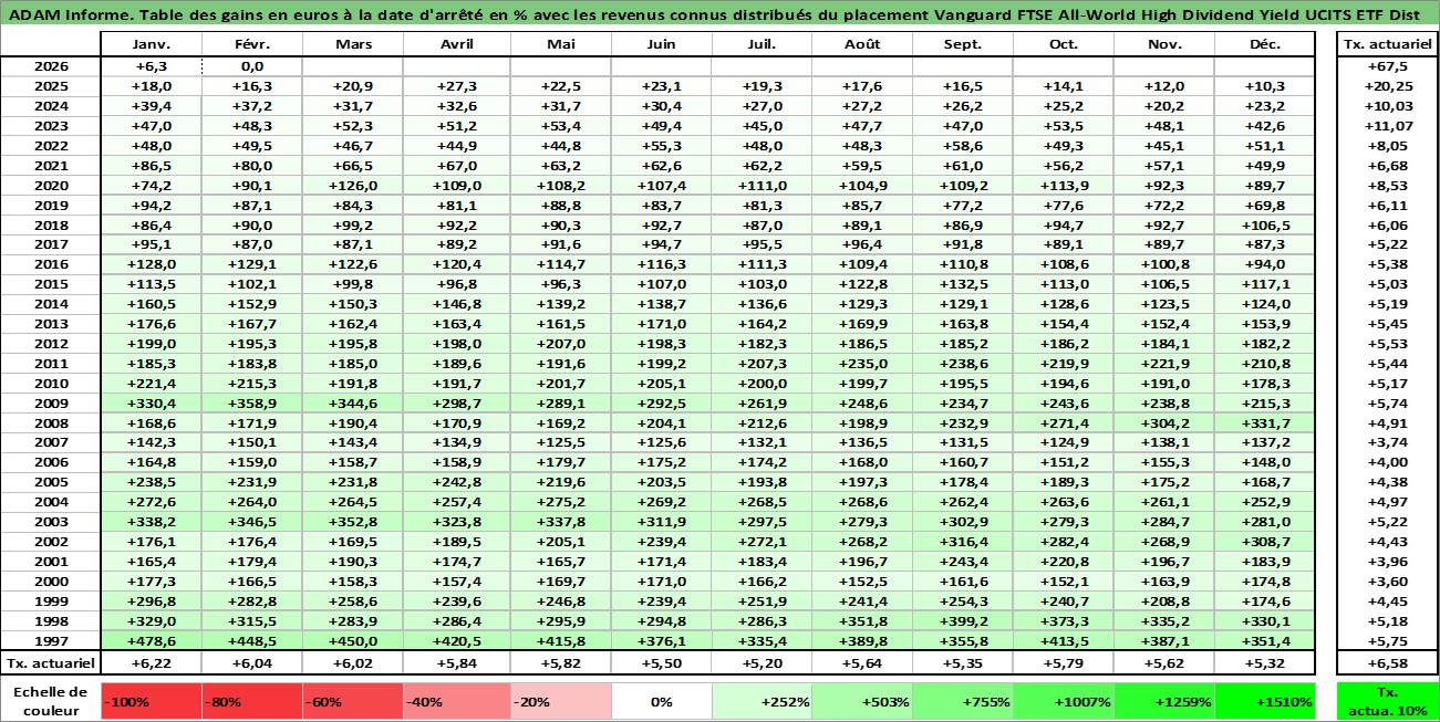 Site dédié aux investisseursPage dédiée sur site financeAnalyse des valorisations hebdomadaires du fonds Vanguard FTSE All-World High Dividend Yield UCITS ETF Dist. Cet actif est cote en GBP. Les valorisations sont en contrevaleur EURO et couvrent les semaines 1997W01 a 2026W09. Les revenus de cet actif financier sont pris en compte depuis la semaine 1997W12. La note ESG de cet actif n'est pas connue.