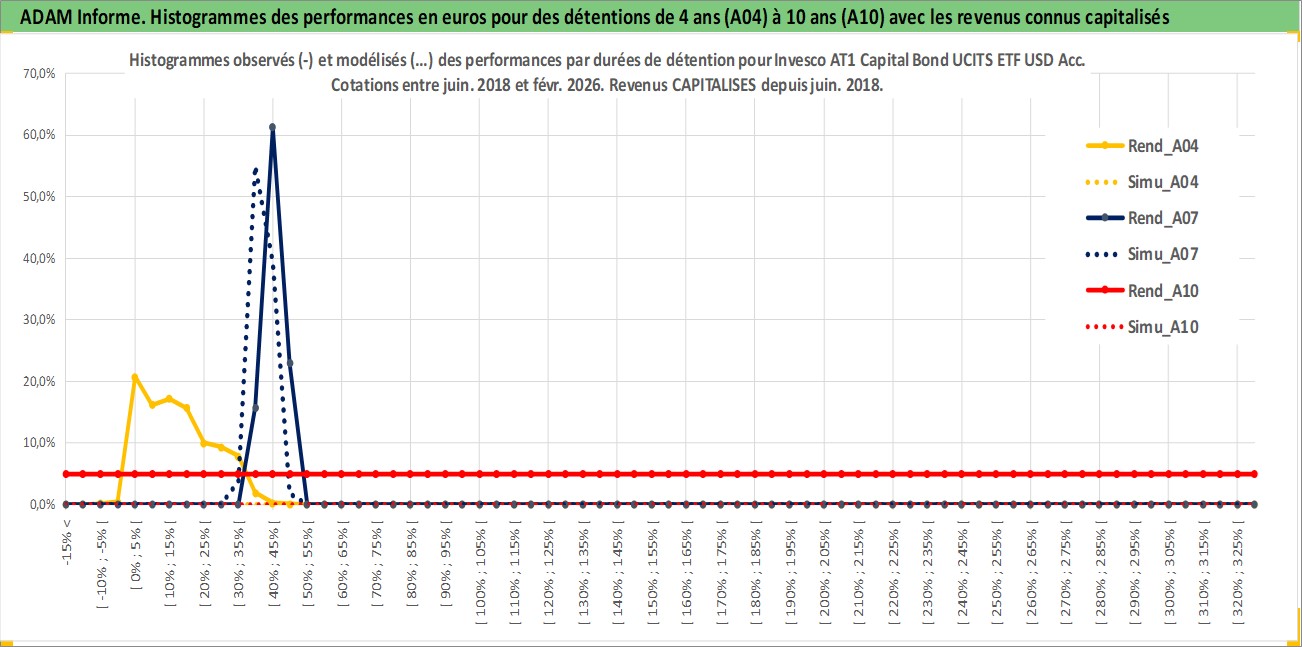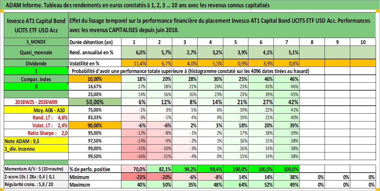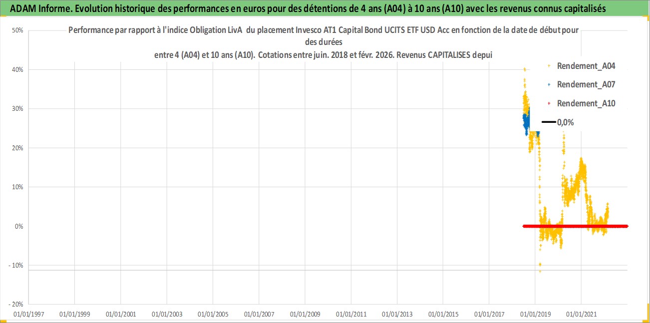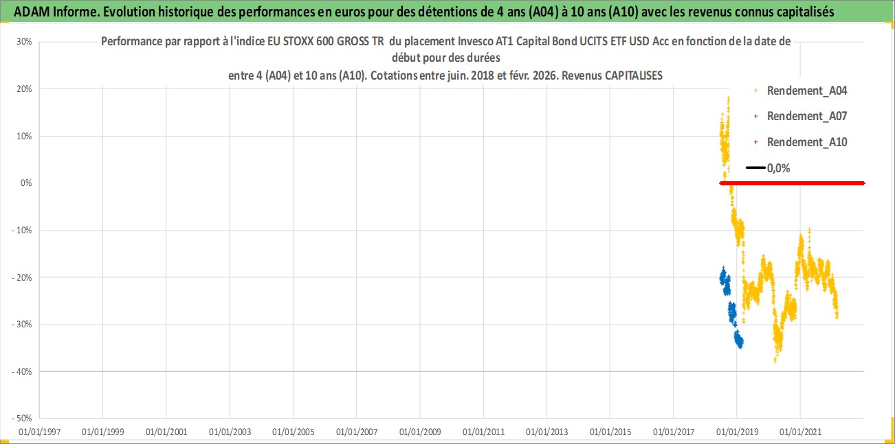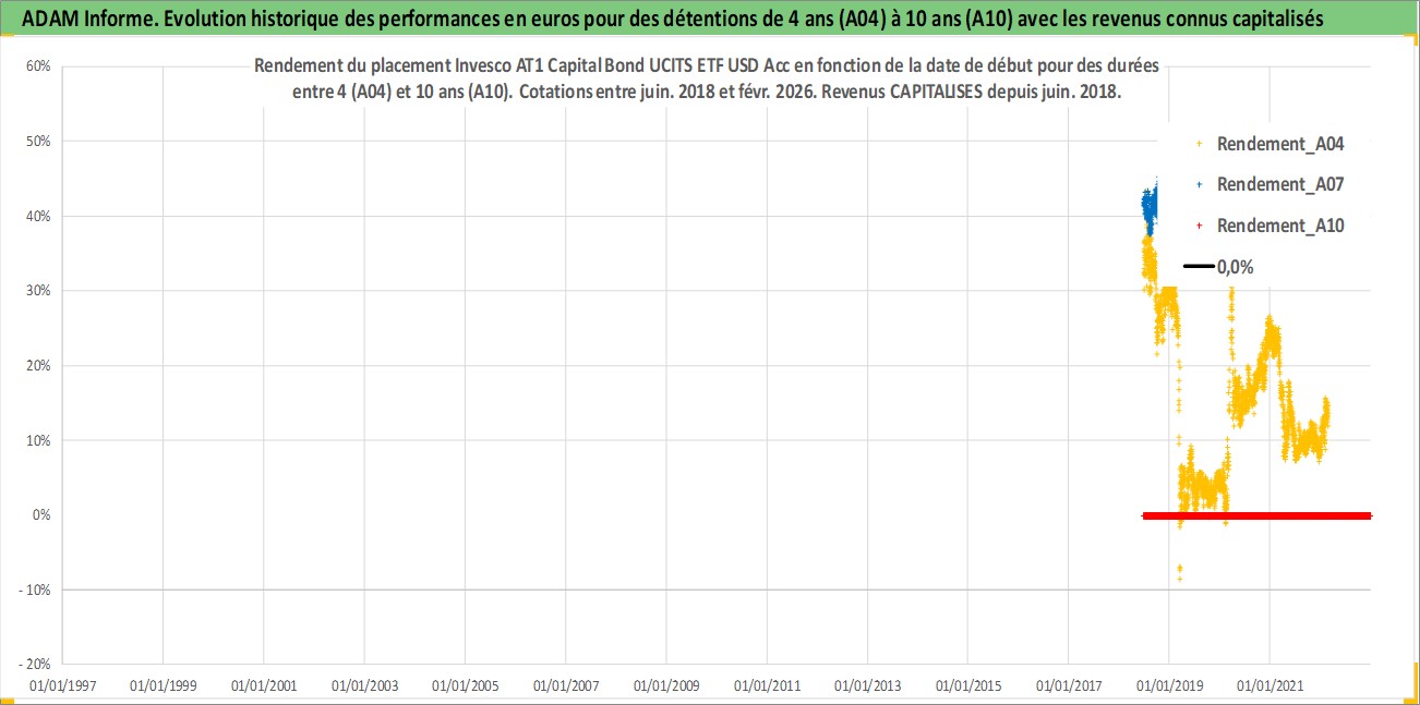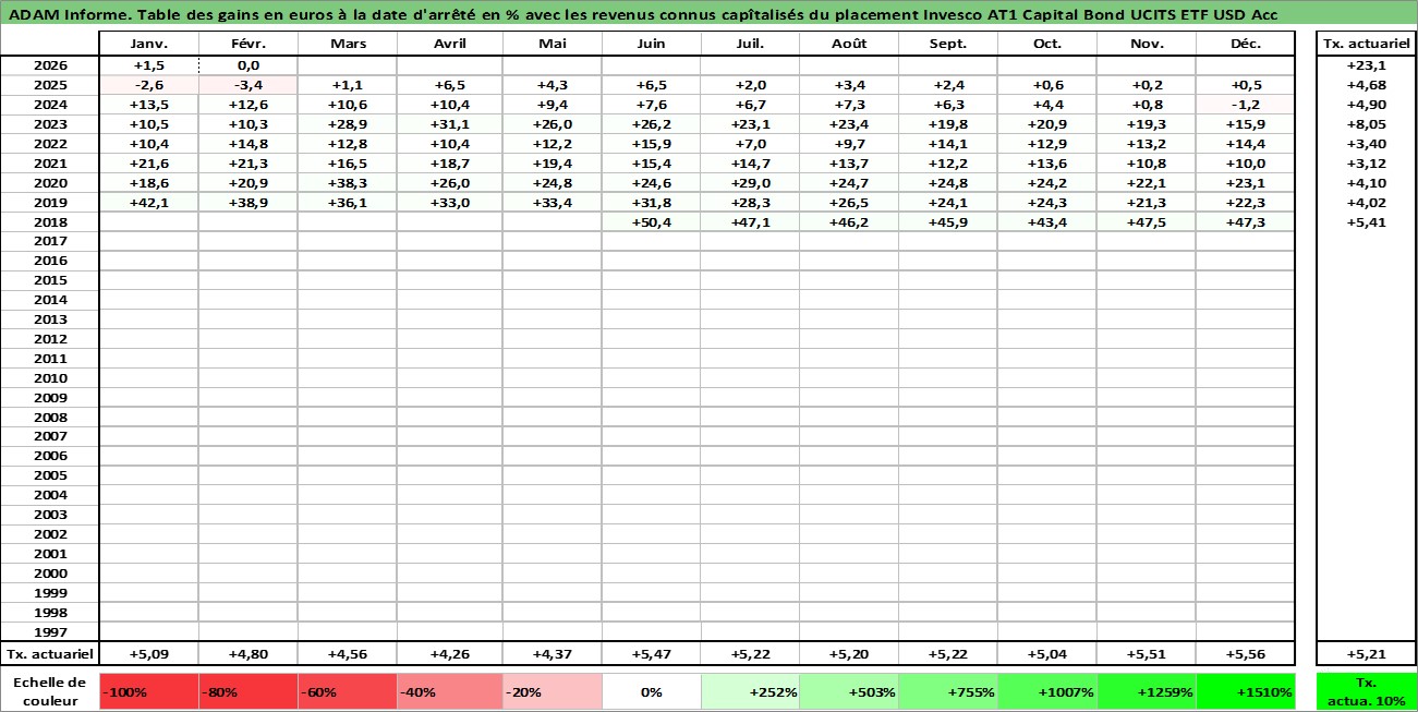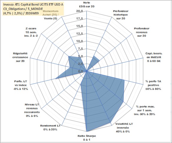 Site dédié aux investisseursPage dédiée sur site financeAnalyse des valorisations hebdomadaires du fonds Invesco AT1 Capital Bond UCITS ETF USD Acc. Cet actif est cote en USD. Les valorisations sont en contrevaleur EURO et couvrent les semaines 2018W25 a 2026W09. Les revenus de cet actif financier sont pris en compte depuis la semaine 2018W25. La note ESG de cet actif n'est pas connue.