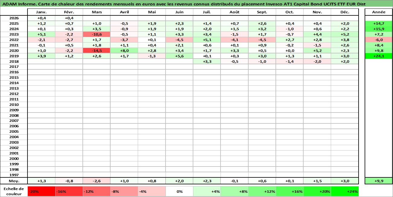 Site dédié aux investisseursPage dédiée sur site financeAnalyse des valorisations hebdomadaires du fonds Invesco AT1 Capital Bond UCITS ETF EUR Dist. Cet actif est cote en EUR. Les valorisations couvrent les semaines 2018W25 a 2026W09. Les revenus de cet actif financier sont pris en compte depuis la semaine 2018W50. La note ESG de cet actif n'est pas connue.