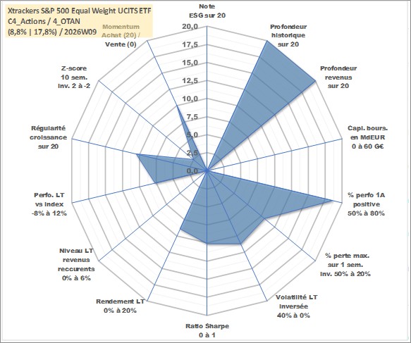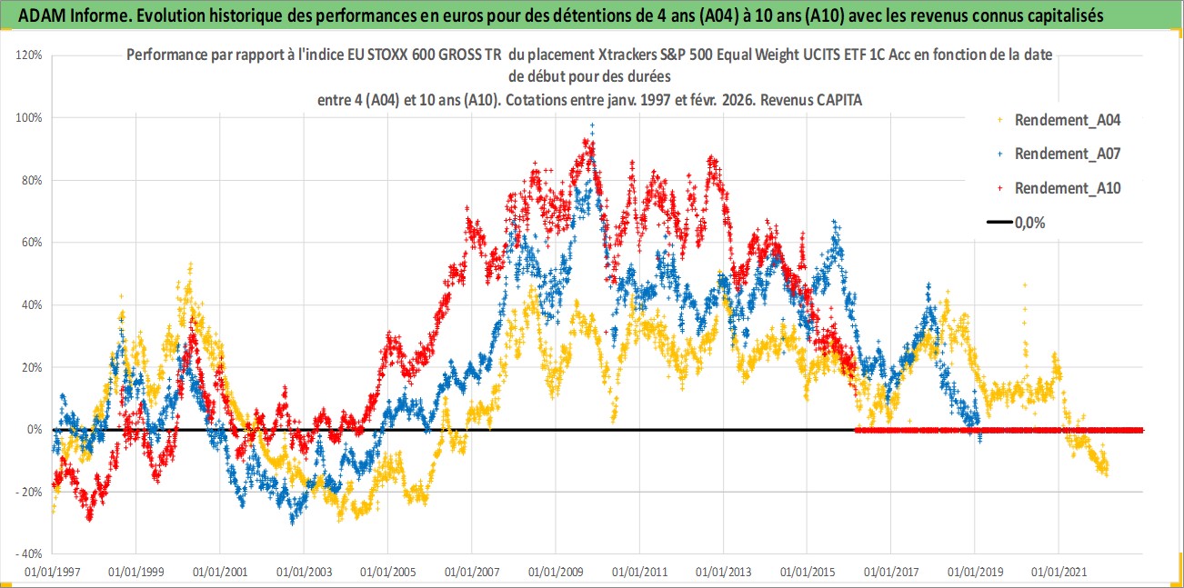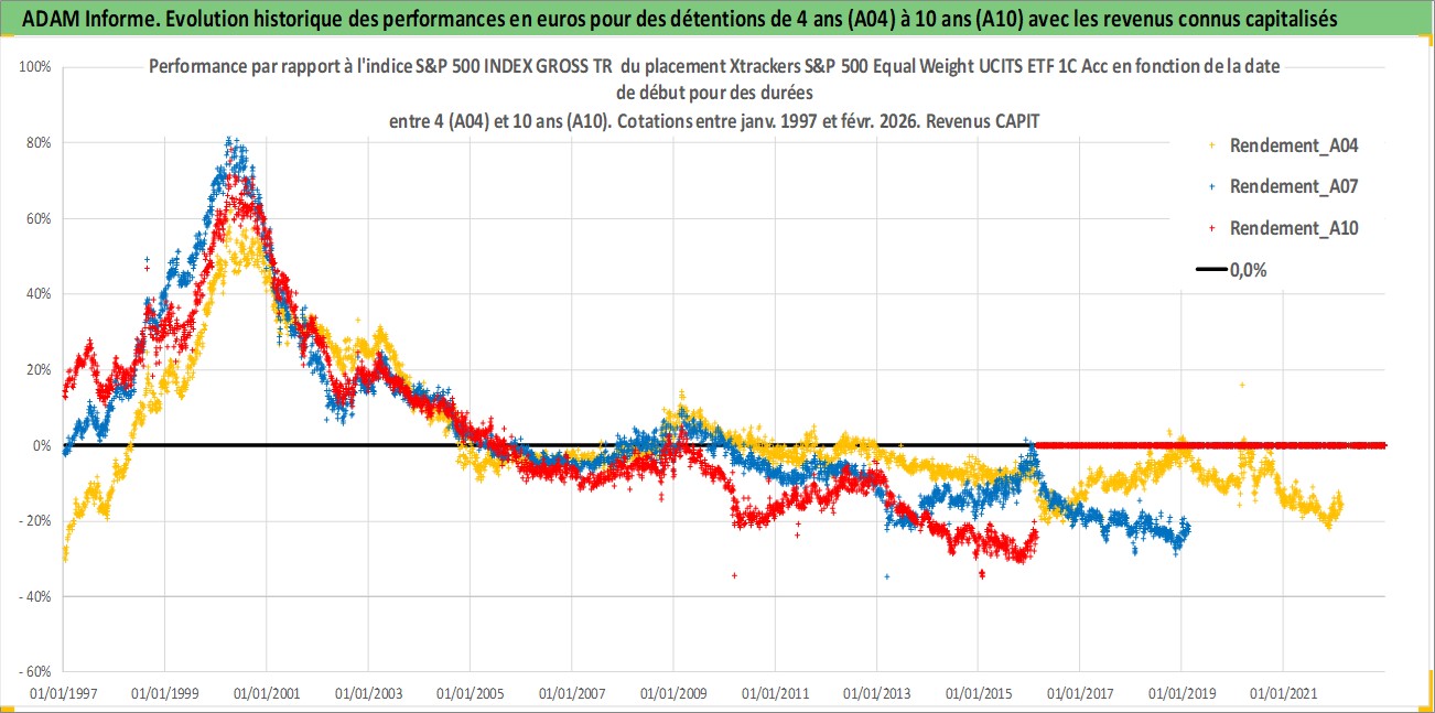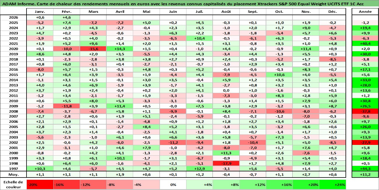 Site dédié aux investisseursPage dédiée sur site financeAnalyse des valorisations hebdomadaires du fonds Xtrackers S&P 500 Equal Weight UCITS ETF 1C Acc. Cet actif est cote en USD. Les valorisations sont en contrevaleur EURO et couvrent les semaines 1997W01 a 2026W09. Les revenus de cet actif financier sont pris en compte depuis la semaine 1997W01. La note ESG de cet actif n'est pas connue.