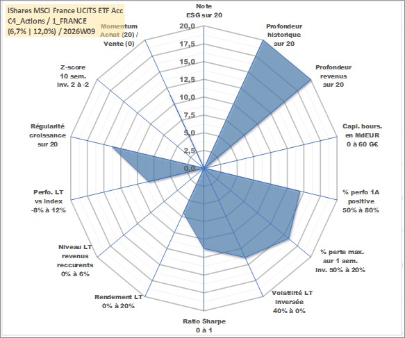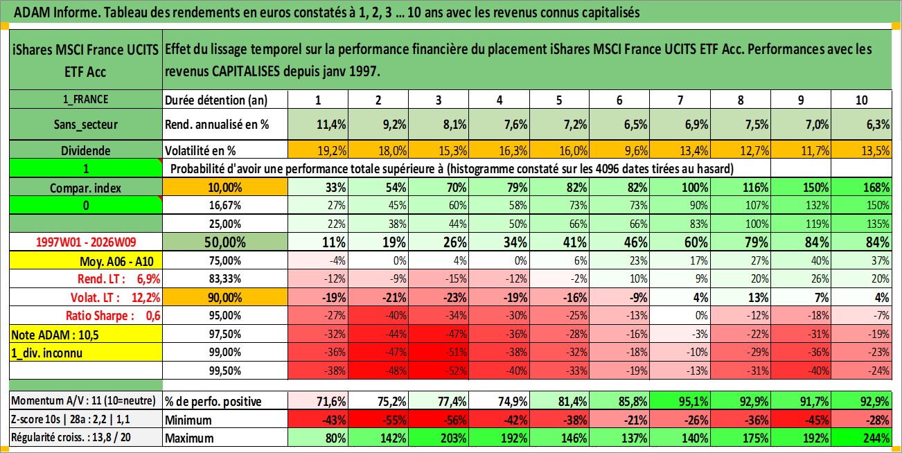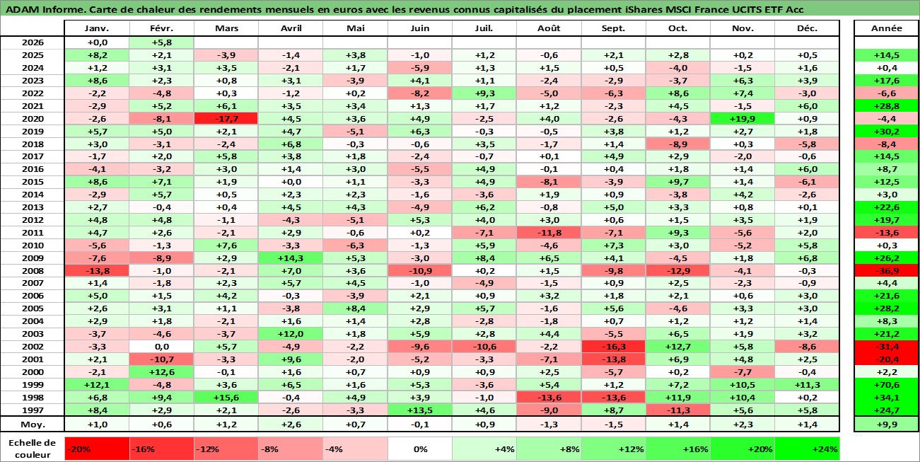 Site dédié aux investisseursPage dédiée sur site financeAnalyse des valorisations hebdomadaires du fonds iShares MSCI France UCITS ETF Acc. Cet actif est cote en EUR. Les valorisations couvrent les semaines 1997W01 a 2026W09. Les revenus de cet actif financier sont pris en compte depuis la semaine 1997W01. La note ESG de cet actif n'est pas connue.