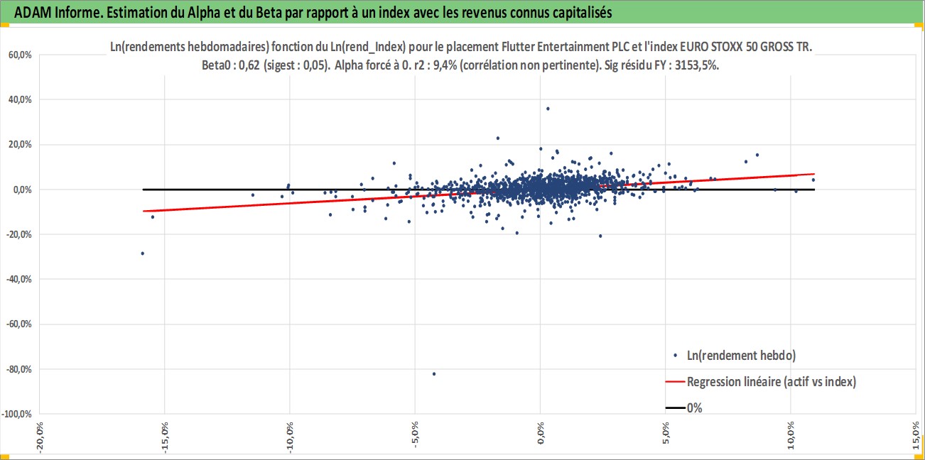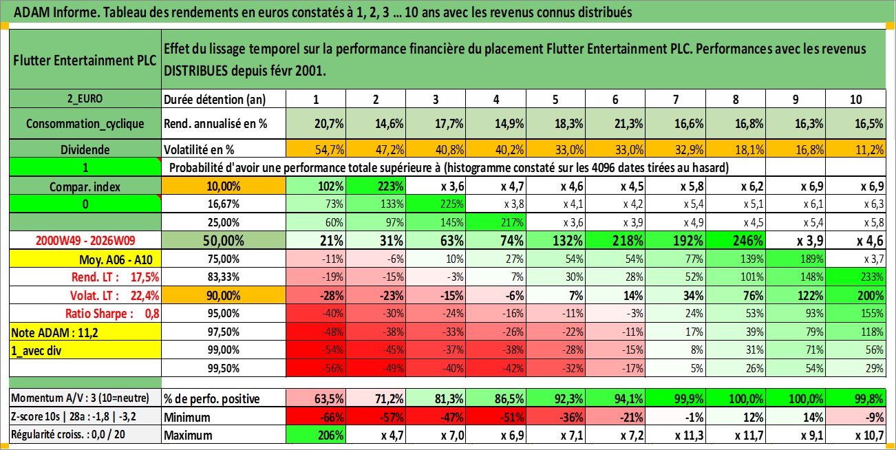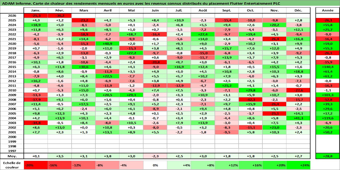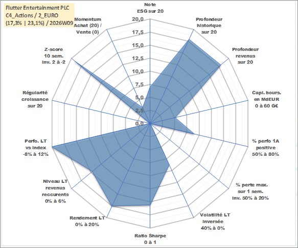 Site dédié aux investisseursPage dédiée sur site financeAnalyse des valorisations hebdomadaires de l'action Flutter Entertainment PLC. Cet actif est cote en GBX. Les valorisations sont en contrevaleur EURO et couvrent les semaines 2000W49 a 2026W09. Les revenus de cet actif financier sont pris en compte depuis la semaine 2001W09. La note globale ESG de cet actif est estimee a 7.0 (apres rebasage entre 0 et 20).