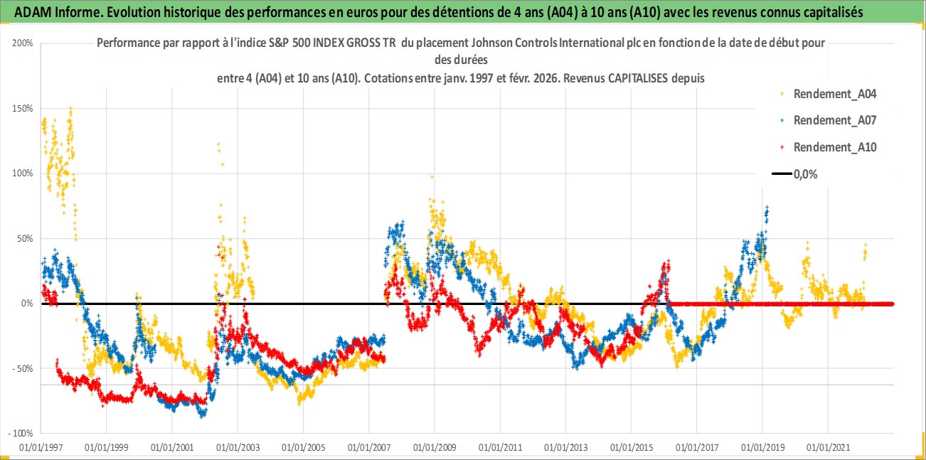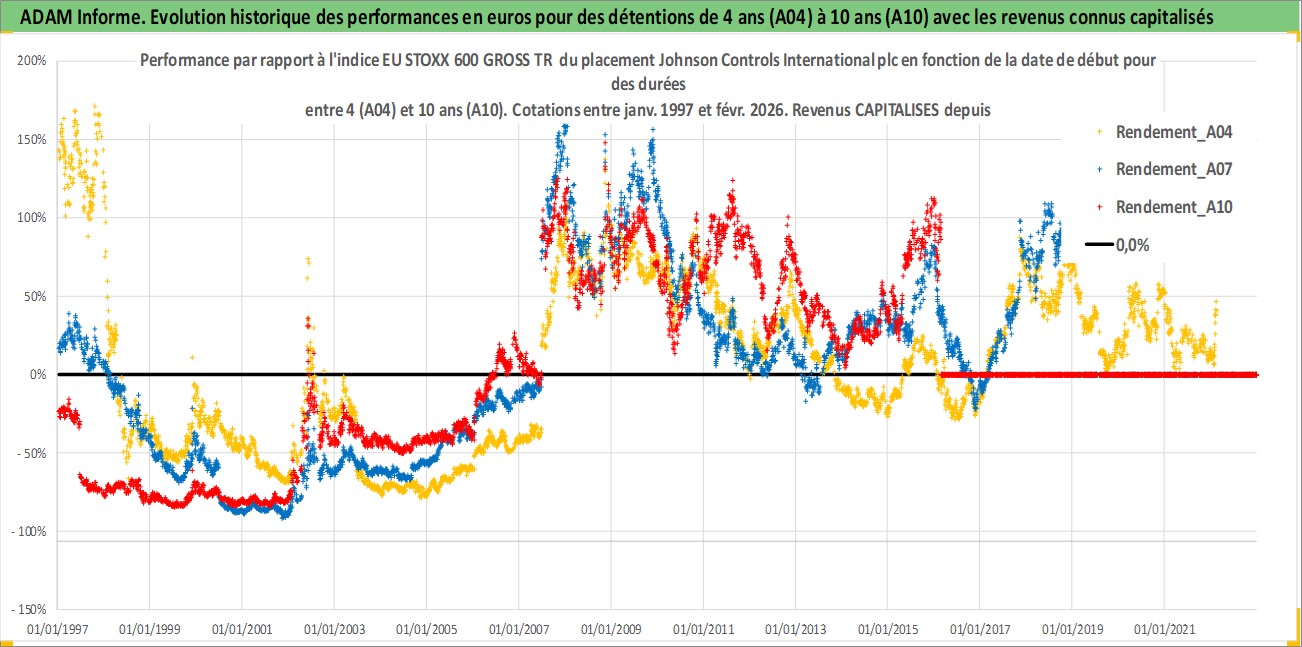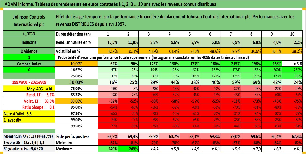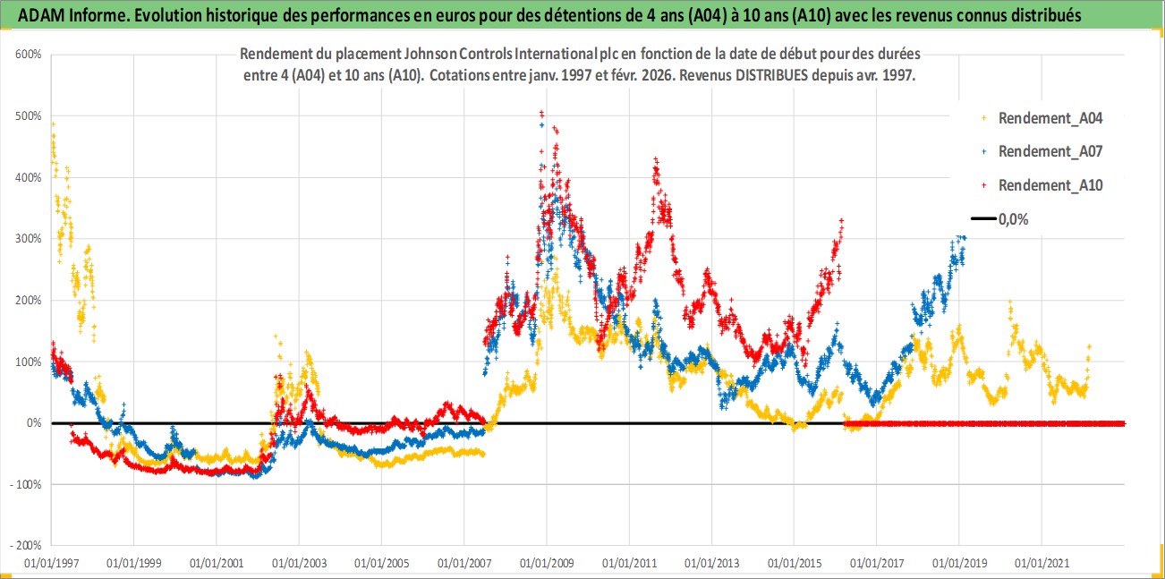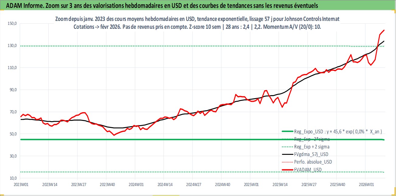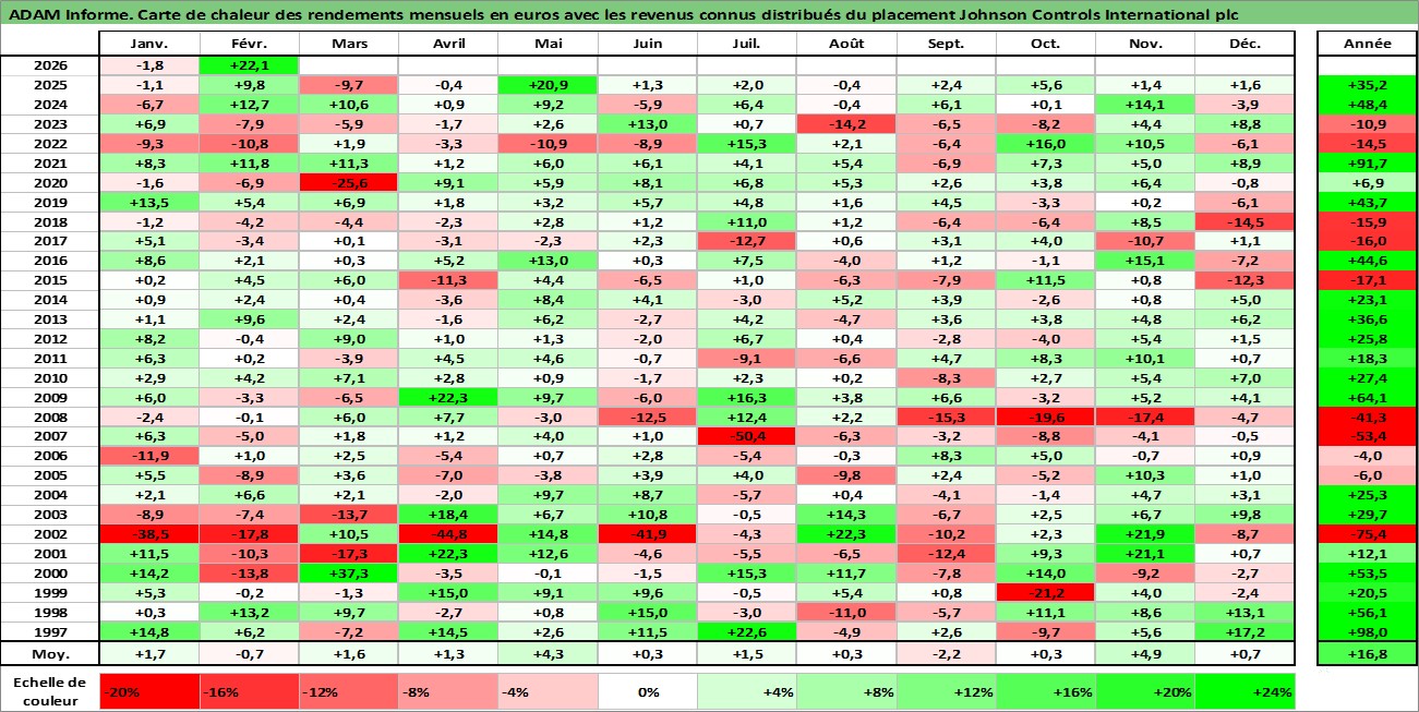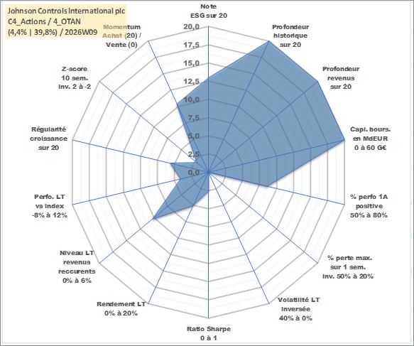 Site dédié aux investisseursPage dédiée sur site financeAnalyse des valorisations hebdomadaires de l'action Johnson Controls International plc. Cet actif est cote en USD. Les valorisations sont en contrevaleur EURO et couvrent les semaines 1997W01 a 2026W09. Les revenus de cet actif financier sont pris en compte depuis la semaine 1997W14. La note globale ESG de cet actif est estimee a 13.0 (apres rebasage entre 0 et 20).