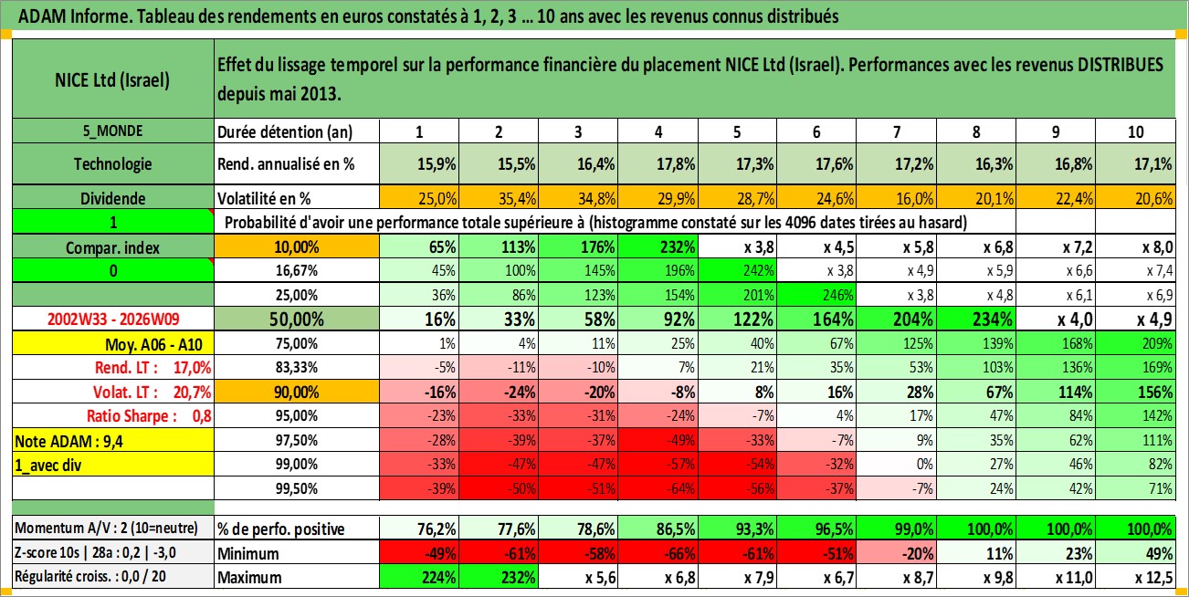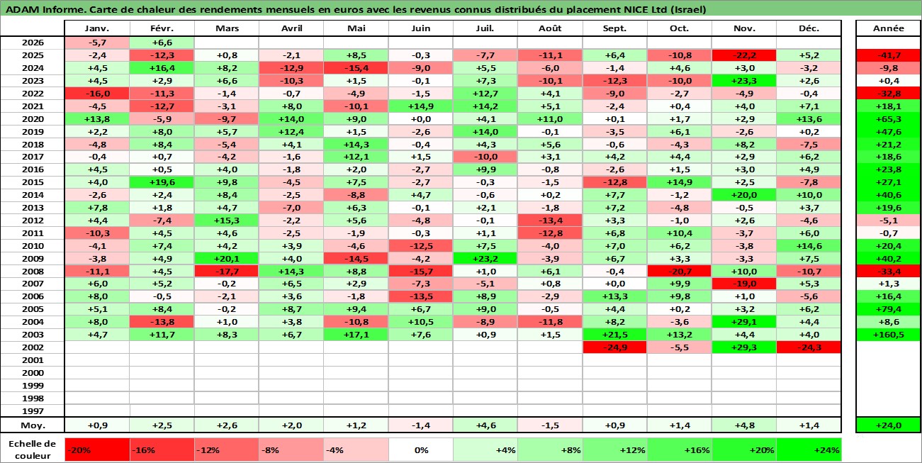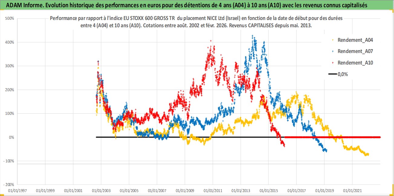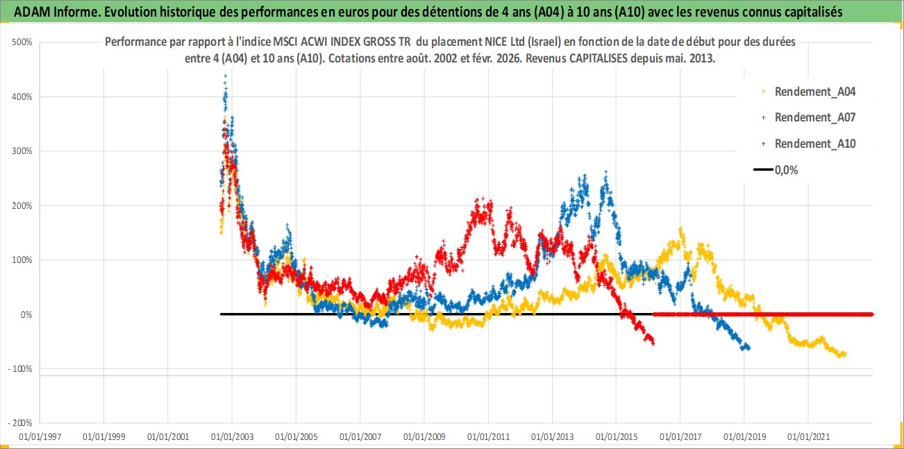 Site dédié aux investisseursPage dédiée sur site financeAnalyse des valorisations hebdomadaires de l'action NICE Ltd (Israel). Cet actif est cote en ILA. Les valorisations sont en contrevaleur EURO et couvrent les semaines 2002W33 a 2026W09. Les revenus de cet actif financier sont pris en compte depuis la semaine 2013W21. La note ESG de cet actif n'est pas connue.