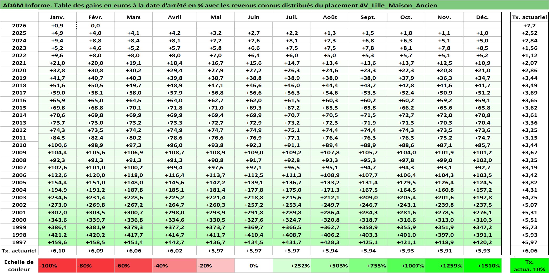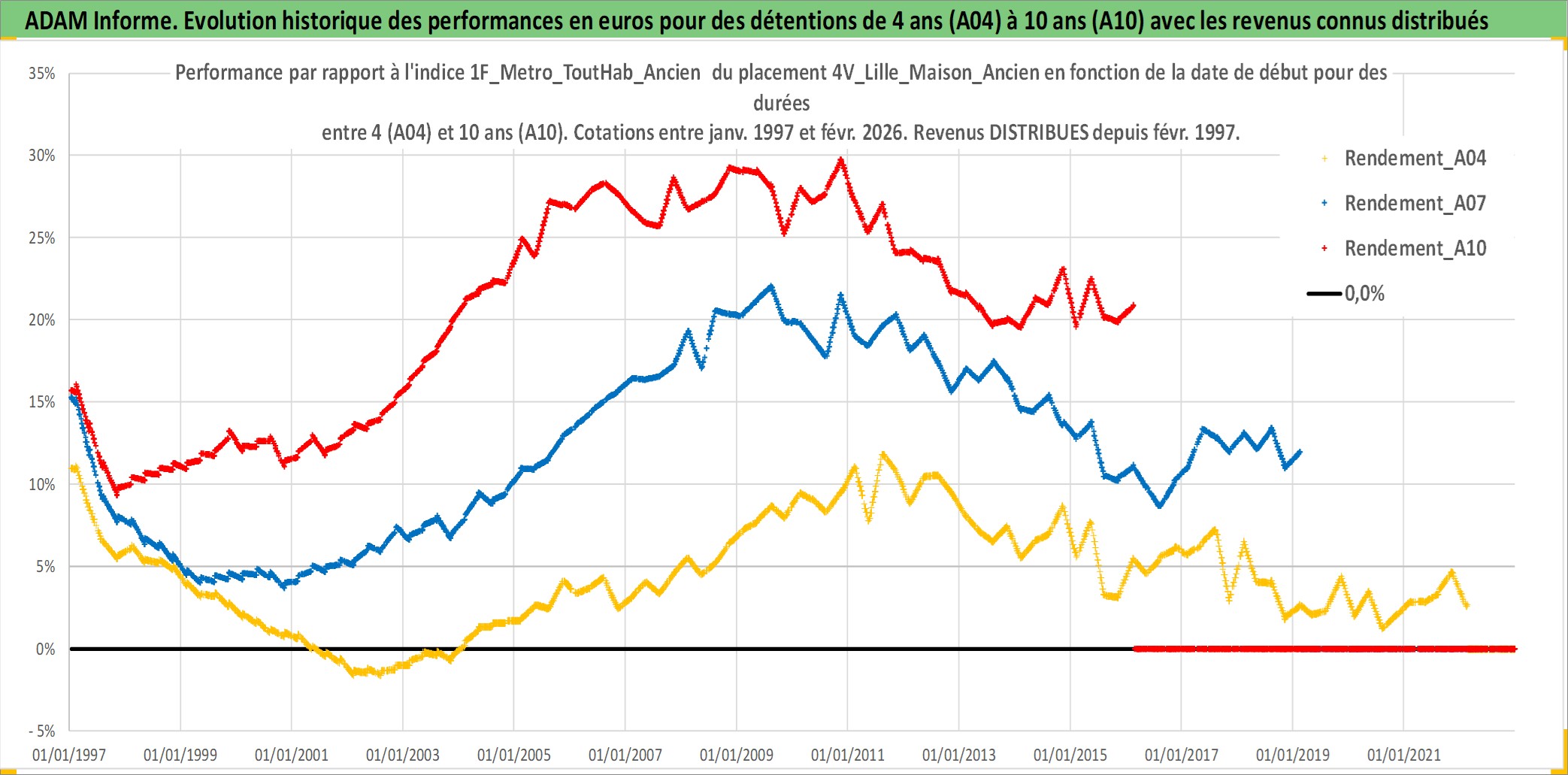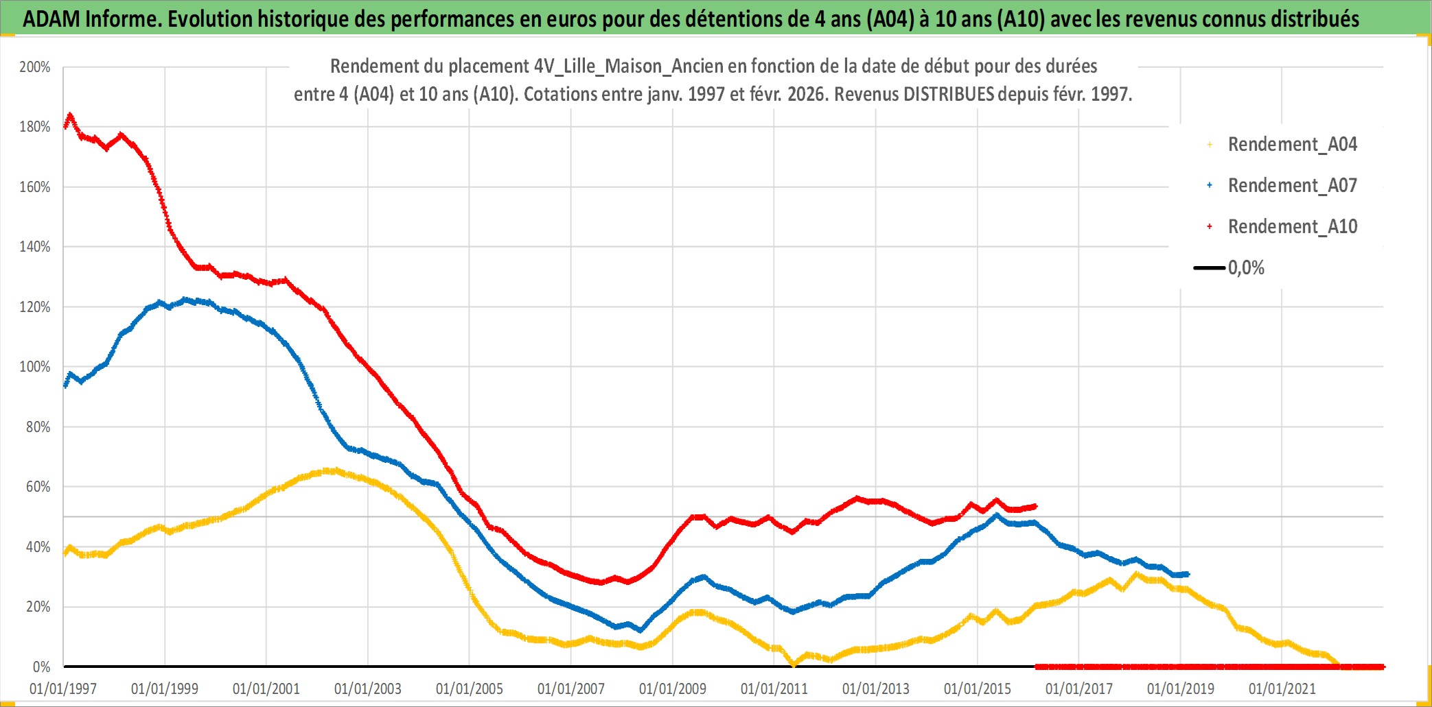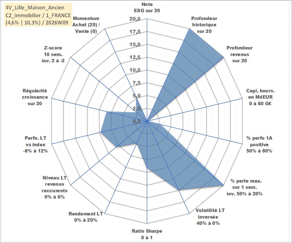 Site dédié aux investisseursPage dédiée sur site financeAnalyse des valorisations hebdomadaires de l'actif 4V_Lille_Maison_Ancien. Cet actif est cote en EUR. Les valorisations couvrent les semaines 1997W01 a 2026W09. Les loyers de cet actif immobilier sont pris egaux a 3,33% annuels de la valeur venale du logement.