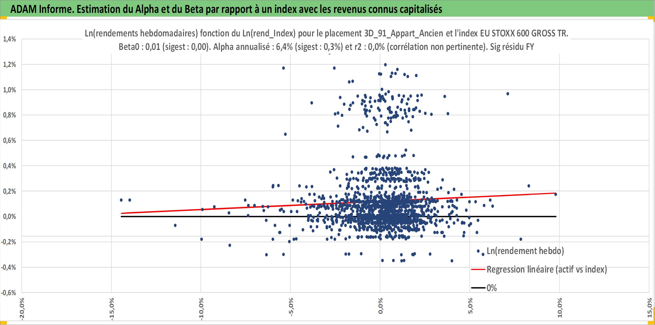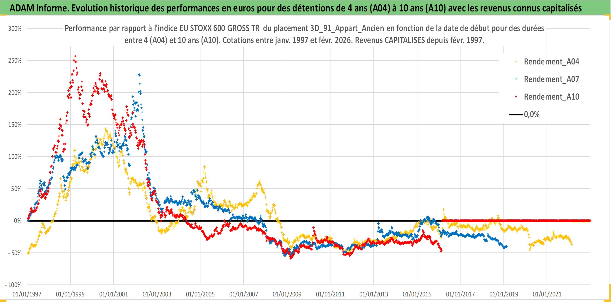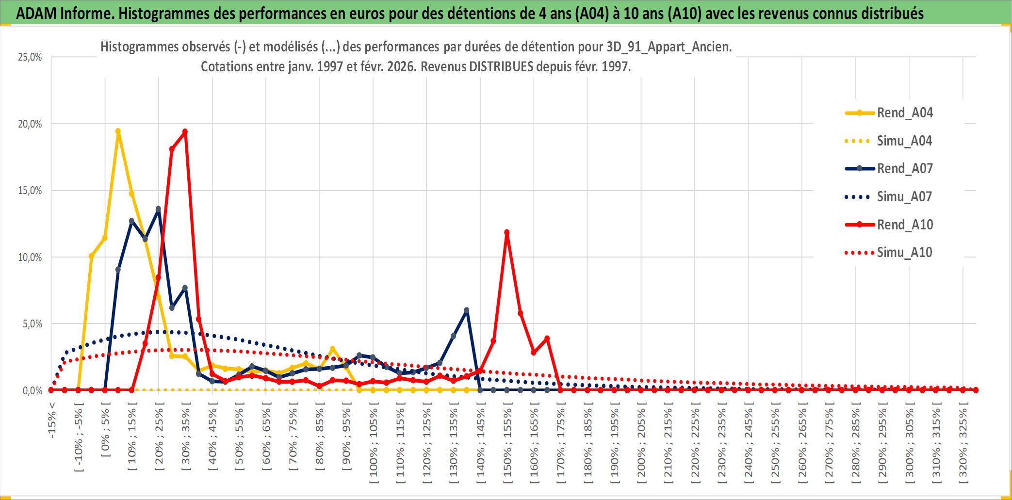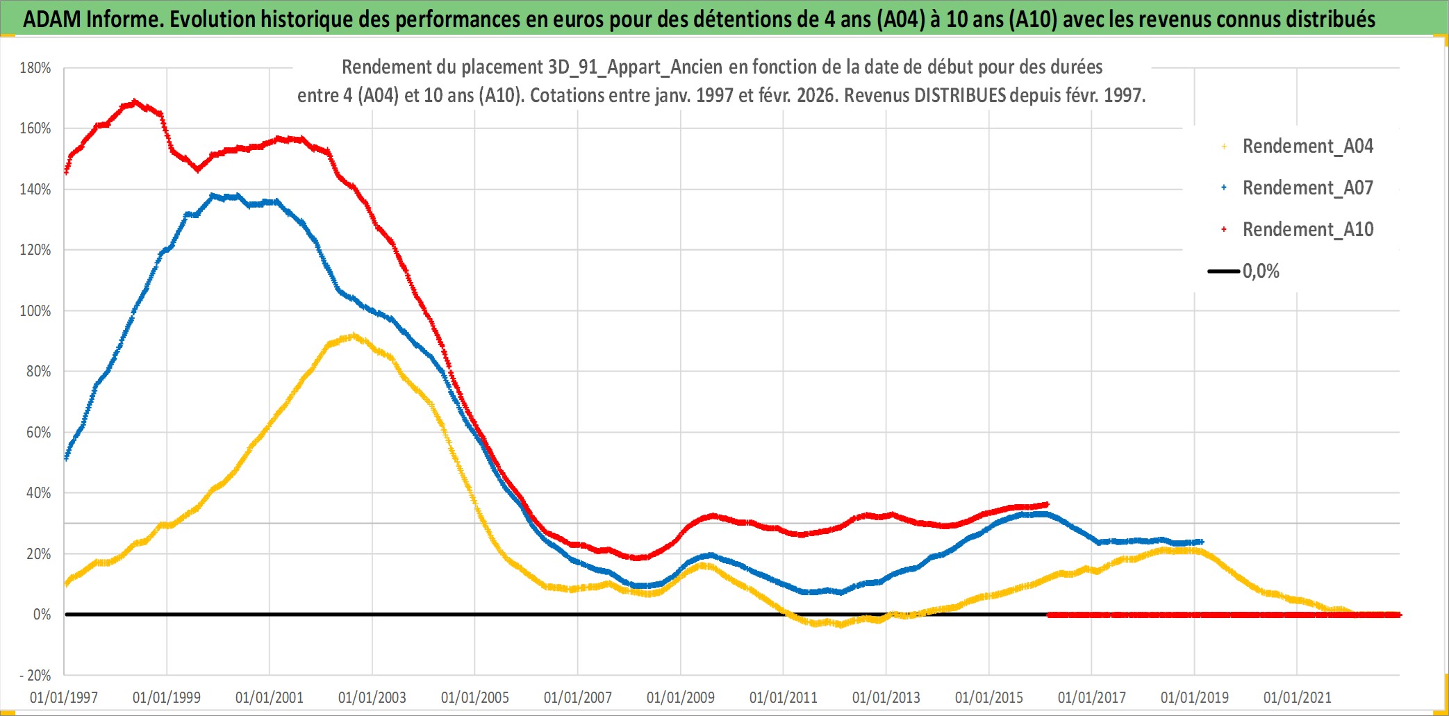 Site dédié aux investisseursPage dédiée sur site financeAnalyse des valorisations hebdomadaires de l'actif 3D_91_Appart_Ancien. Cet actif est cote en EUR. Les valorisations couvrent les semaines 1997W01 a 2026W09. Les loyers de cet actif immobilier sont pris egaux a 3,33% annuels de la valeur venale du logement.