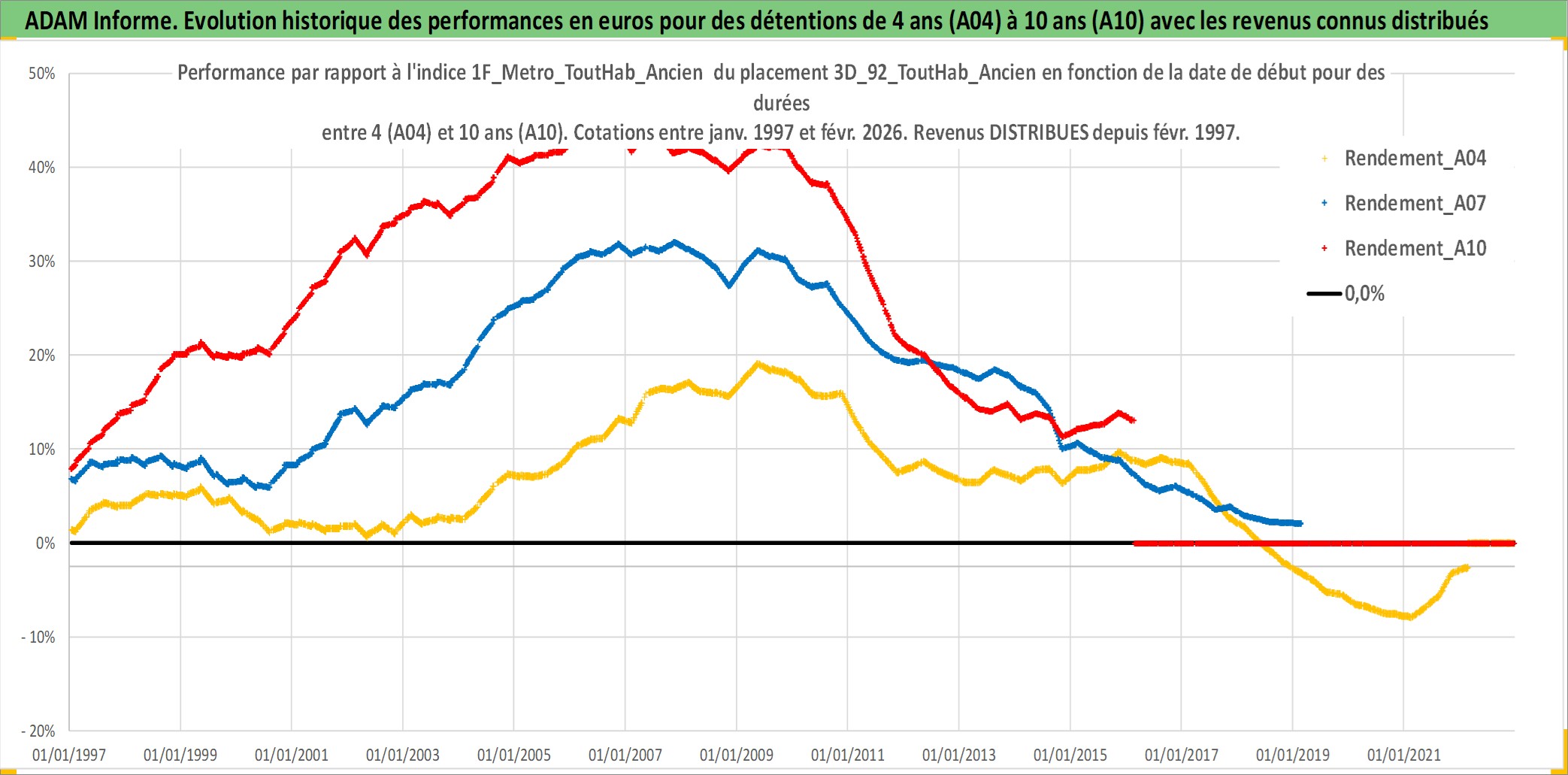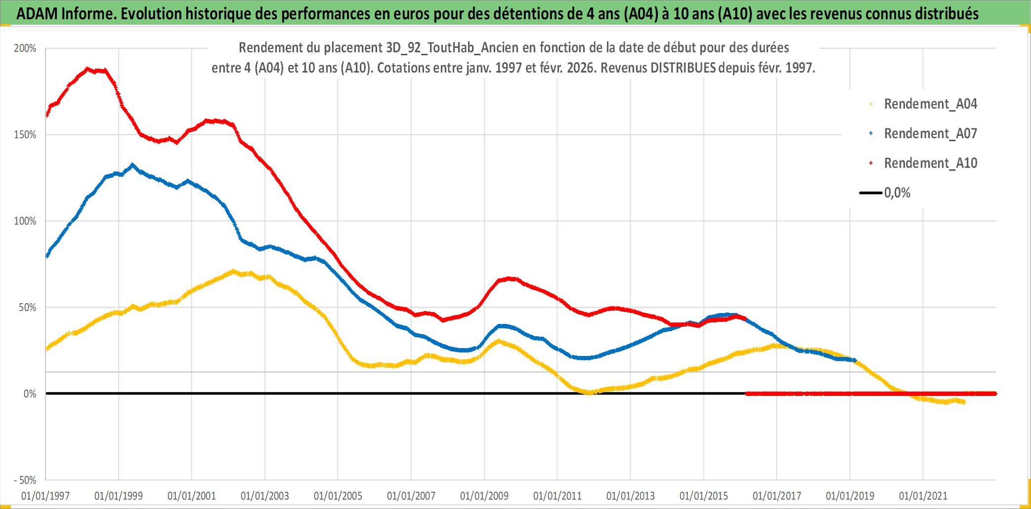 Site dédié aux investisseursPage dédiée sur site financeAnalyse des valorisations hebdomadaires de l'actif 3D_92_ToutHab_Ancien. Cet actif est cote en EUR. Les valorisations couvrent les semaines 1997W01 a 2026W09. Les loyers de cet actif immobilier sont pris egaux a 3,33% annuels de la valeur venale du logement.