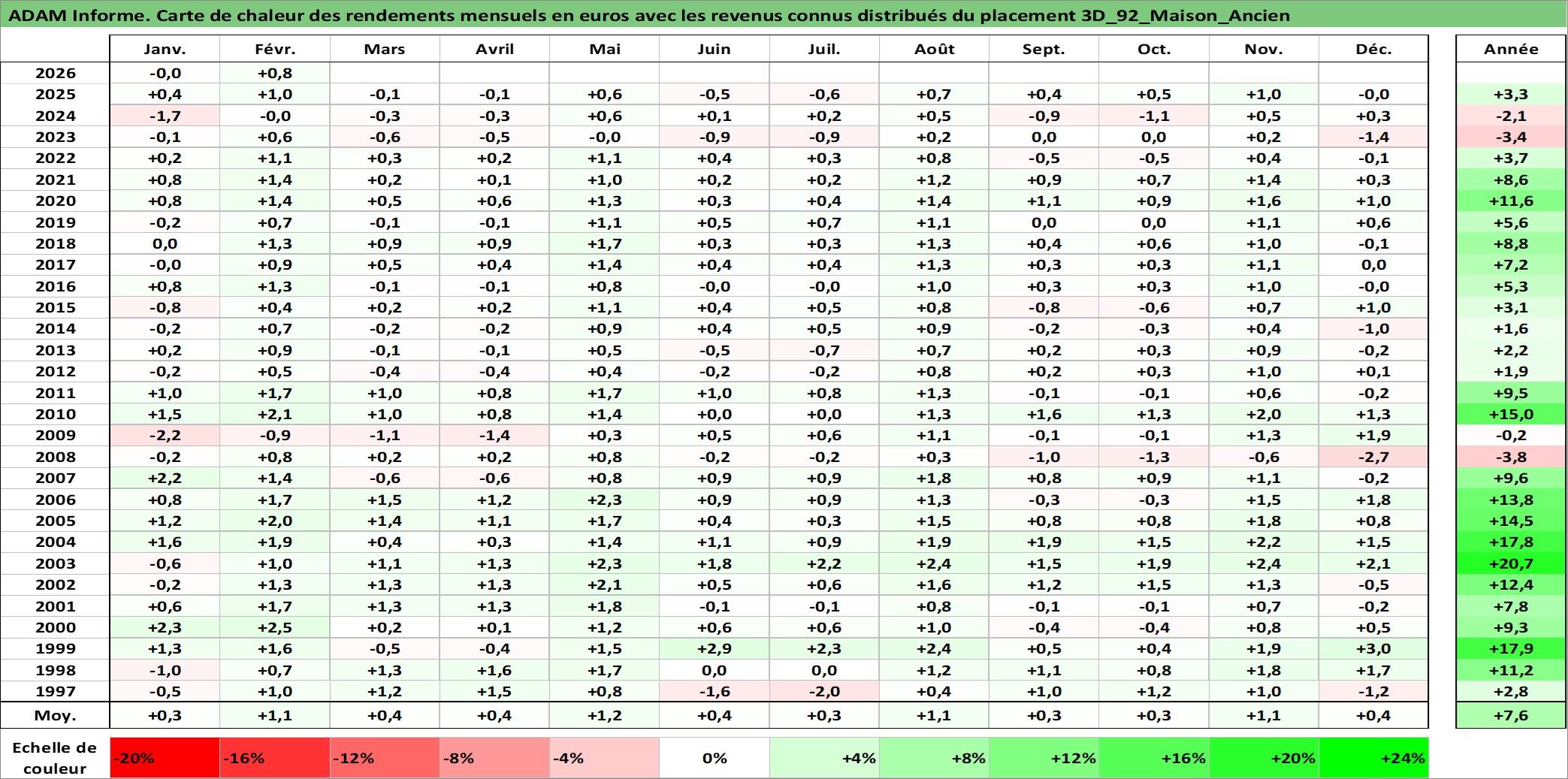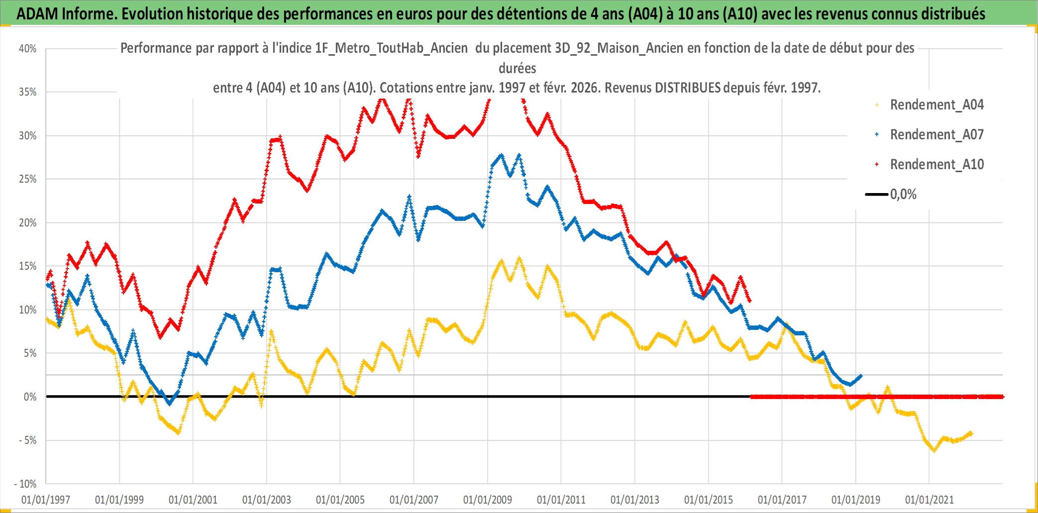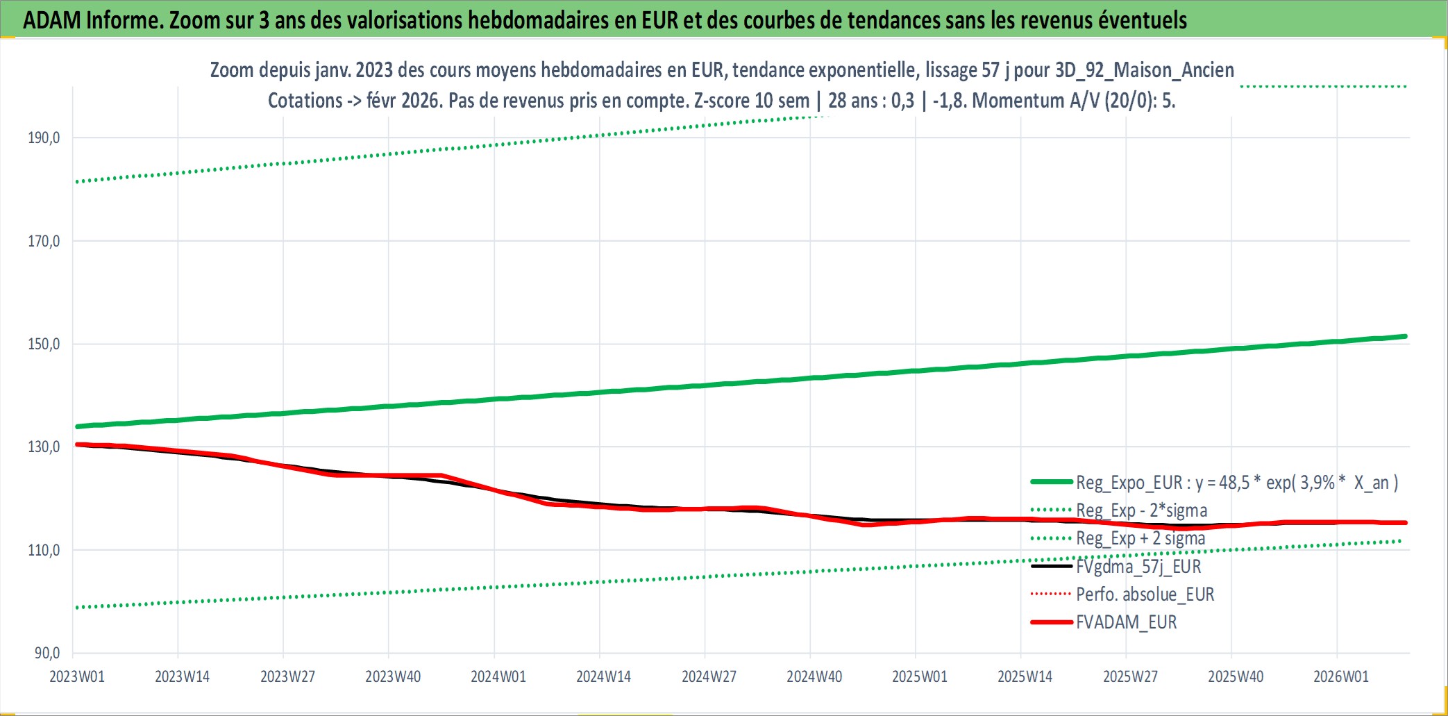 Site dédié aux investisseursPage dédiée sur site financeAnalyse des valorisations hebdomadaires de l'actif 3D_92_Maison_Ancien. Cet actif est cote en EUR. Les valorisations couvrent les semaines 1997W01 a 2026W09. Les loyers de cet actif immobilier sont pris egaux a 3,33% annuels de la valeur venale du logement.